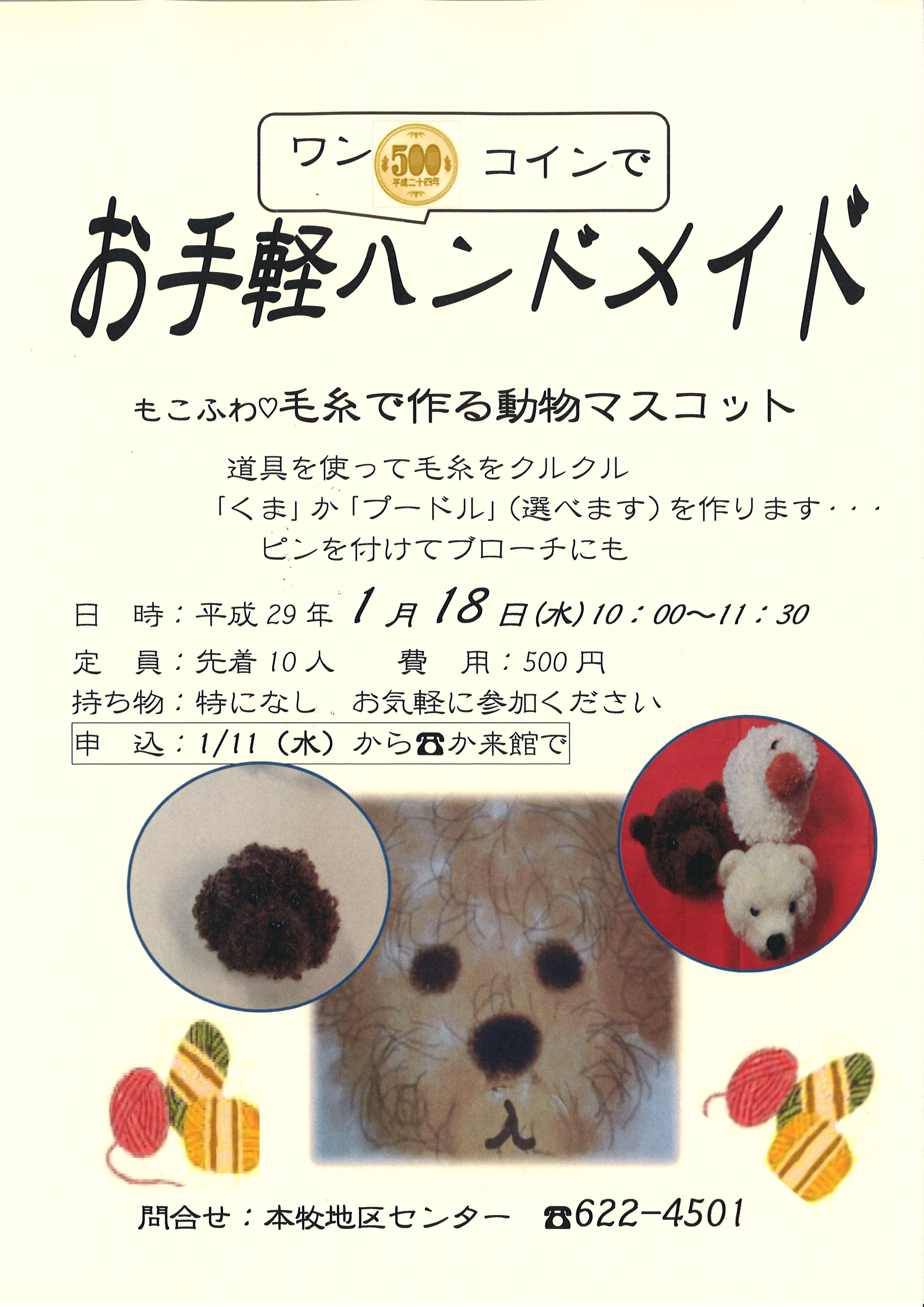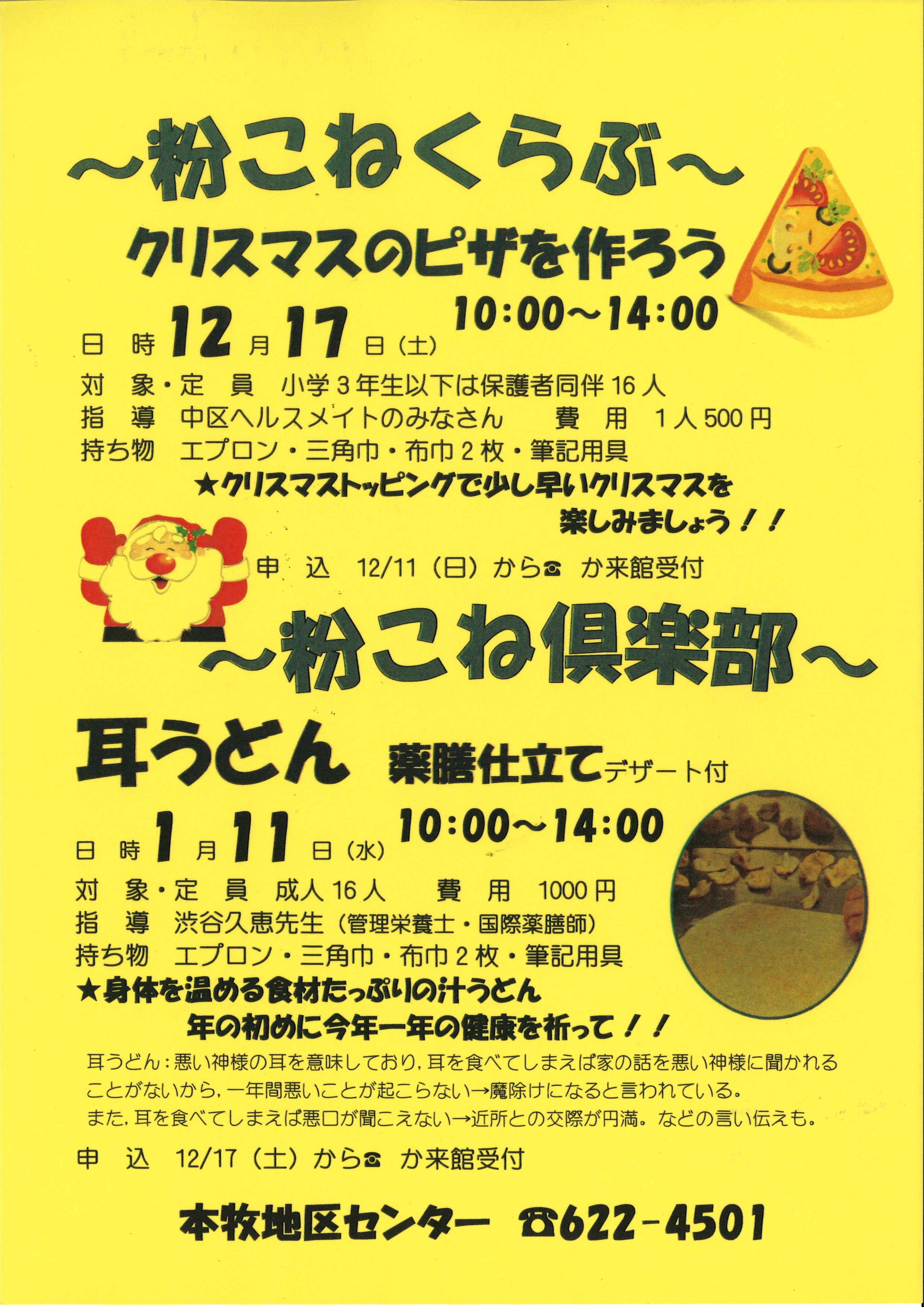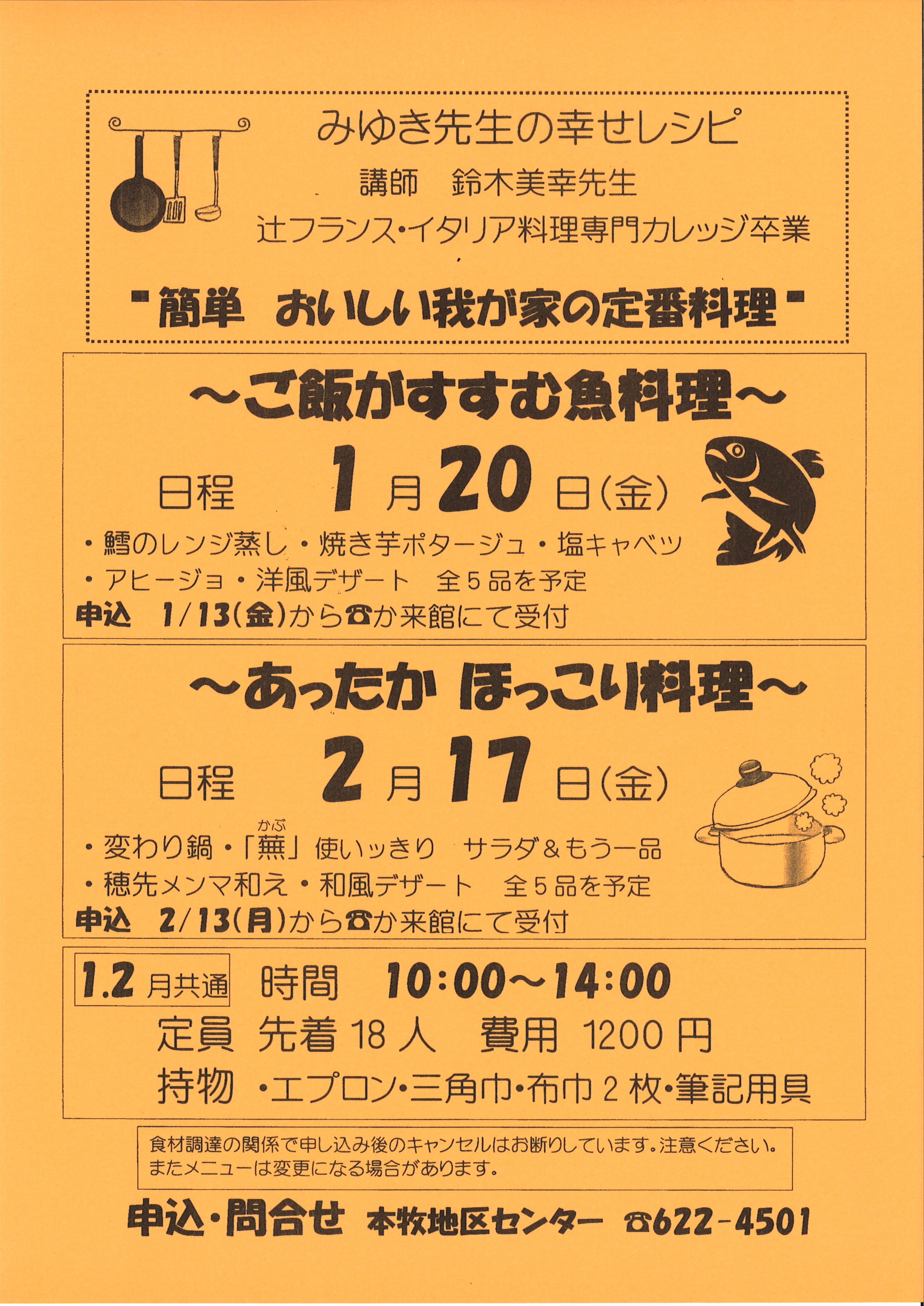 - 持ち物:エプロン・三角巾・布巾2枚・筆記用具