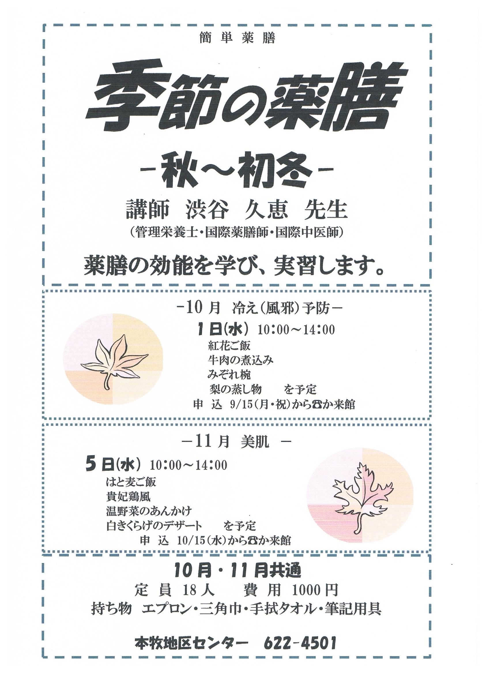 - 持ち物:エプロン・三角巾・手拭タオル・筆記用具
