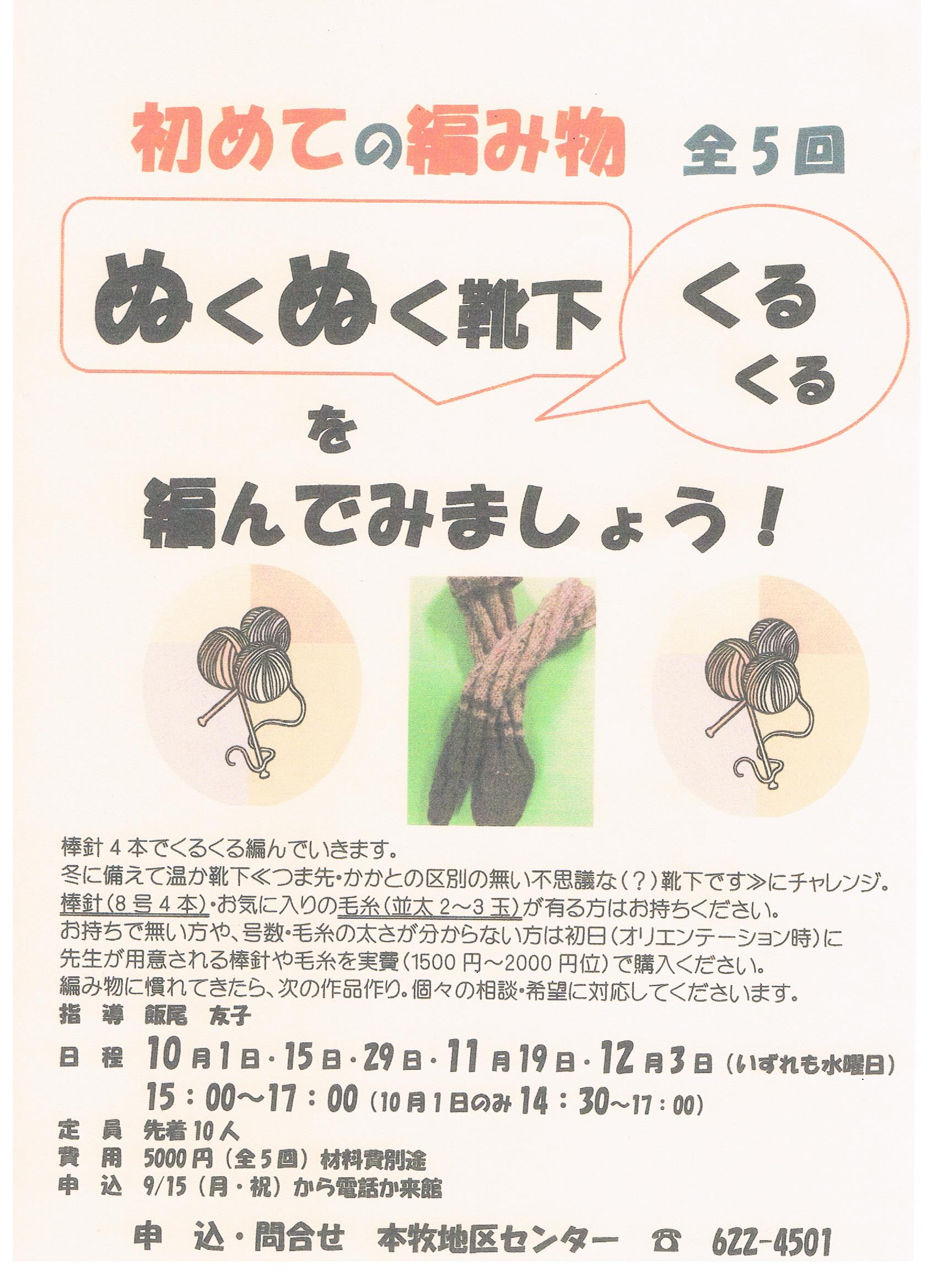 初日(オリエンテーション時)に先生が用意される棒針や毛糸を実費(1500円~2000円位)で購入ください。