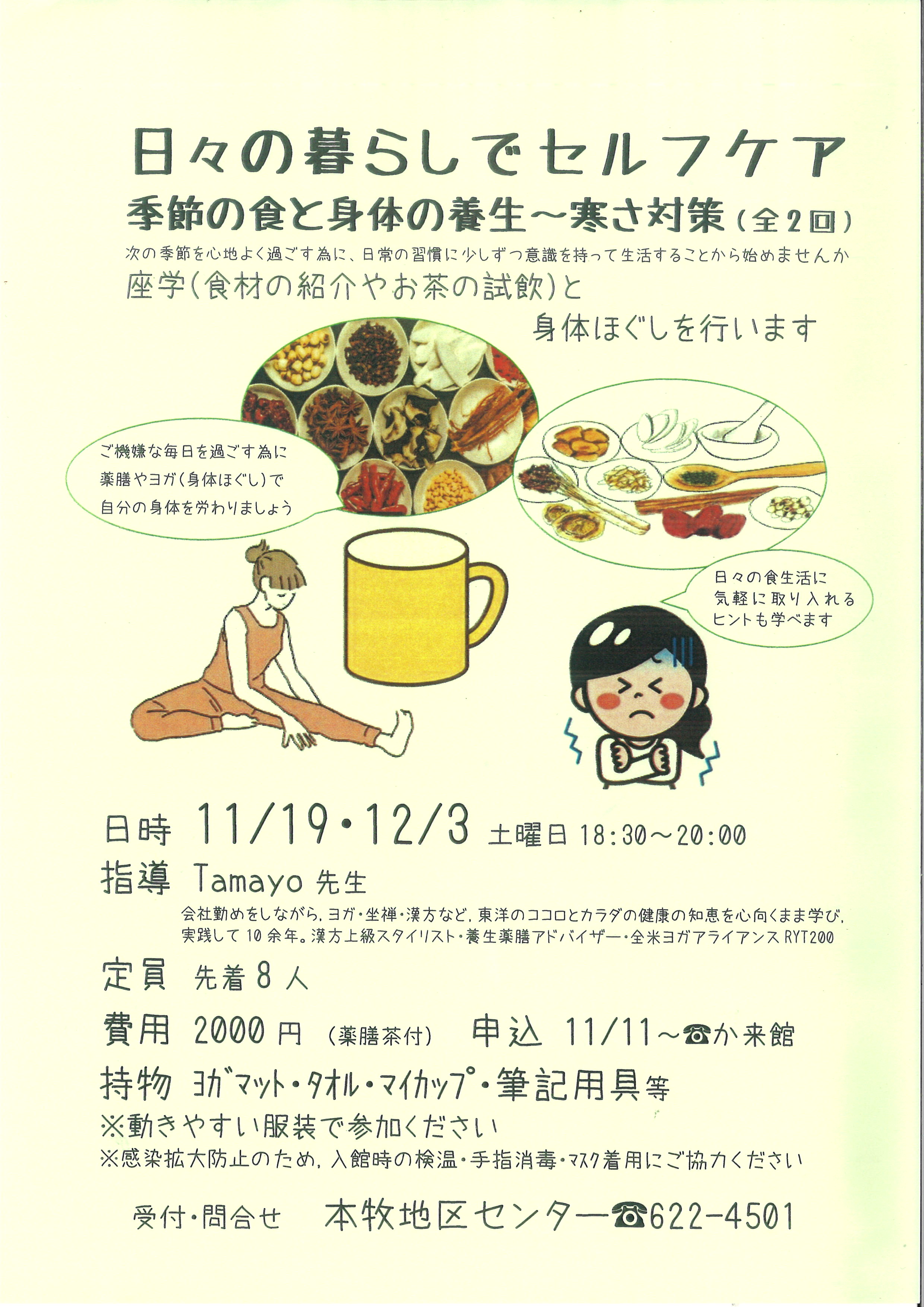 - 持物:ヨガマット(お持ちの方)・タオル・マイカップ・筆記用具