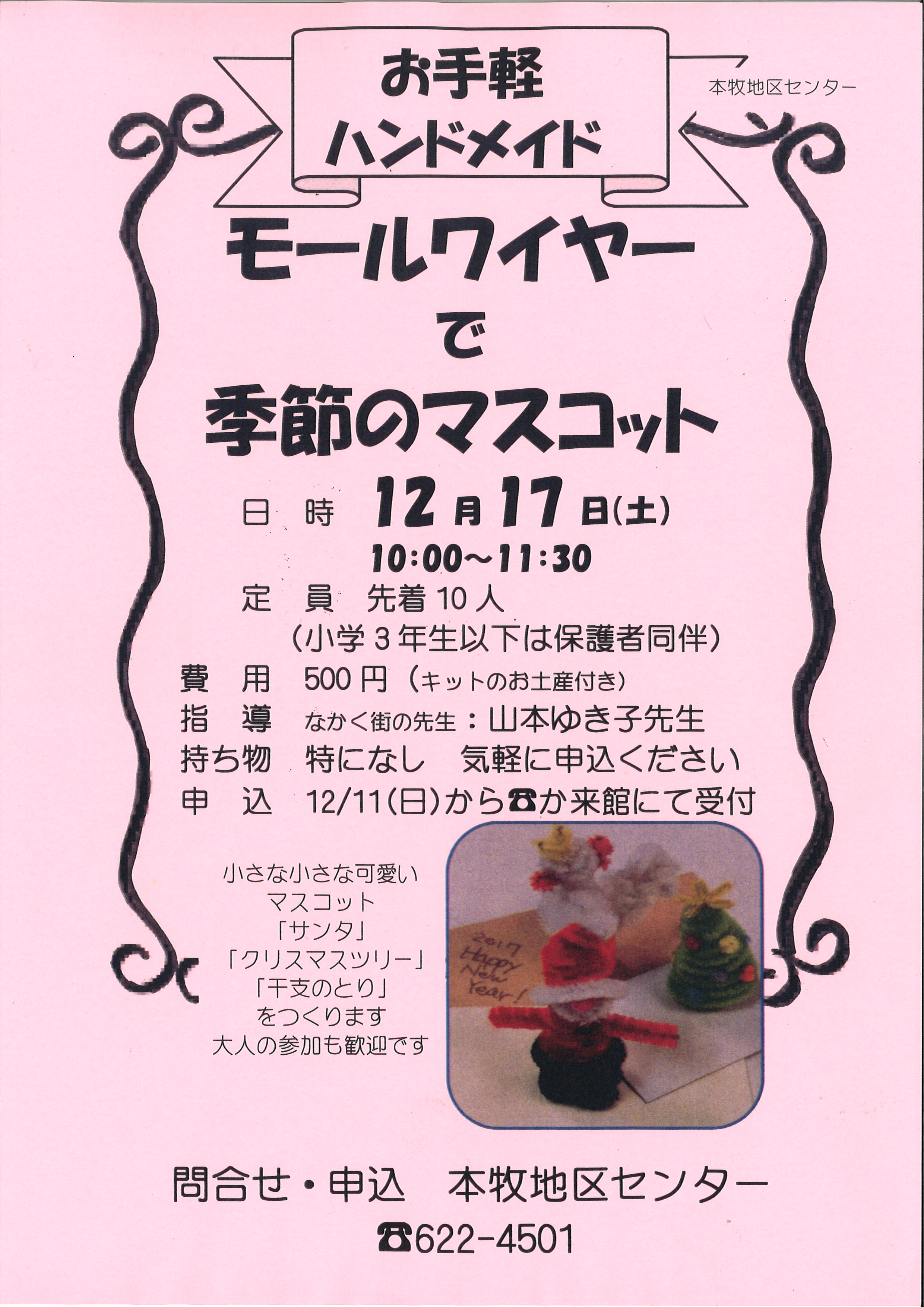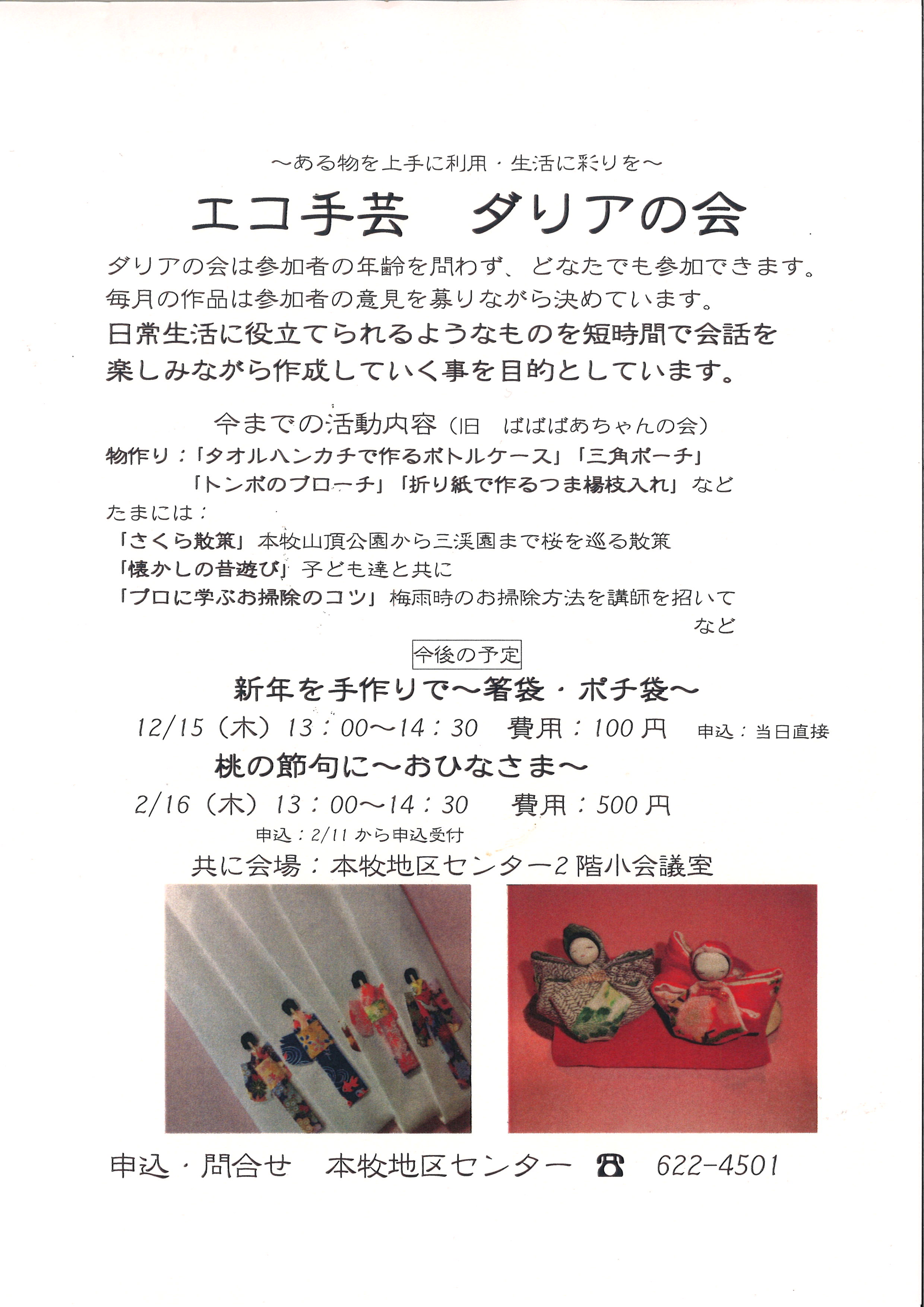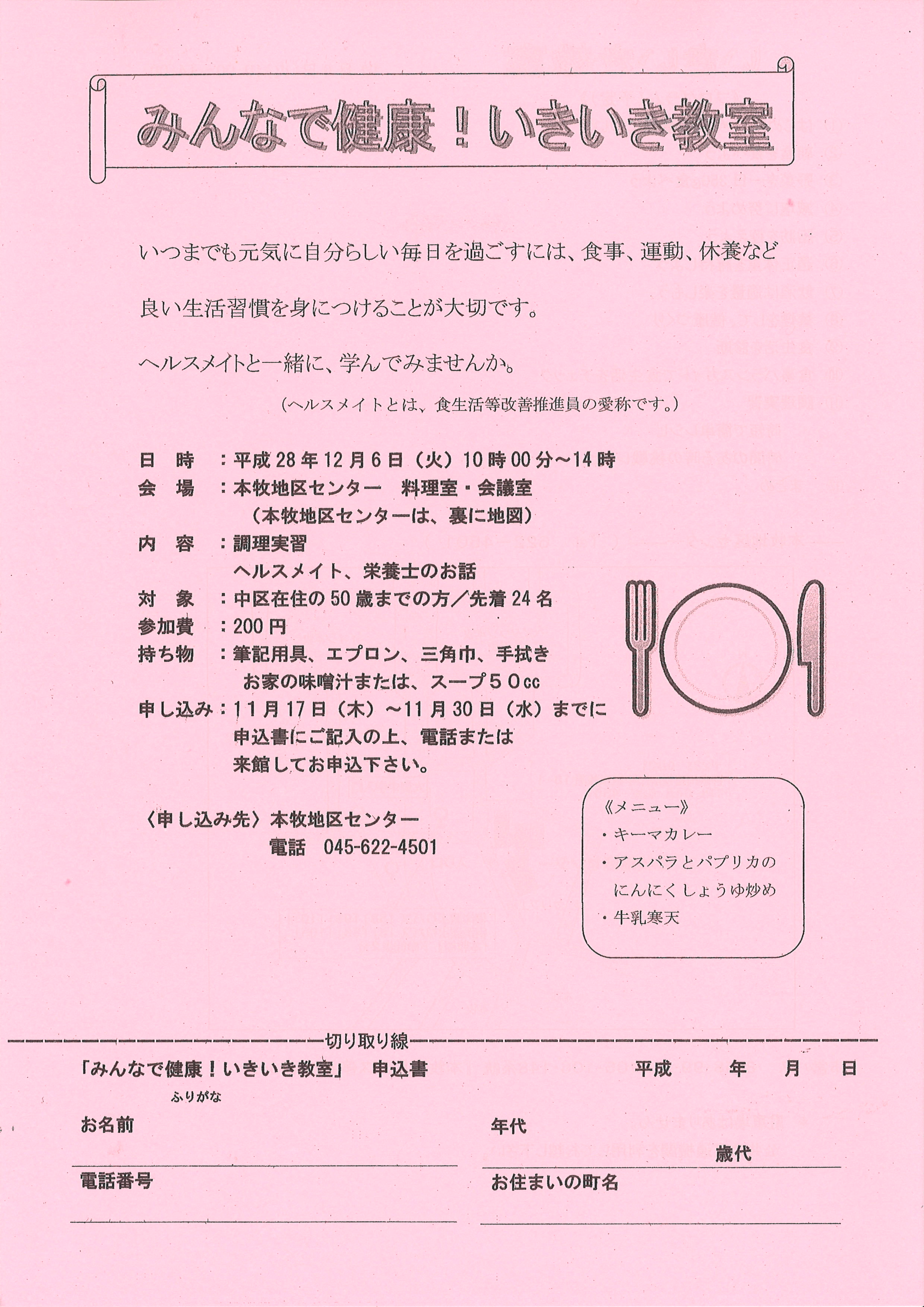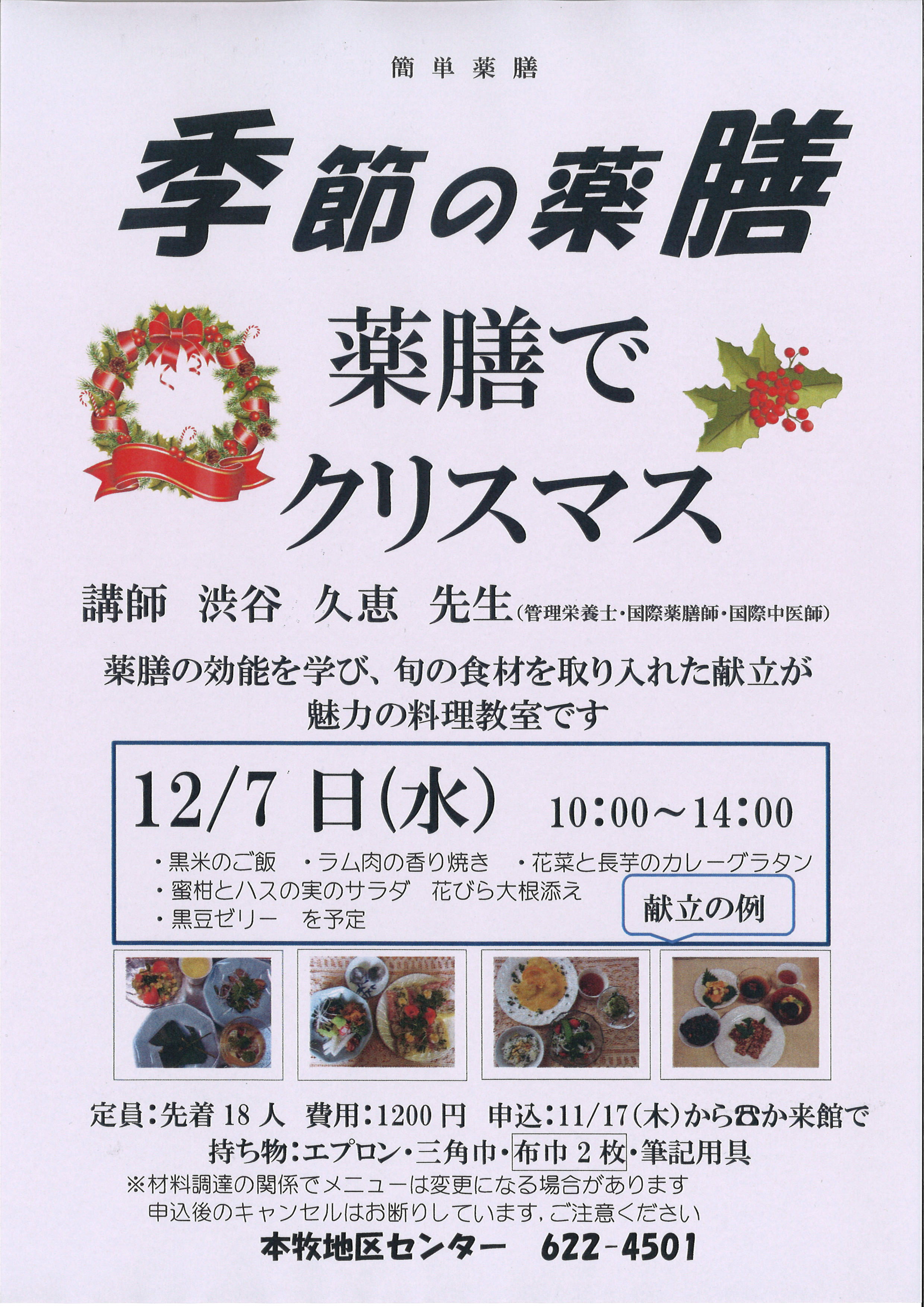 - 持ち物:エプロン・三角巾・布巾2枚・筆記用具