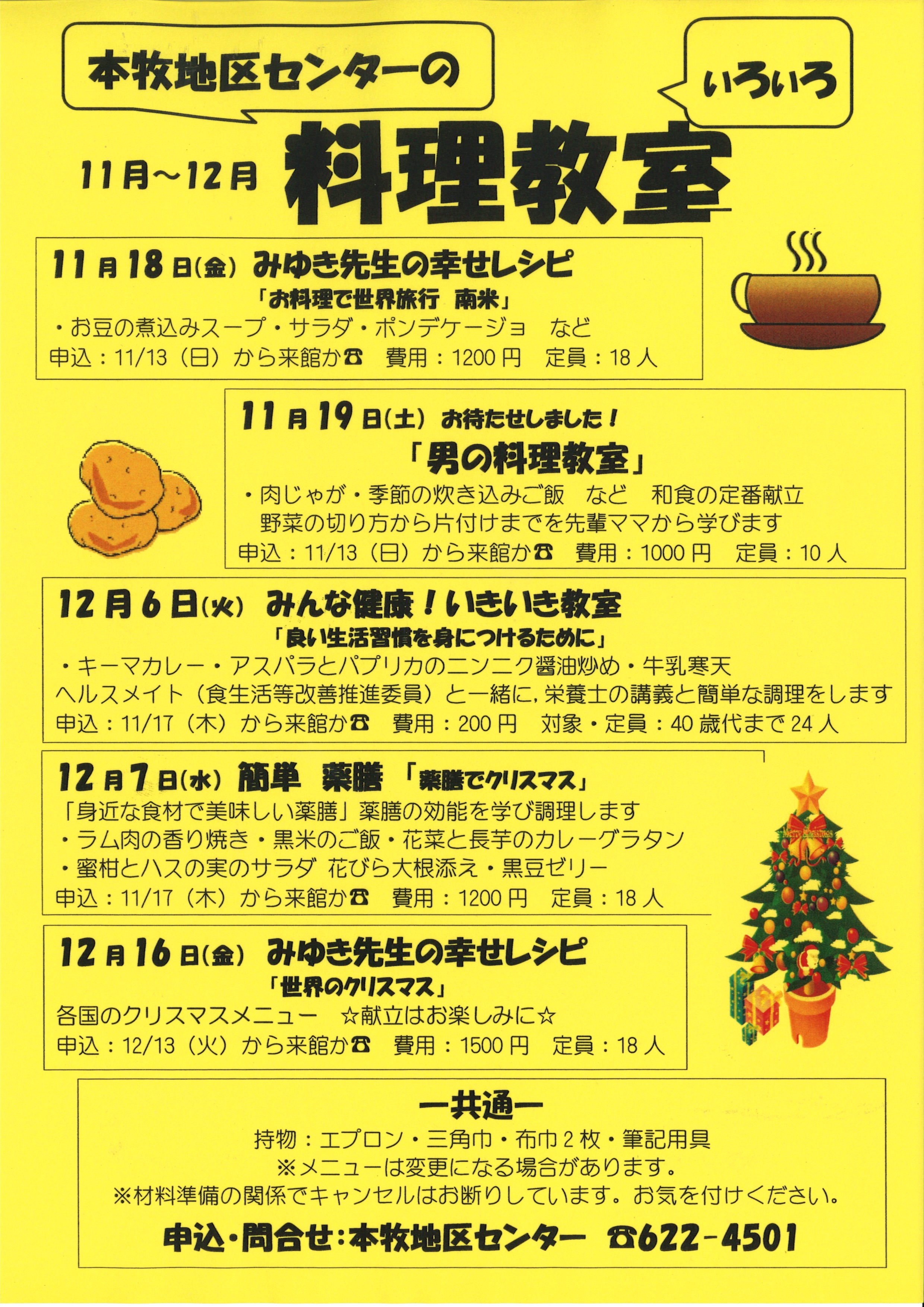 - 持ち物:エプロン・三角巾・手拭き・筆記用具