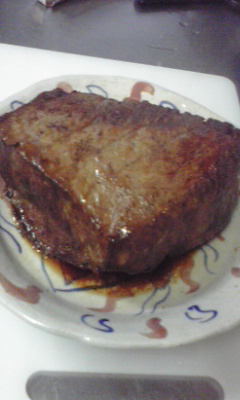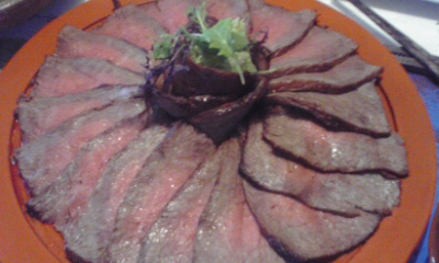 - 写真は、焼きあがったローストビーフ塊とスライスして盛り付けたもの