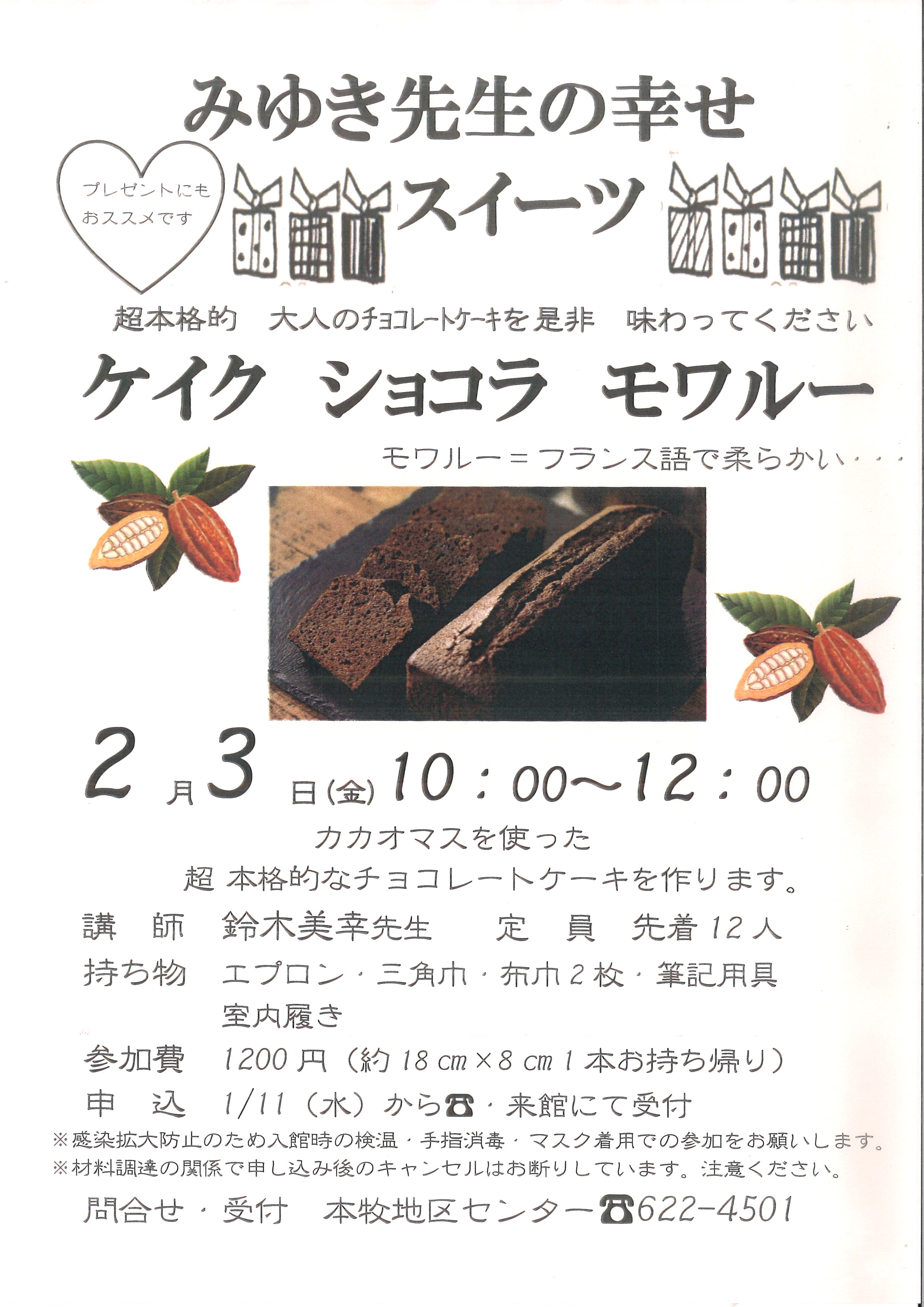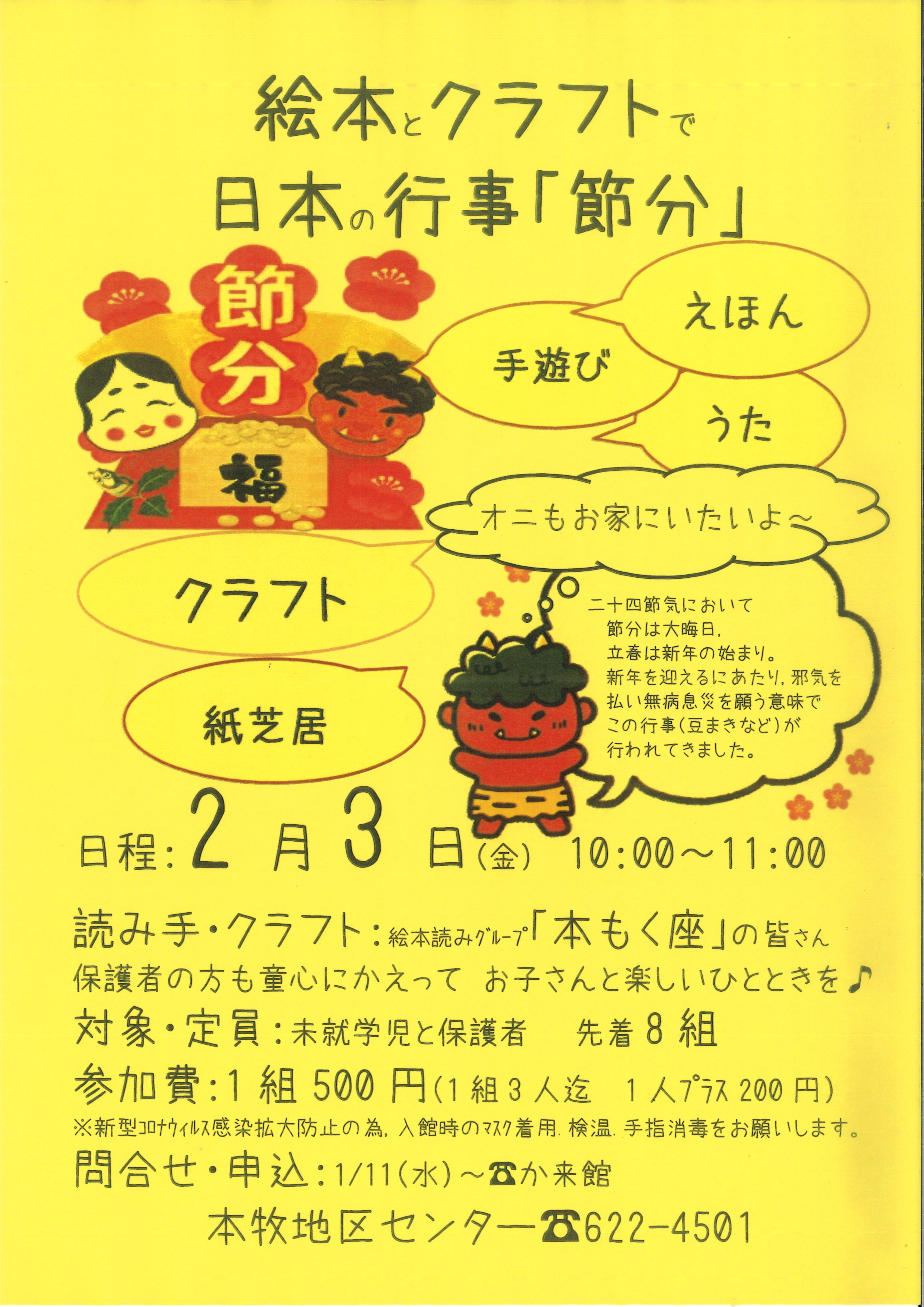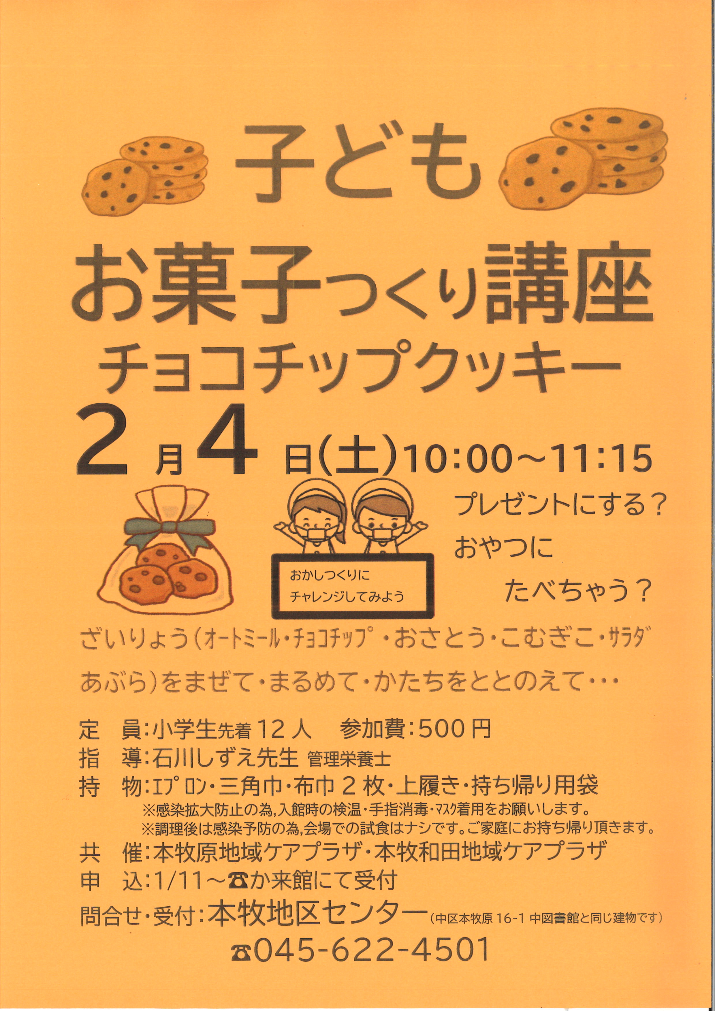 - 持物:エプロン・三角巾・布巾2枚・上履き・持帰り用袋