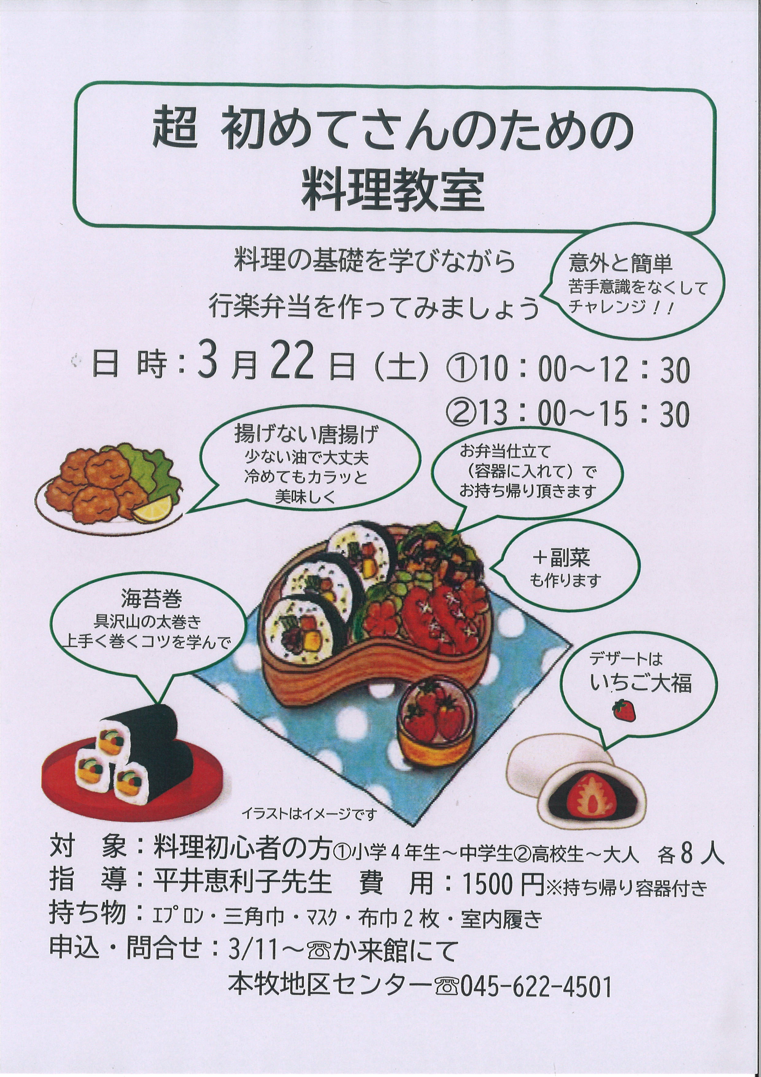 - 持ち物:エプロン・三角巾・マスク・布巾2枚