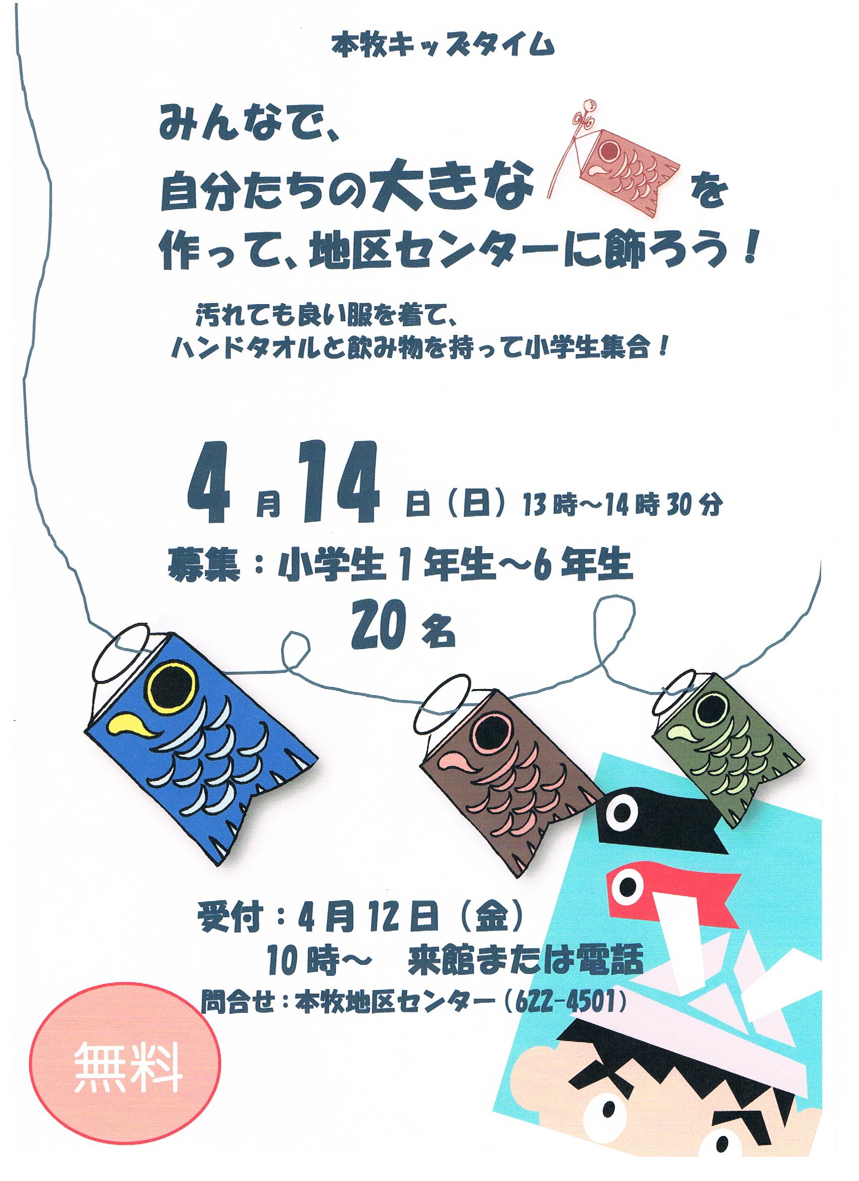 本牧キッズタイム「みんなで、自分たちの大きなこいのぼりを作って、地区センターに飾ろう!」