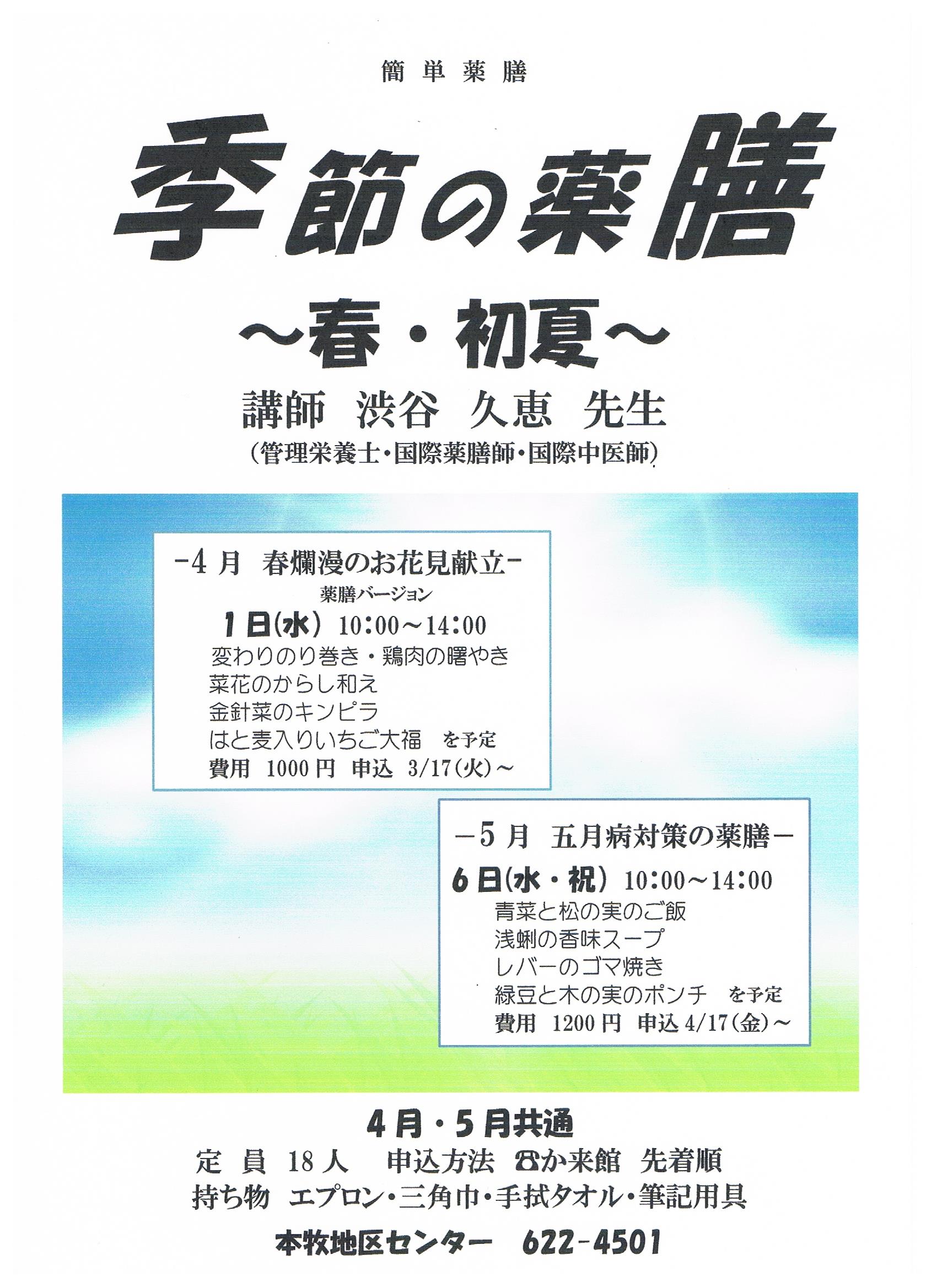 - 持ち物:エプロン・三角巾・手拭タオル・筆記用具