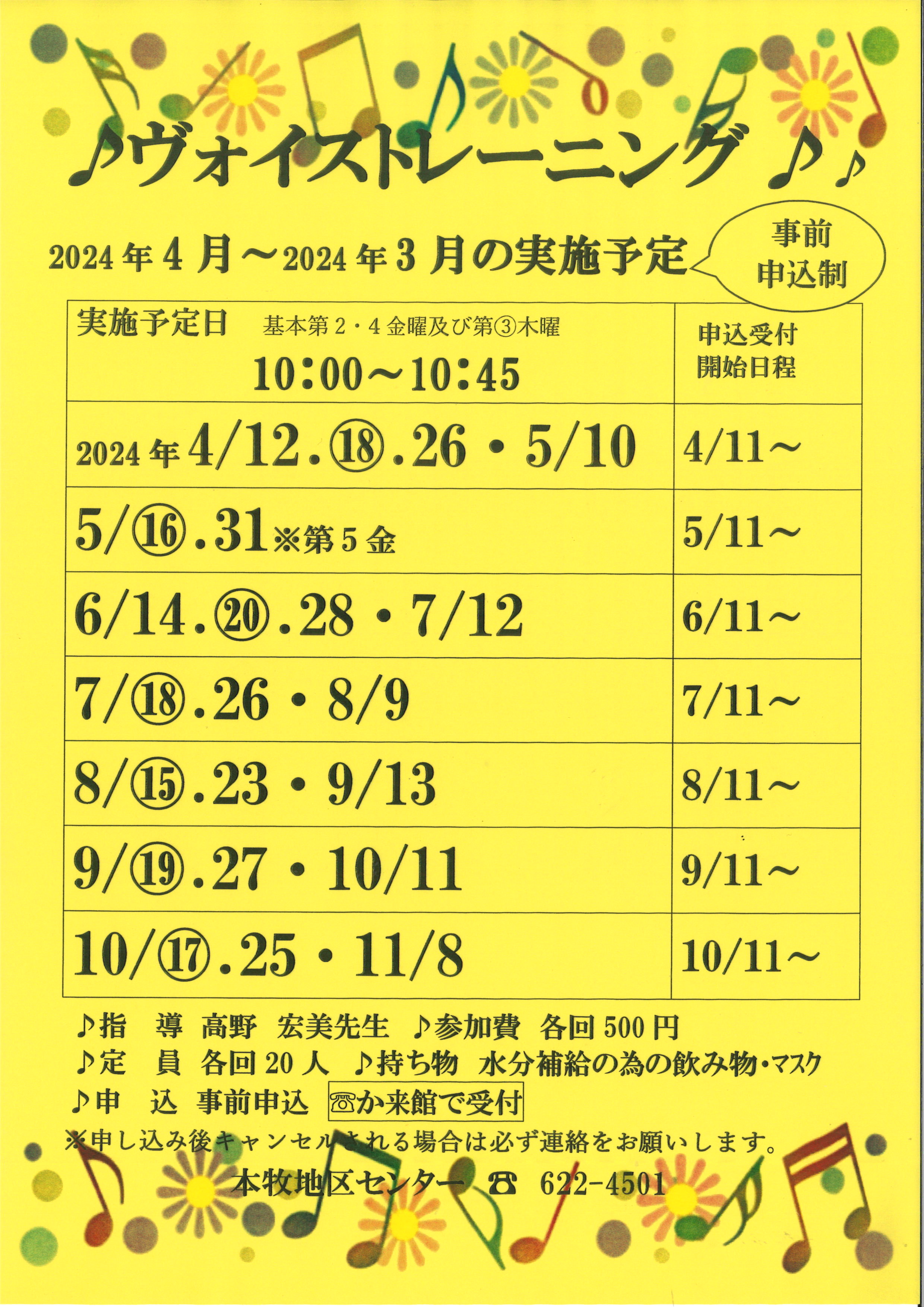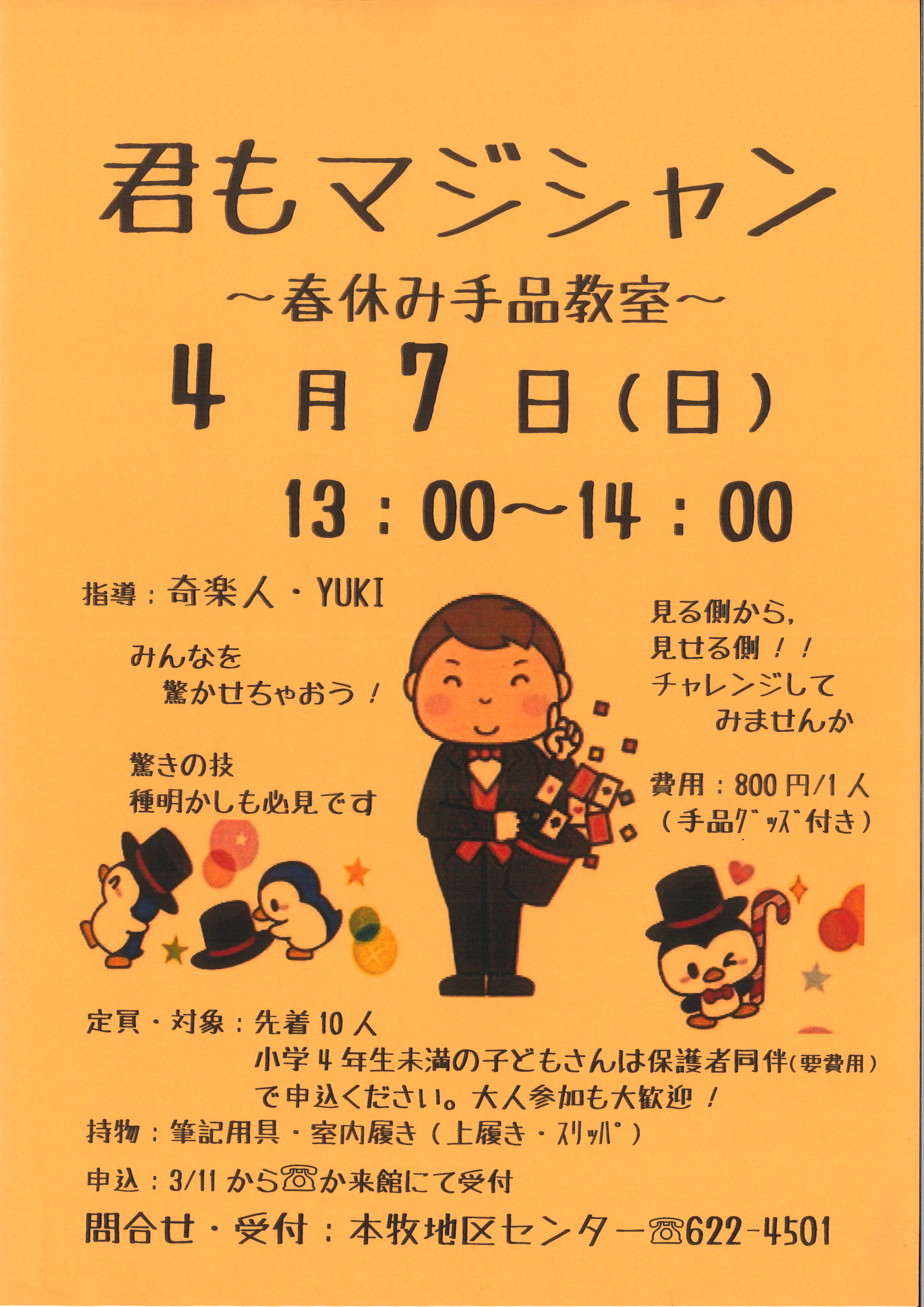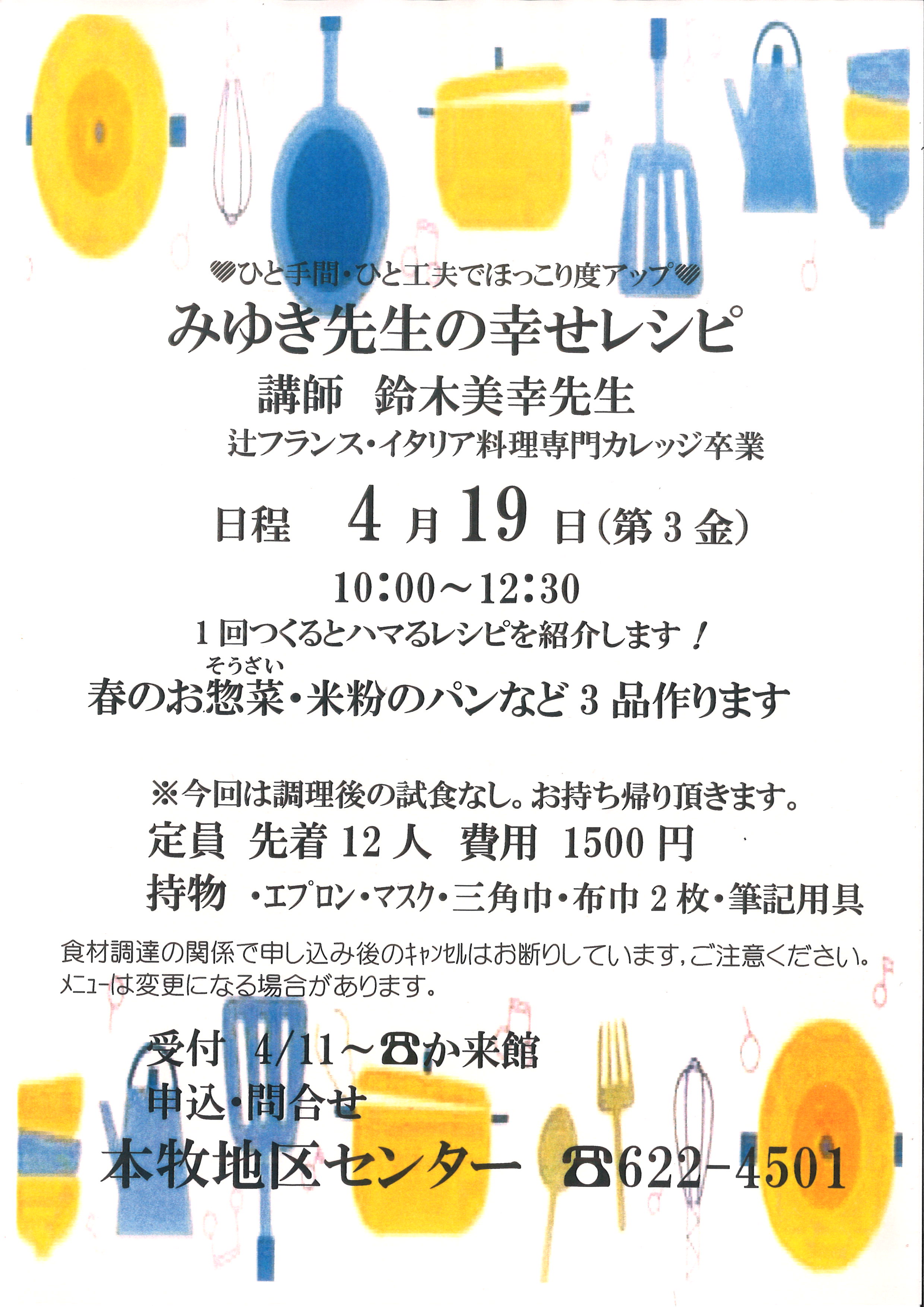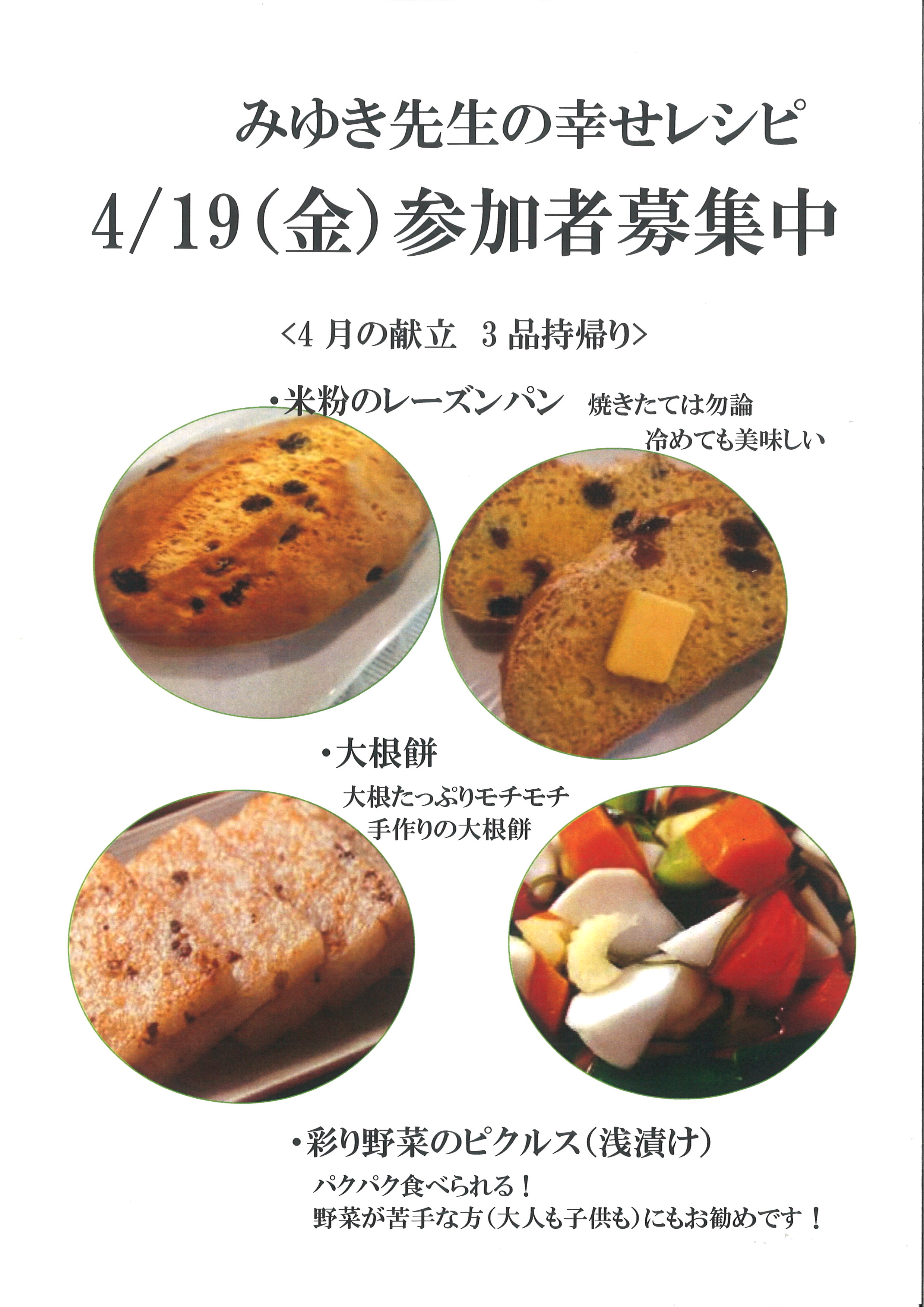 - 持ち物:エプロン・三角巾・マスク・布巾2枚・筆記用具