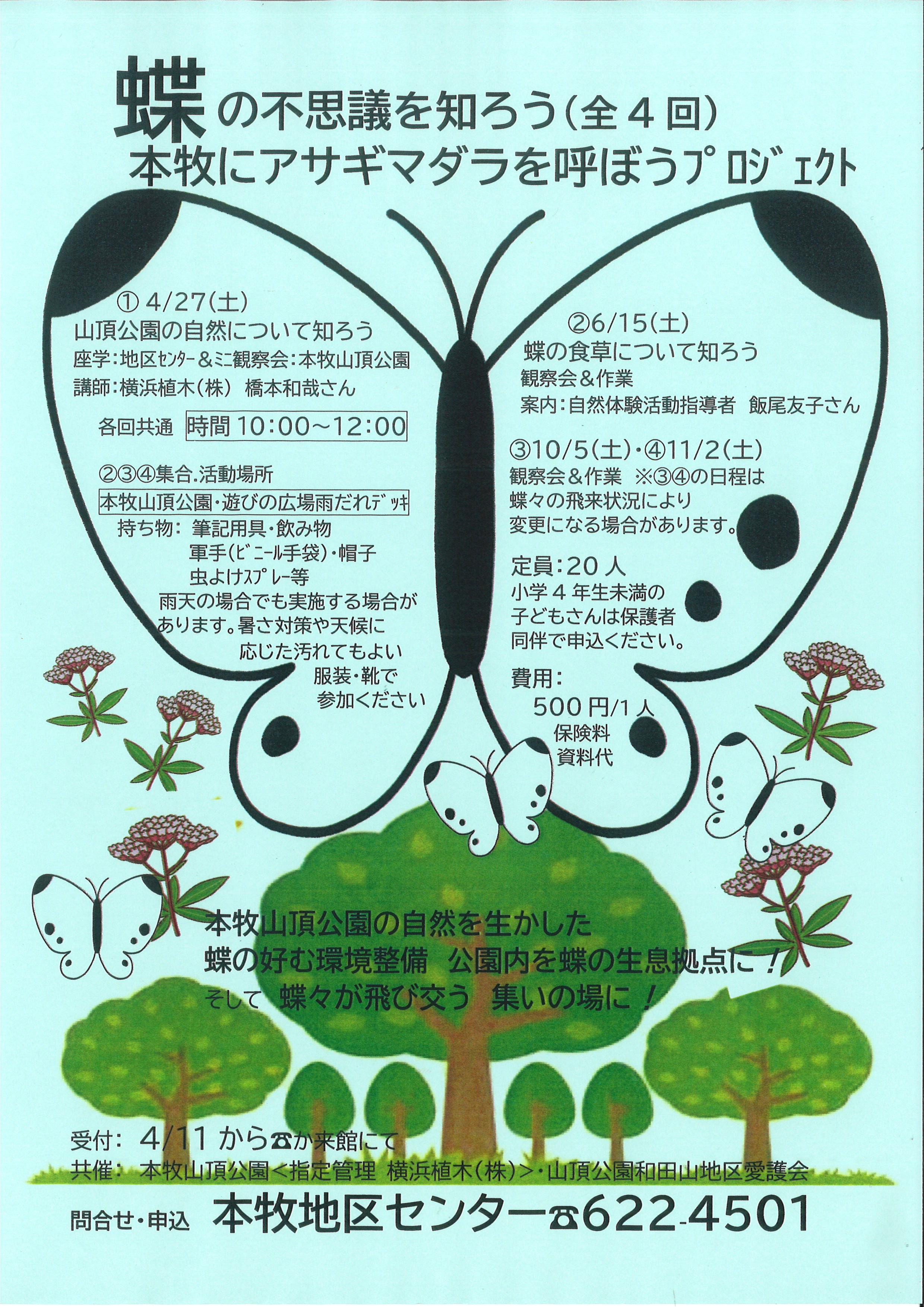 - ①4/27 山頂公園の自然について知ろう:座学(地区センター)&ミニ観察会(山頂公園)