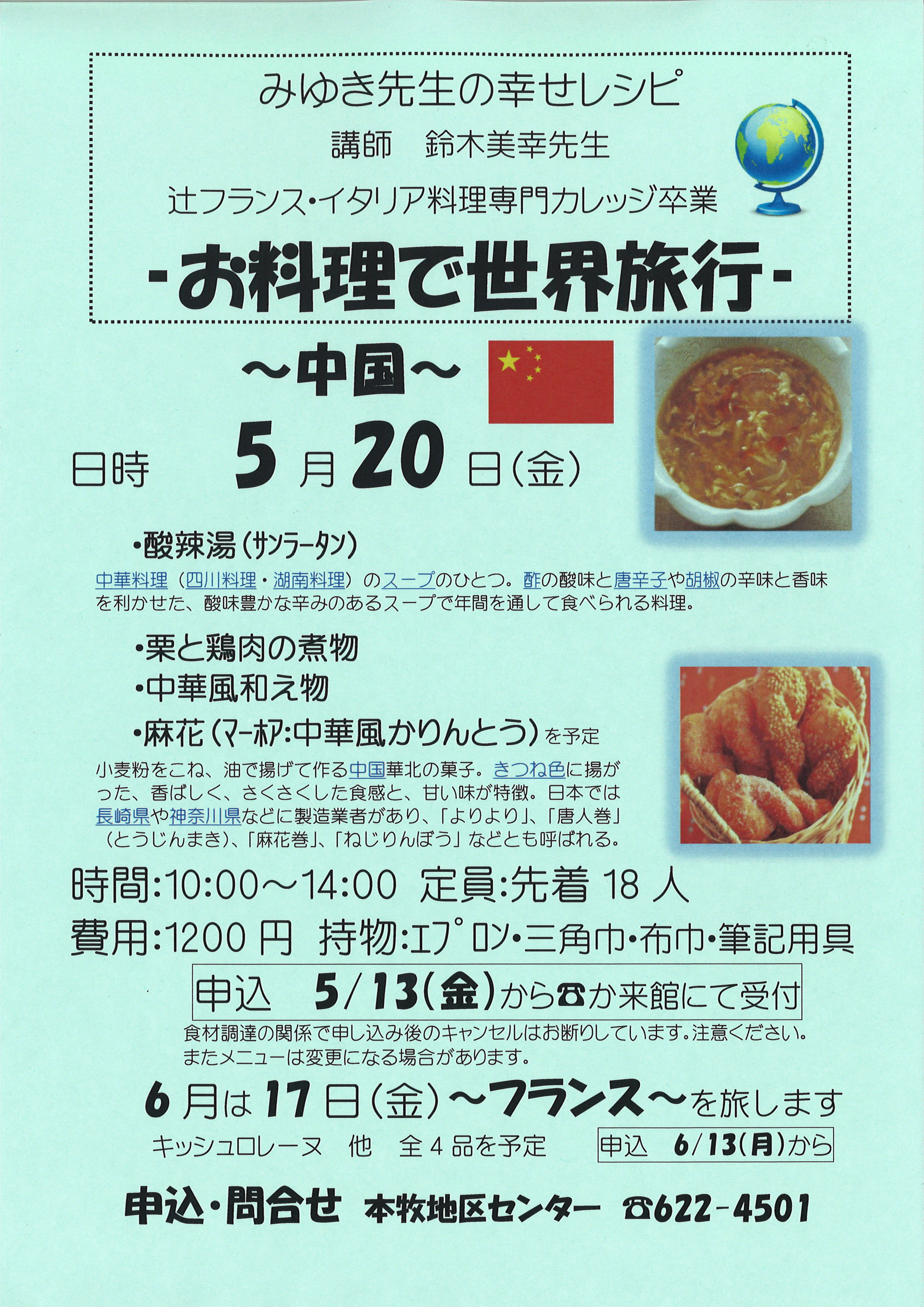 - 持ち物:エプロン・三角巾・布巾・筆記用具