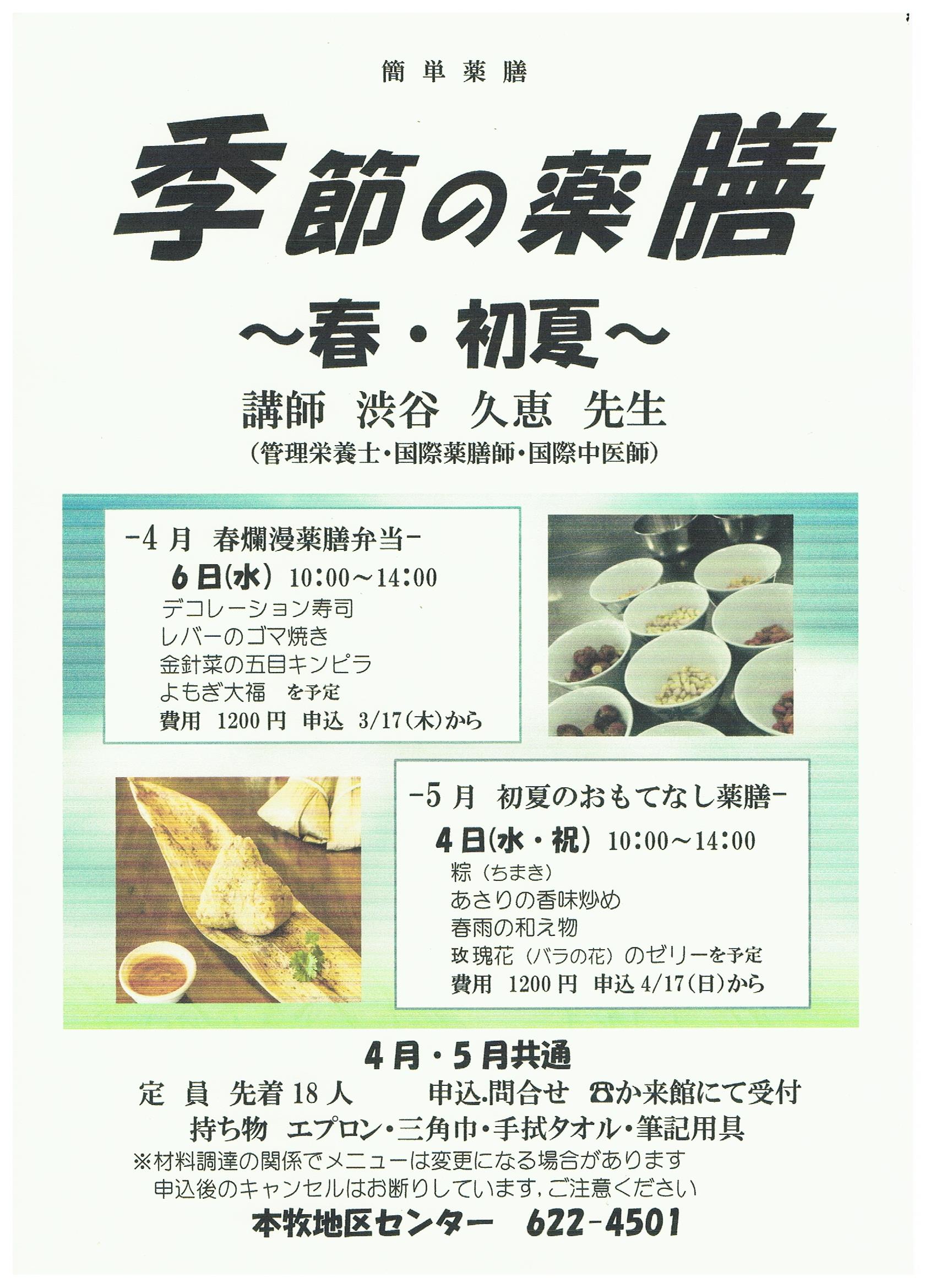- 持ち物:エプロン・三角巾・手拭きタオル・筆記用具