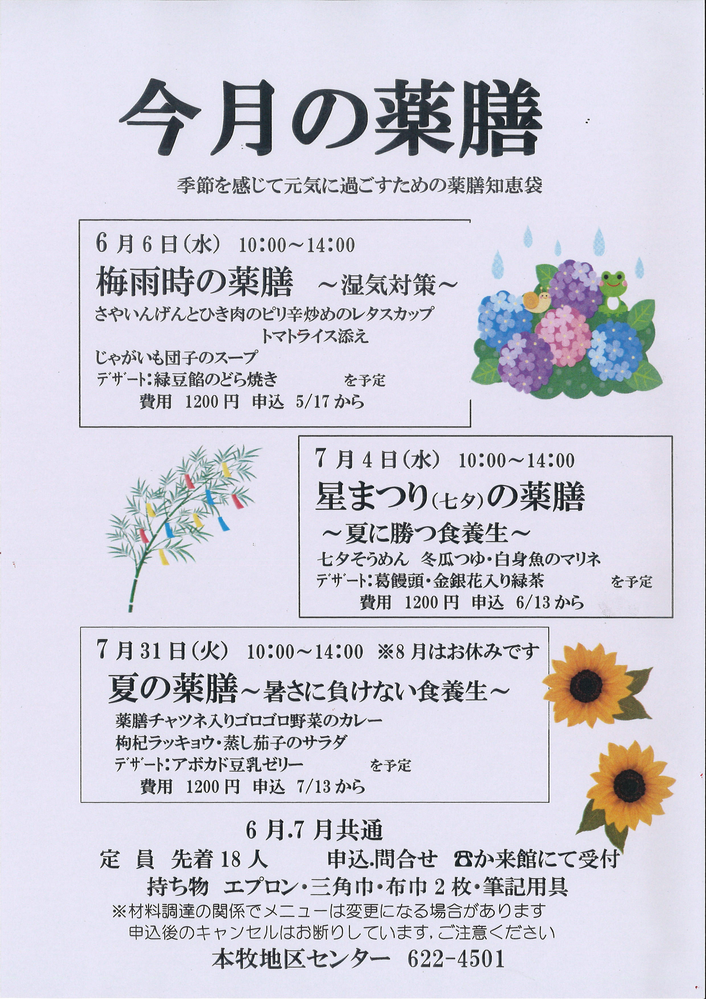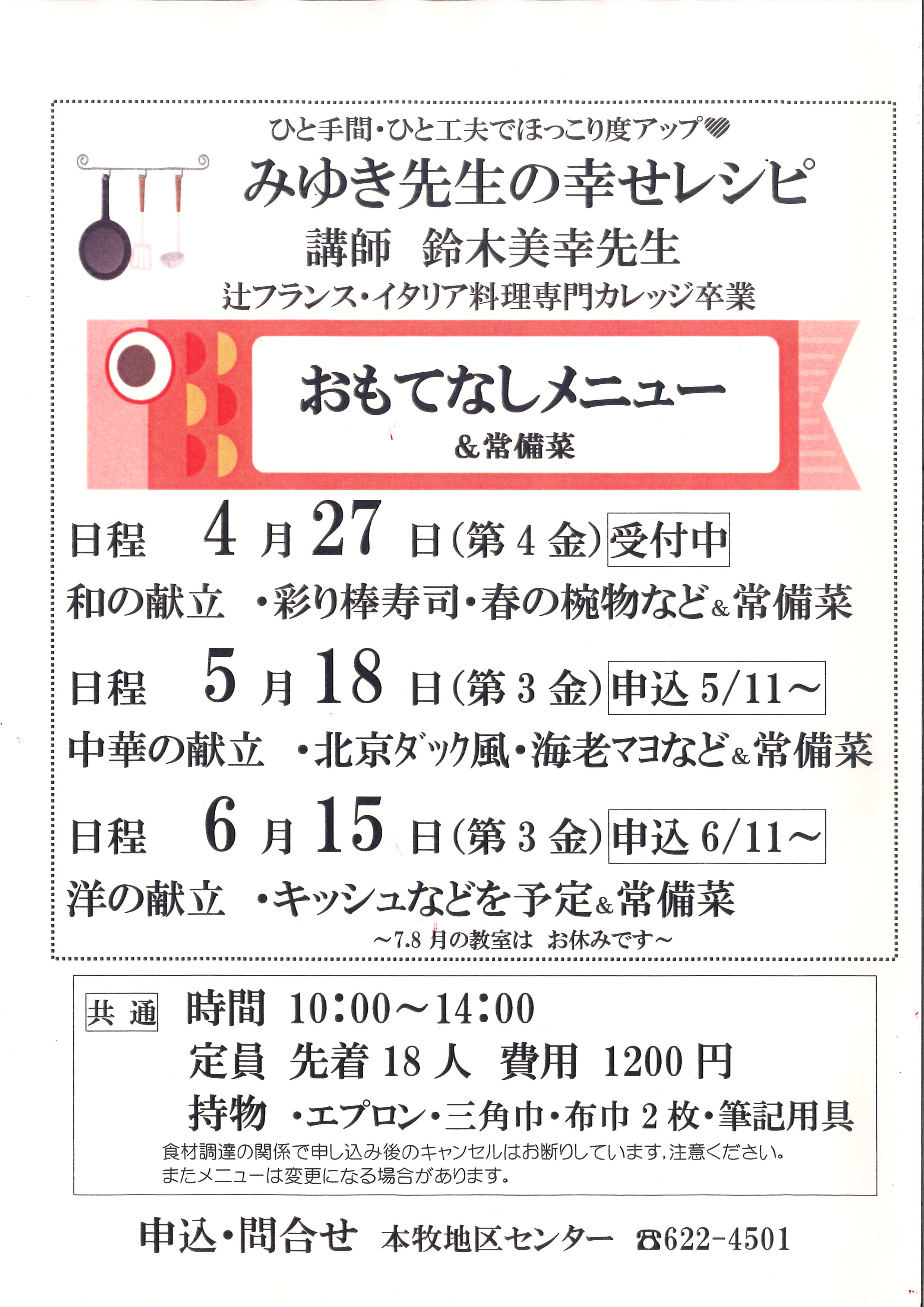 - 持物:エプロン・三角巾・布巾2枚・筆記用具
