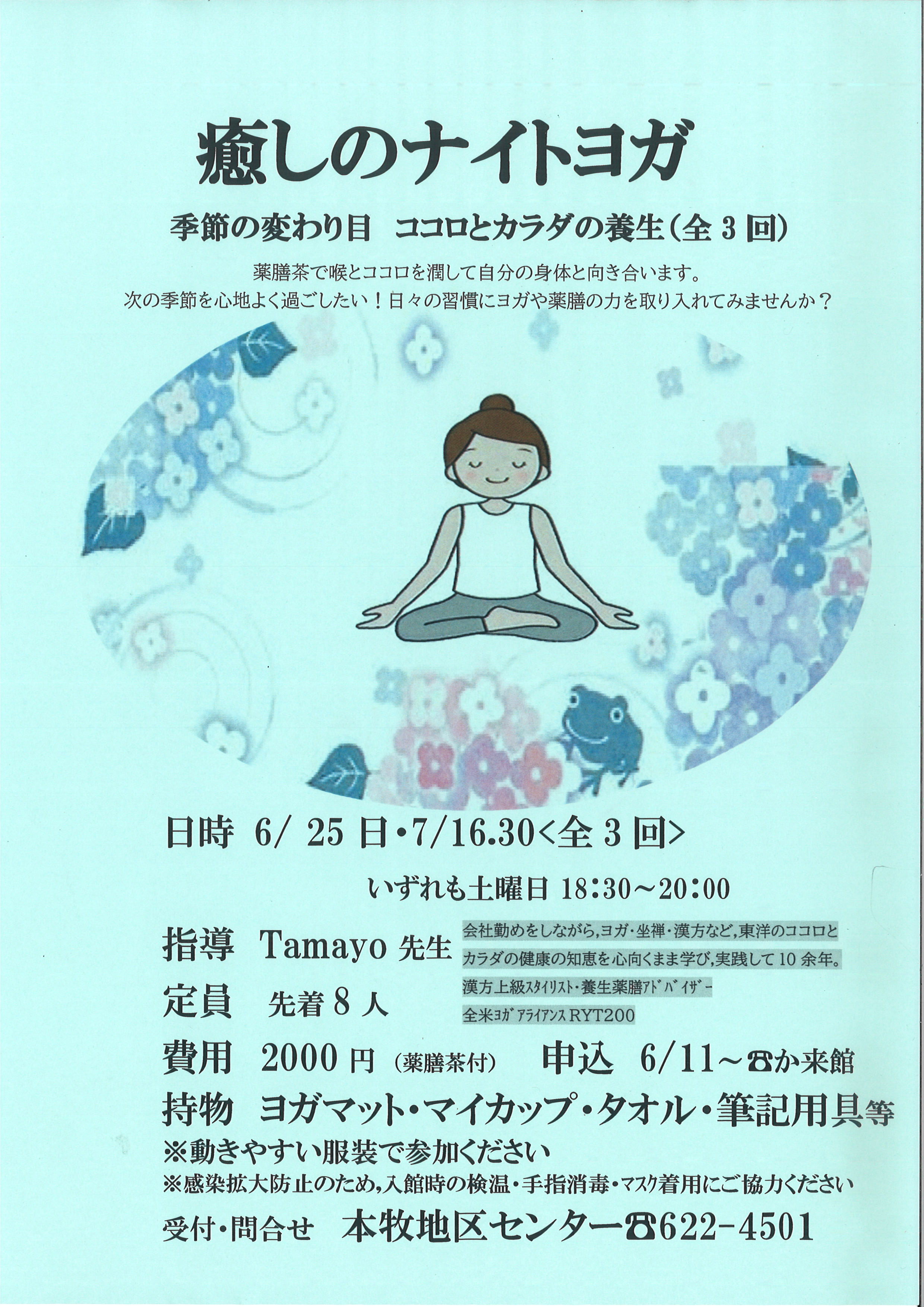 - 持物:ヨガマット(お持ちでない方は申込時に相談ください)