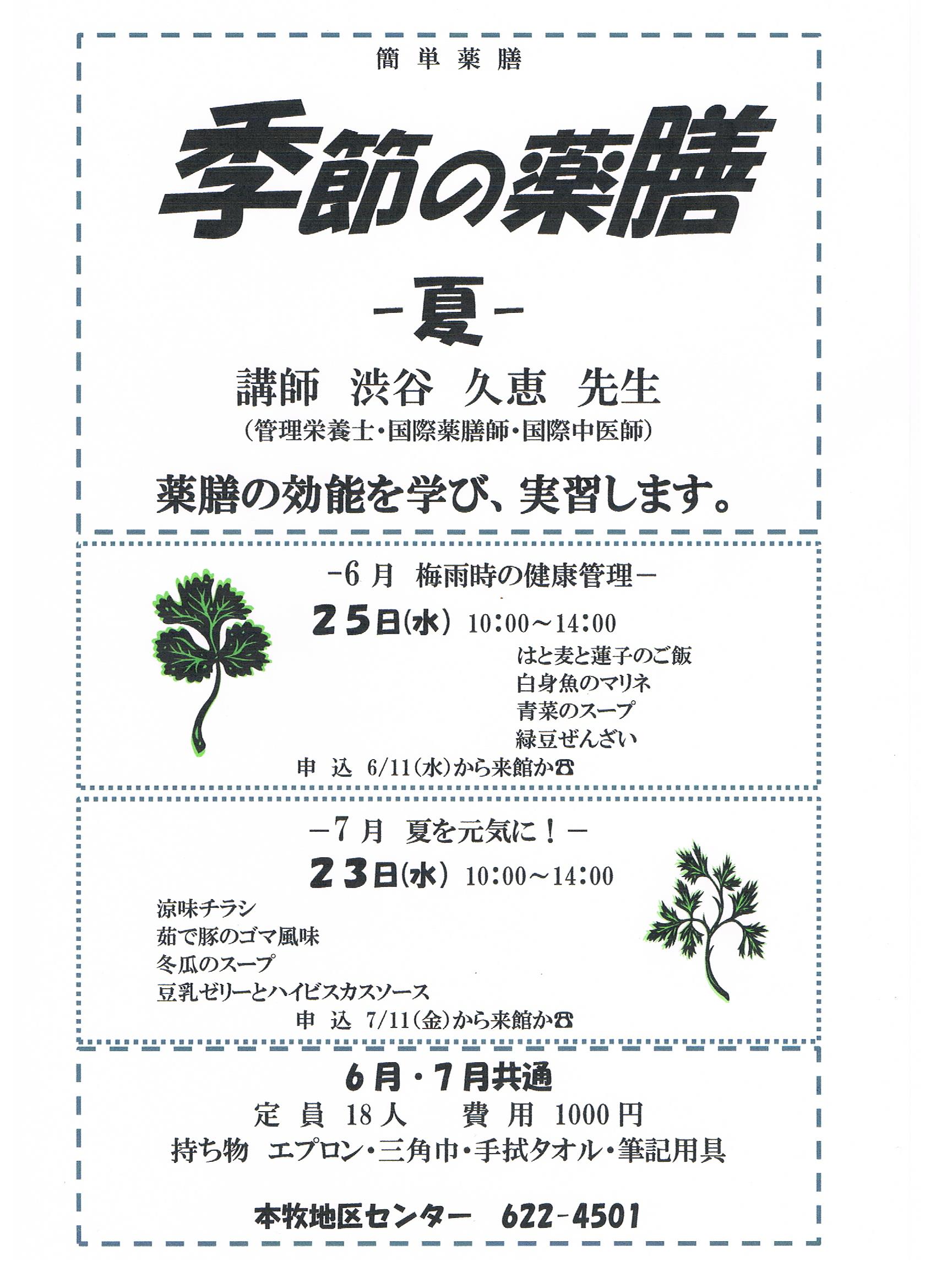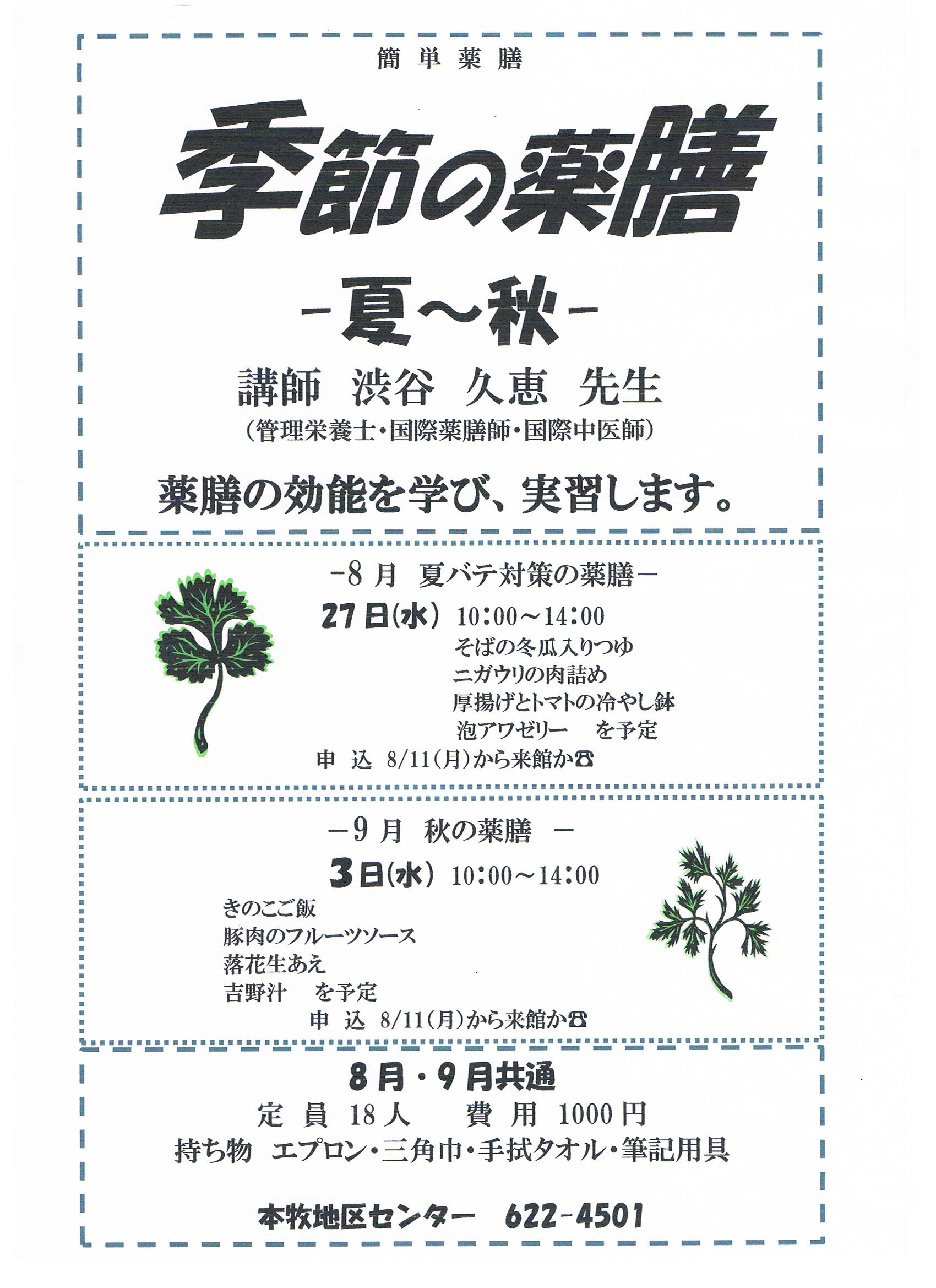 - 持ち物 エプロン・三角巾・手拭タオル・筆記用具