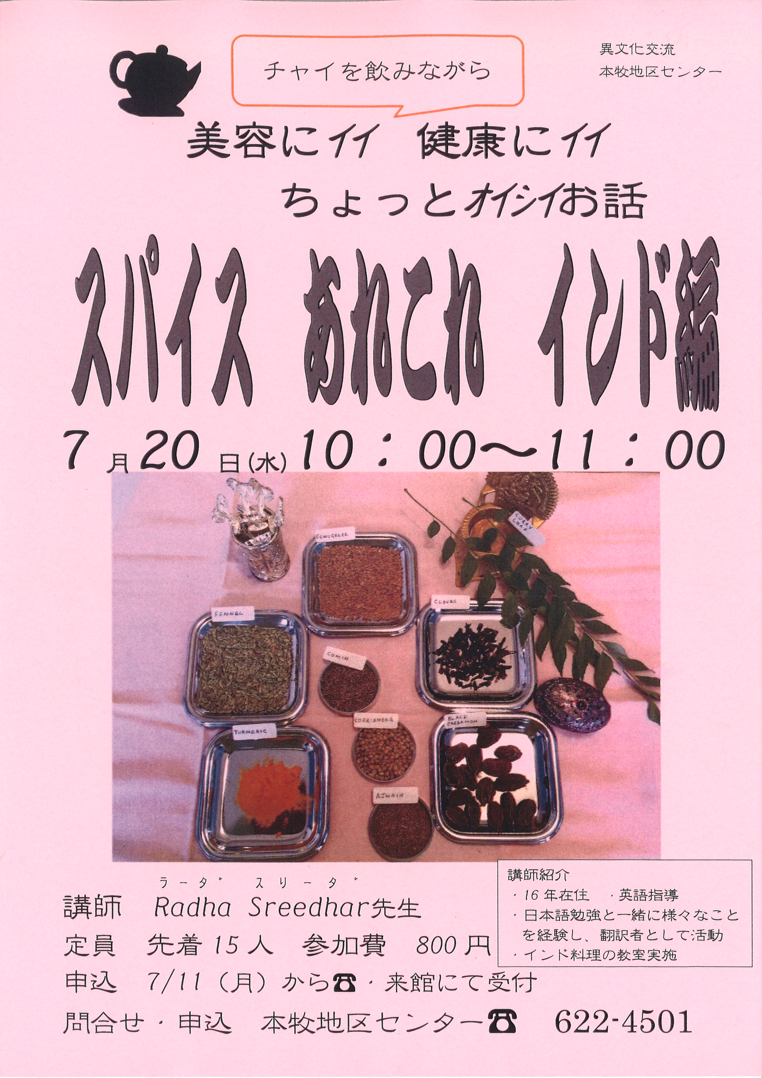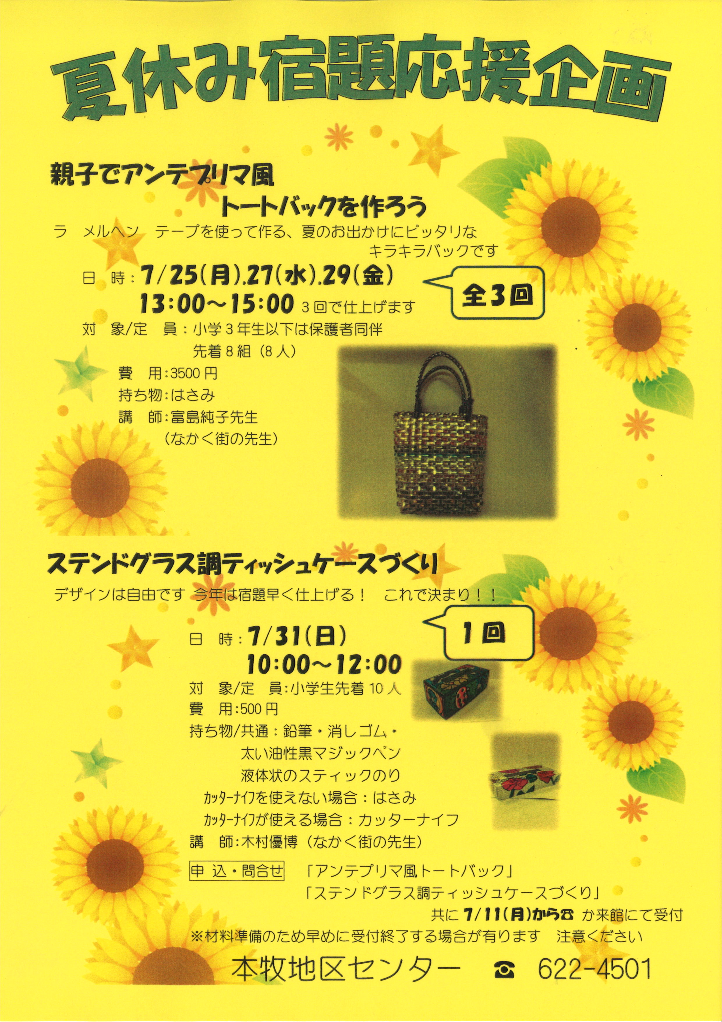 - 持ち物:エプロン・三角巾・布巾2枚・手拭きタオル・筆記用具