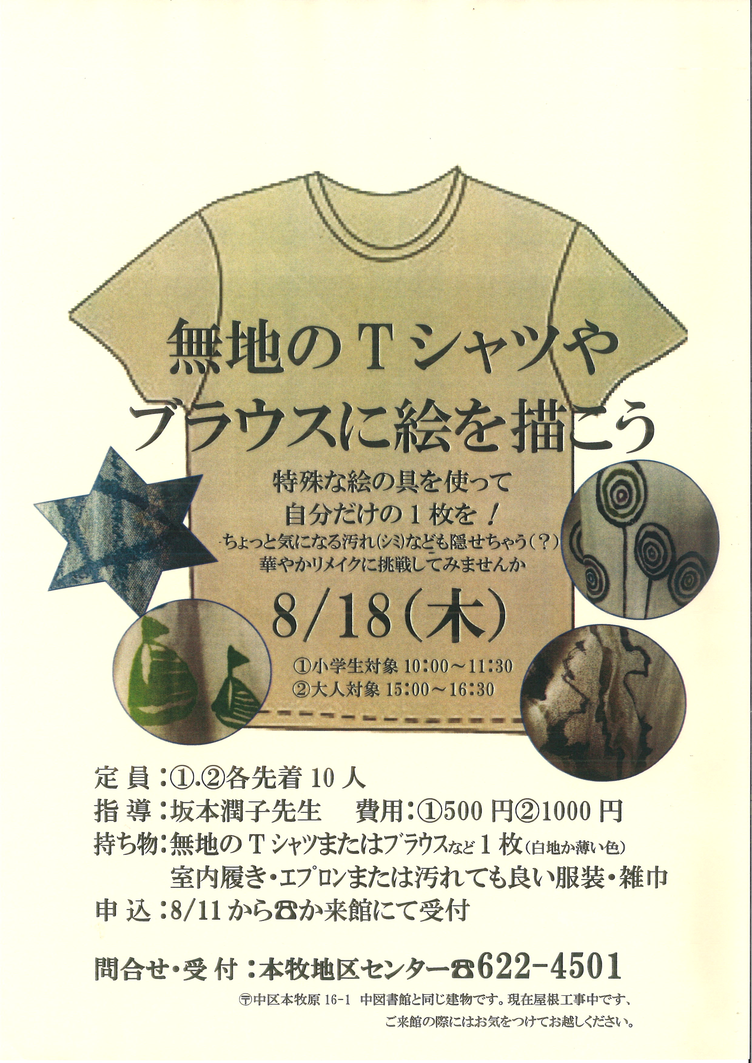 - 持物:室内履き(スリッパ可)・筆記用具・糸切りばさみ・持帰り用袋