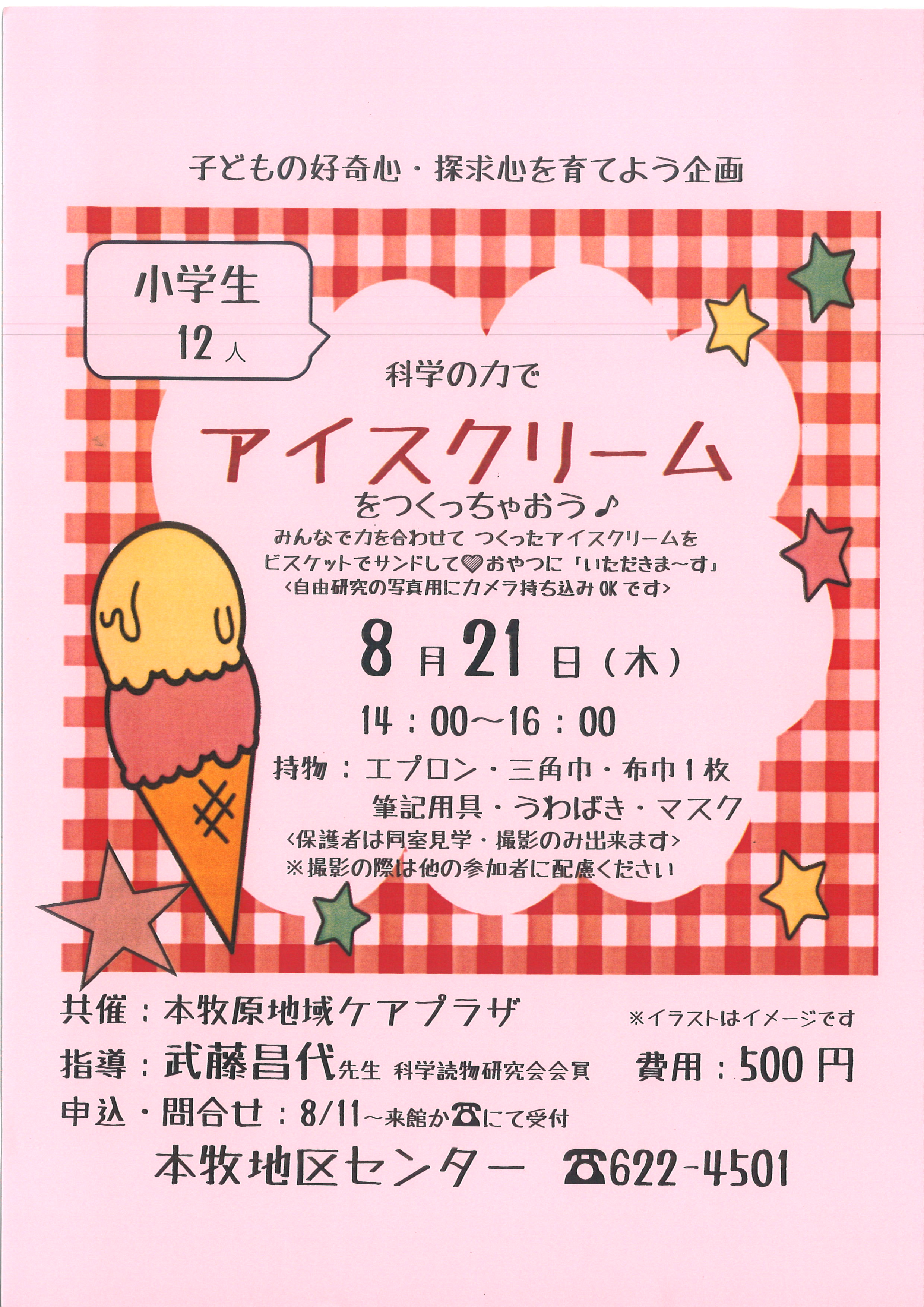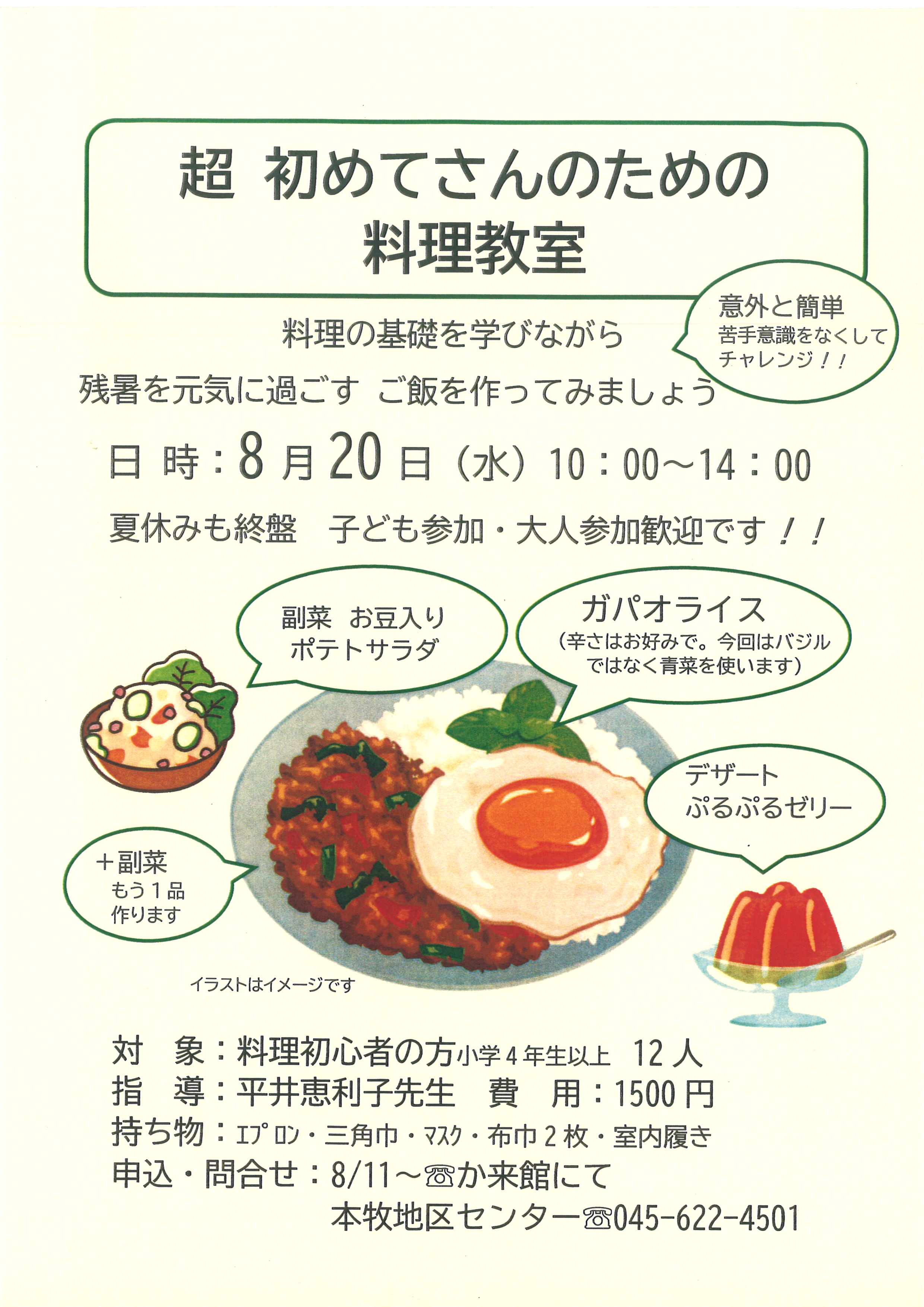 - 持ち物:エプロン・三角巾・マスク・室内履き(上履き)