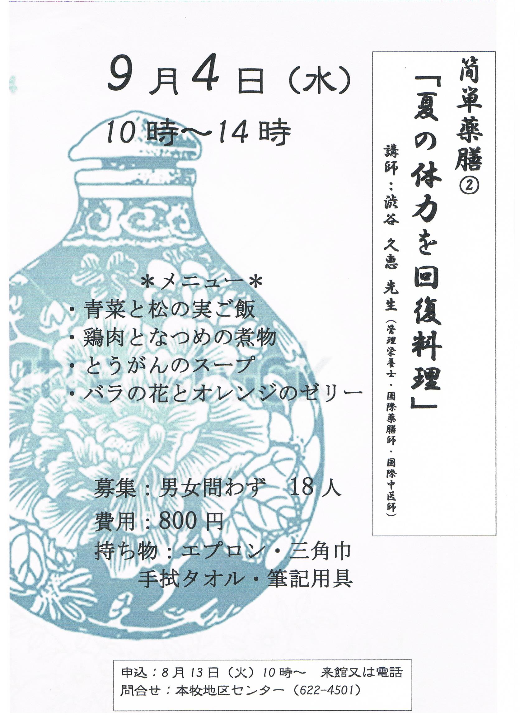 - 持ち物:エプロン・手拭タオル・三角巾・筆記用具