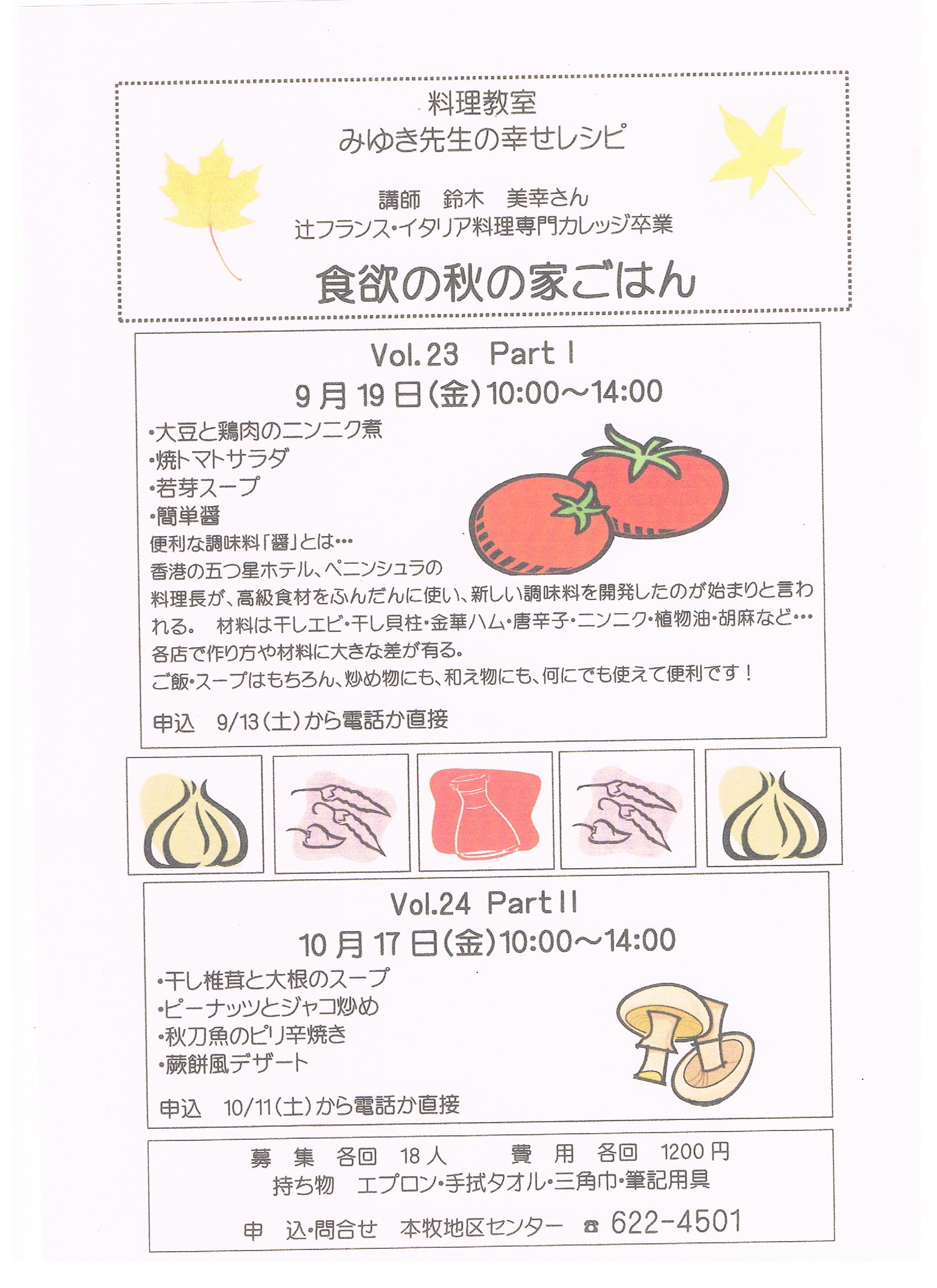 - 持ち物 エプロン・三角巾・手拭タオル・筆記用具