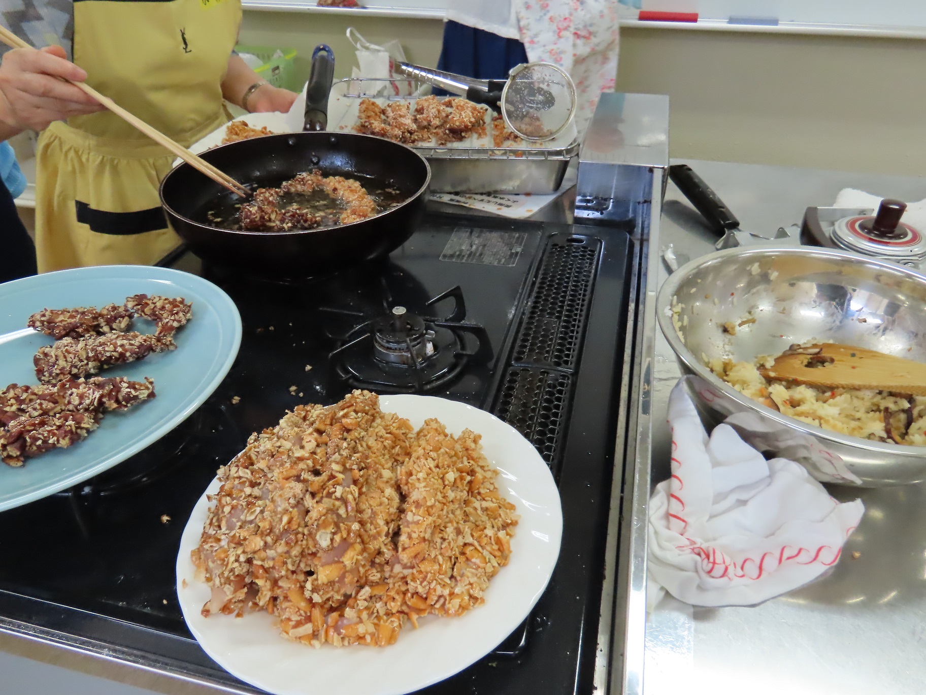 あさりの中華風混ぜご飯 クリスピーチキン 衣は なんと 柿の種 新玉ねぎのグラタン 夏の浅漬け スノーボールクッキー 全5品を作りました みゆき先生の料理教室は 7.8月はお休みです 次回は9月20日(第3金曜日です)