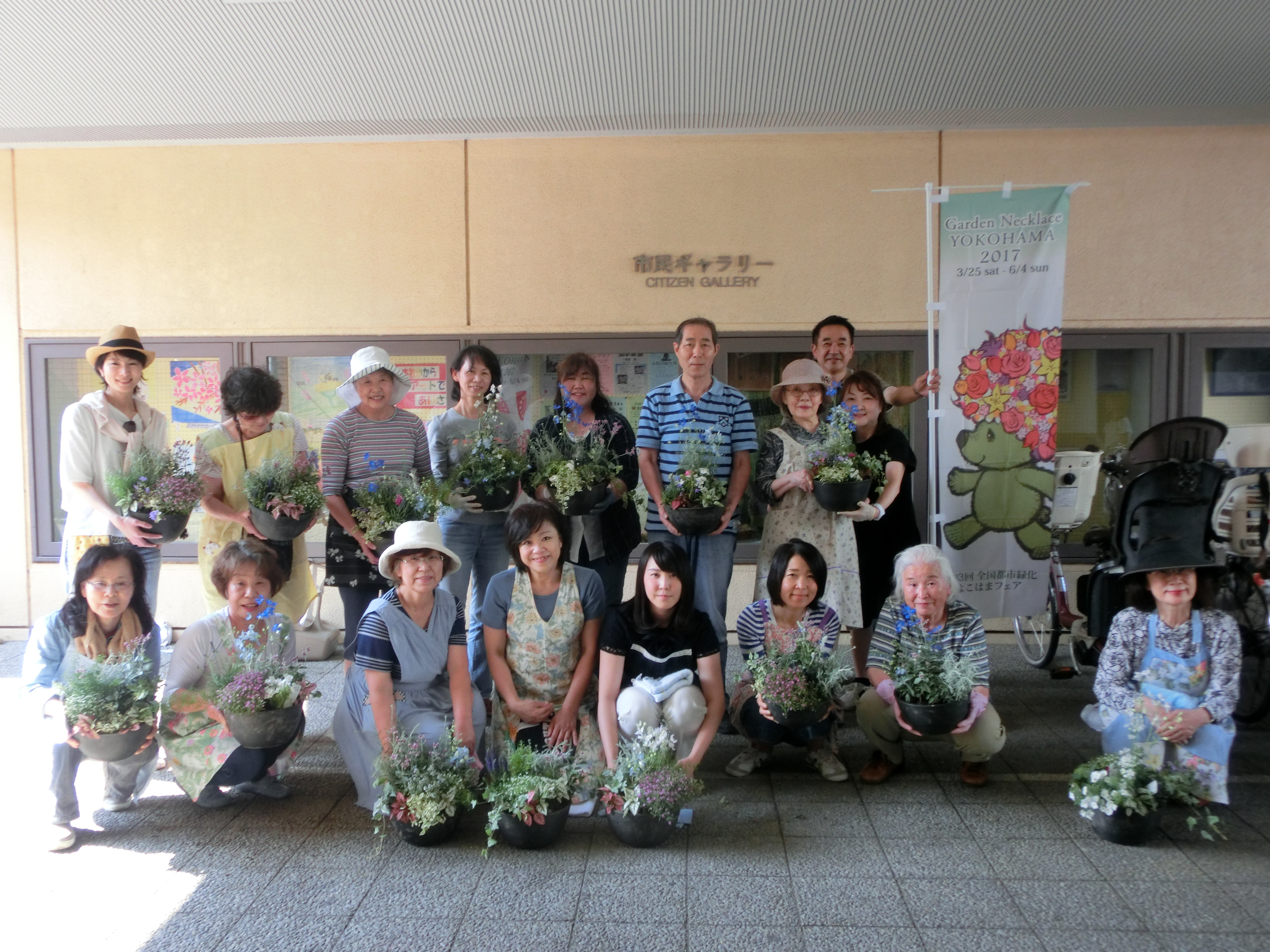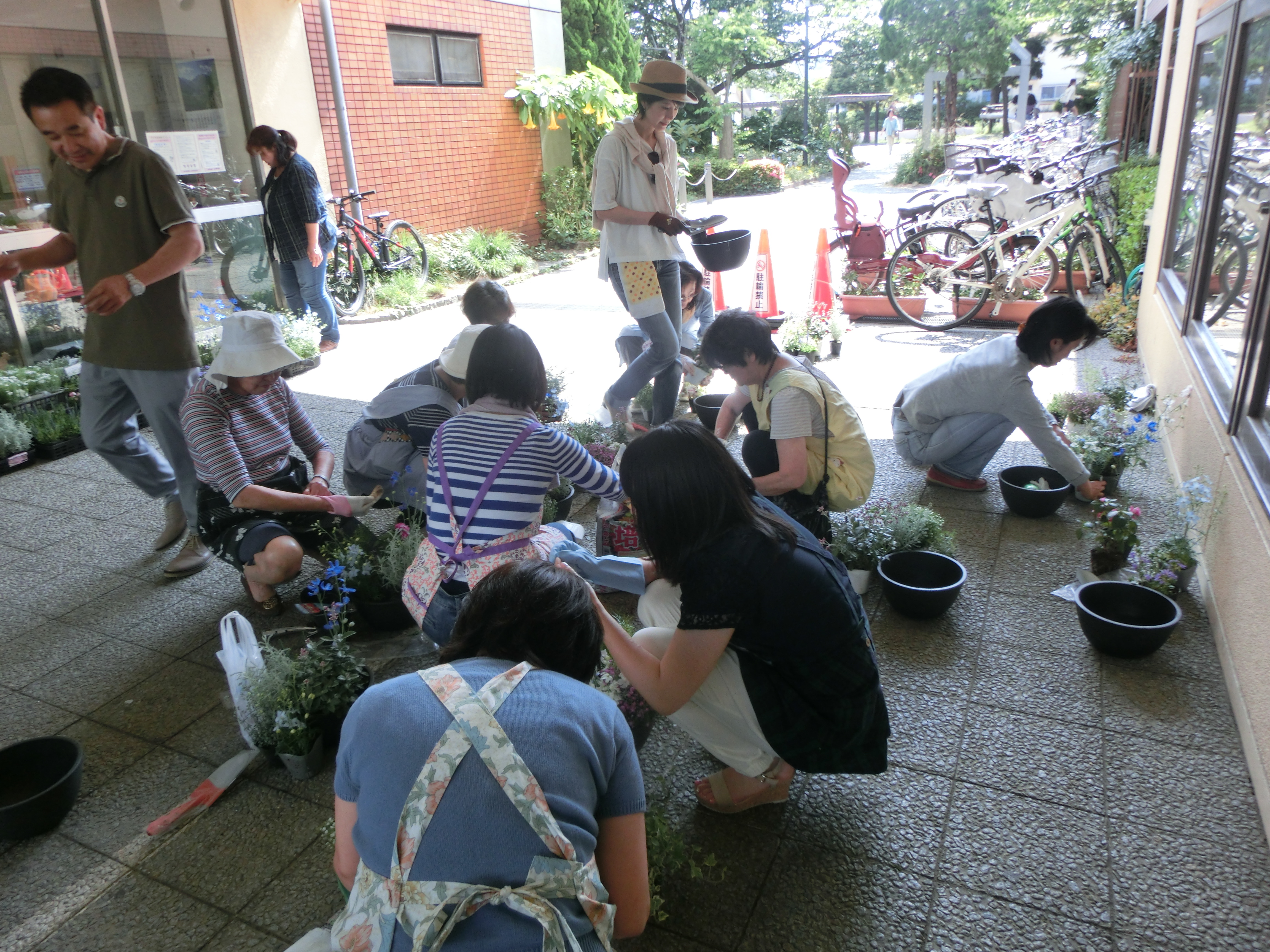 寄せ植えのコツや注意事項を確認 さぁ~作業が始まります 様々なお花が運び込込まれ みなさん「わぁ~」の歓声 配色を考えたり 高さを調整したり 迷う迷う 選ぶ楽しみ 初夏の日差しを浴びながらの作業 賑やかなひととき 土に花にみどりに親しんで 素敵な寄せ植えが完成しました