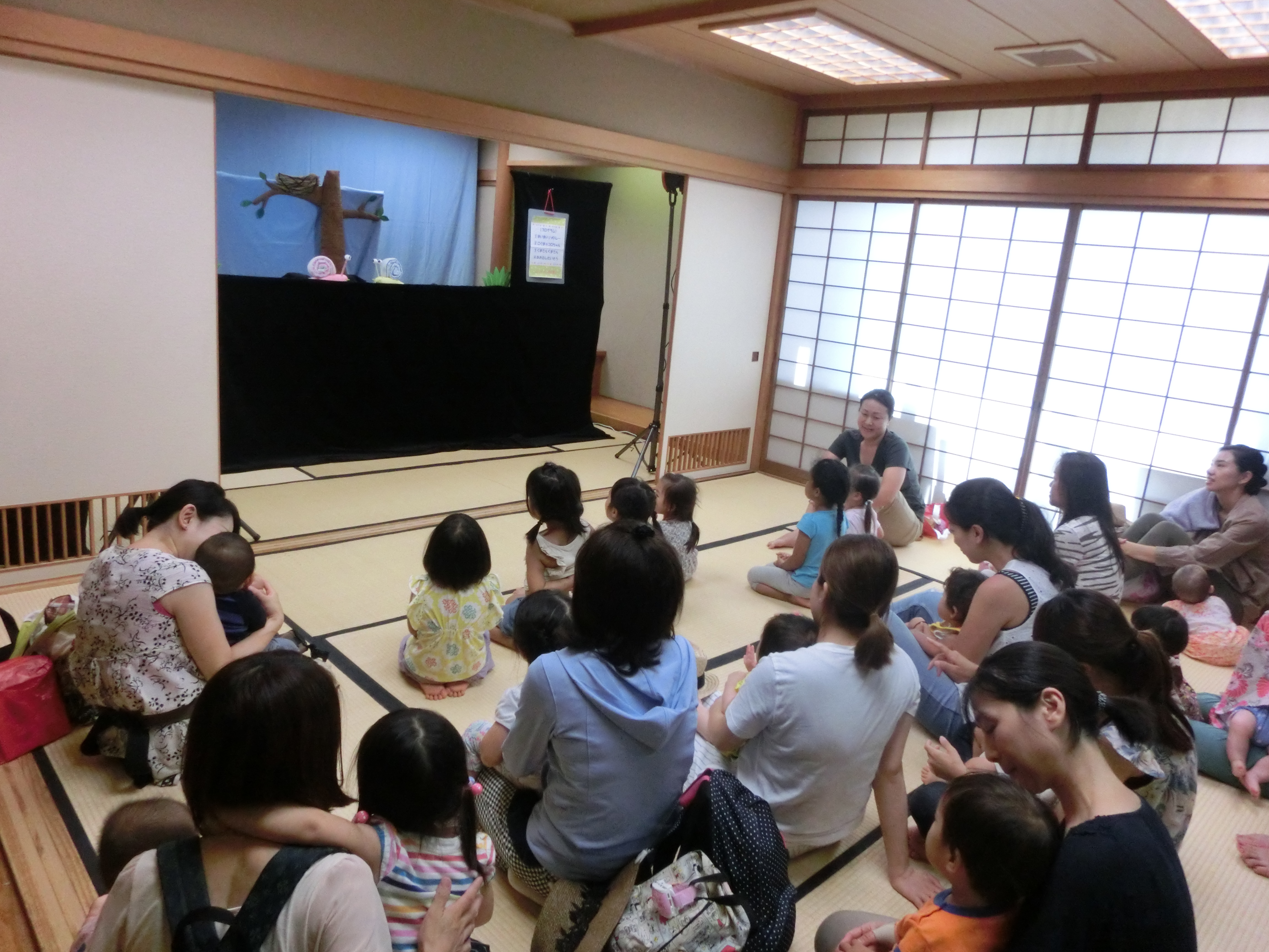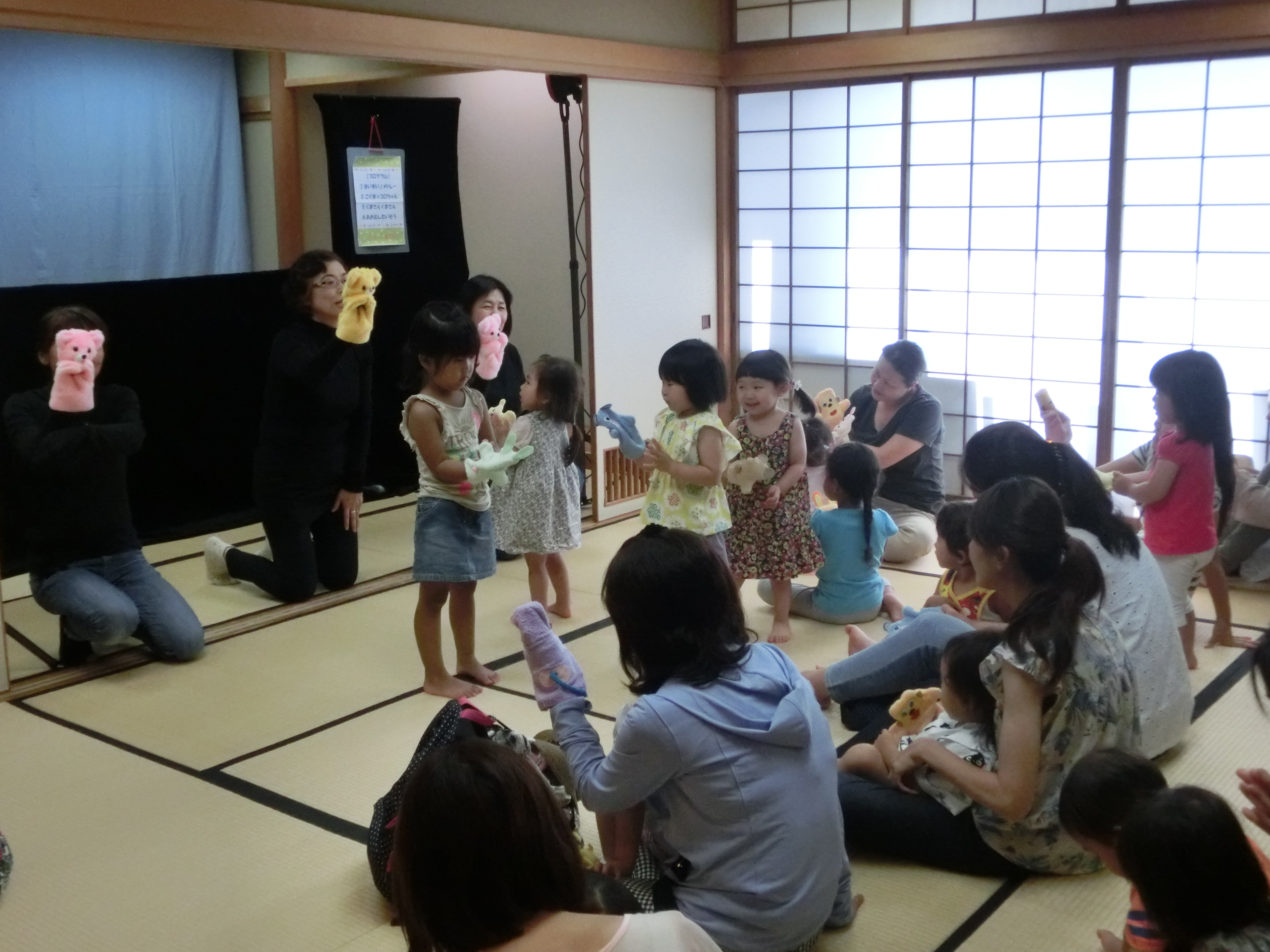 和室いっぱいにお友達が集まってくれました 開演時間前には紙芝居 お人形が動き出すと自然と子どもたちの身体も・・・ お人形とのふれあいタイム くまさん人形での手遊び 大人も見ていて楽しめました お人形可愛いです 次回も楽しくです 等々感想を頂きました