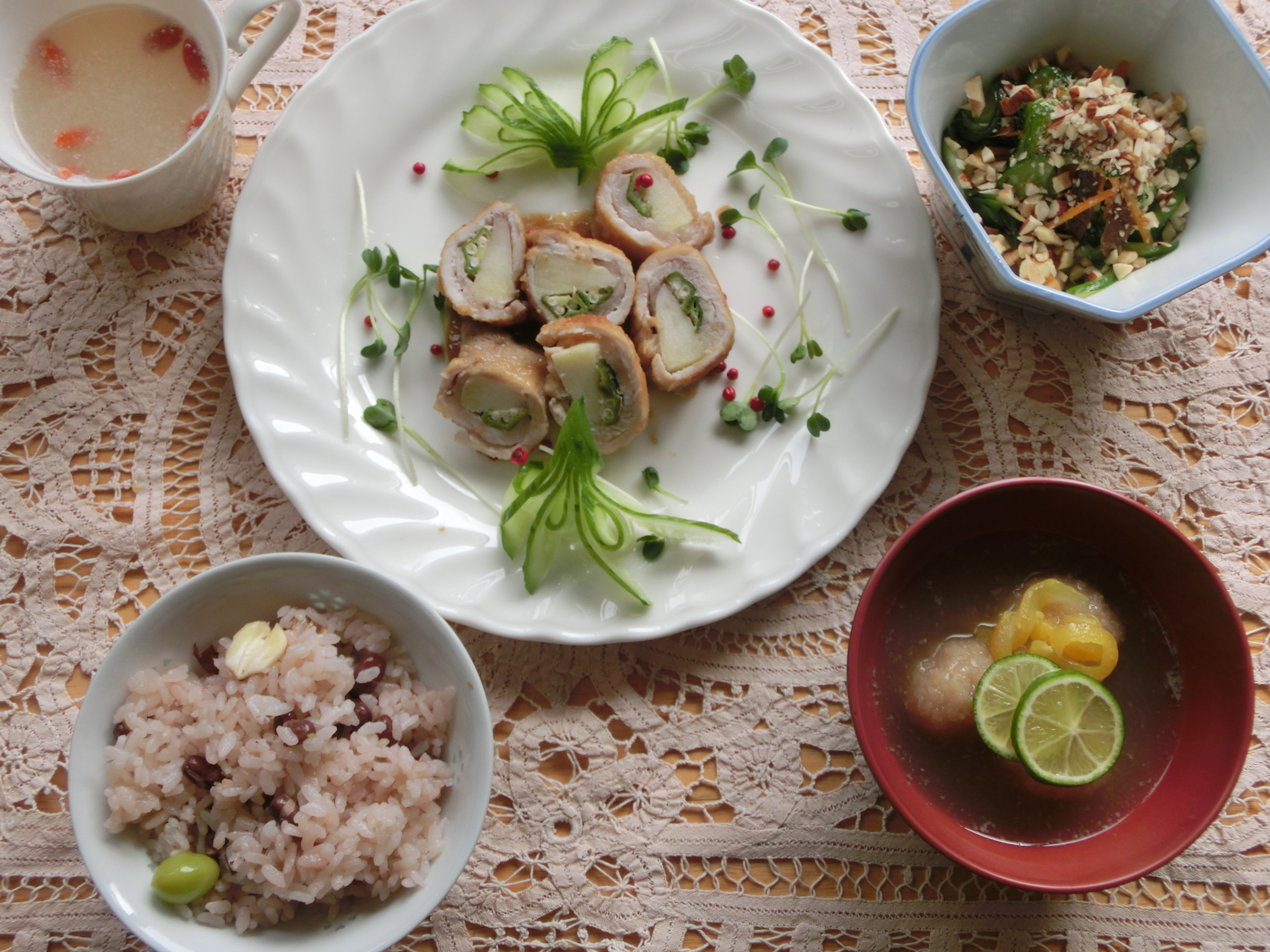 季節の恵みを取り入れた献立 銀杏・林檎・木の実・蓮根・・・ 銀杏や蓮子(ハスの実)・小豆の 入った「萩ご飯」は 「補気益気・気を補い元気に」 豚肉の林檎風味は 「滋陰潤肺・体に潤いを与えます」 体の状態を知り 体を整える食事を摂る 学び・作り・目で楽しみ・食べて満足,満腹