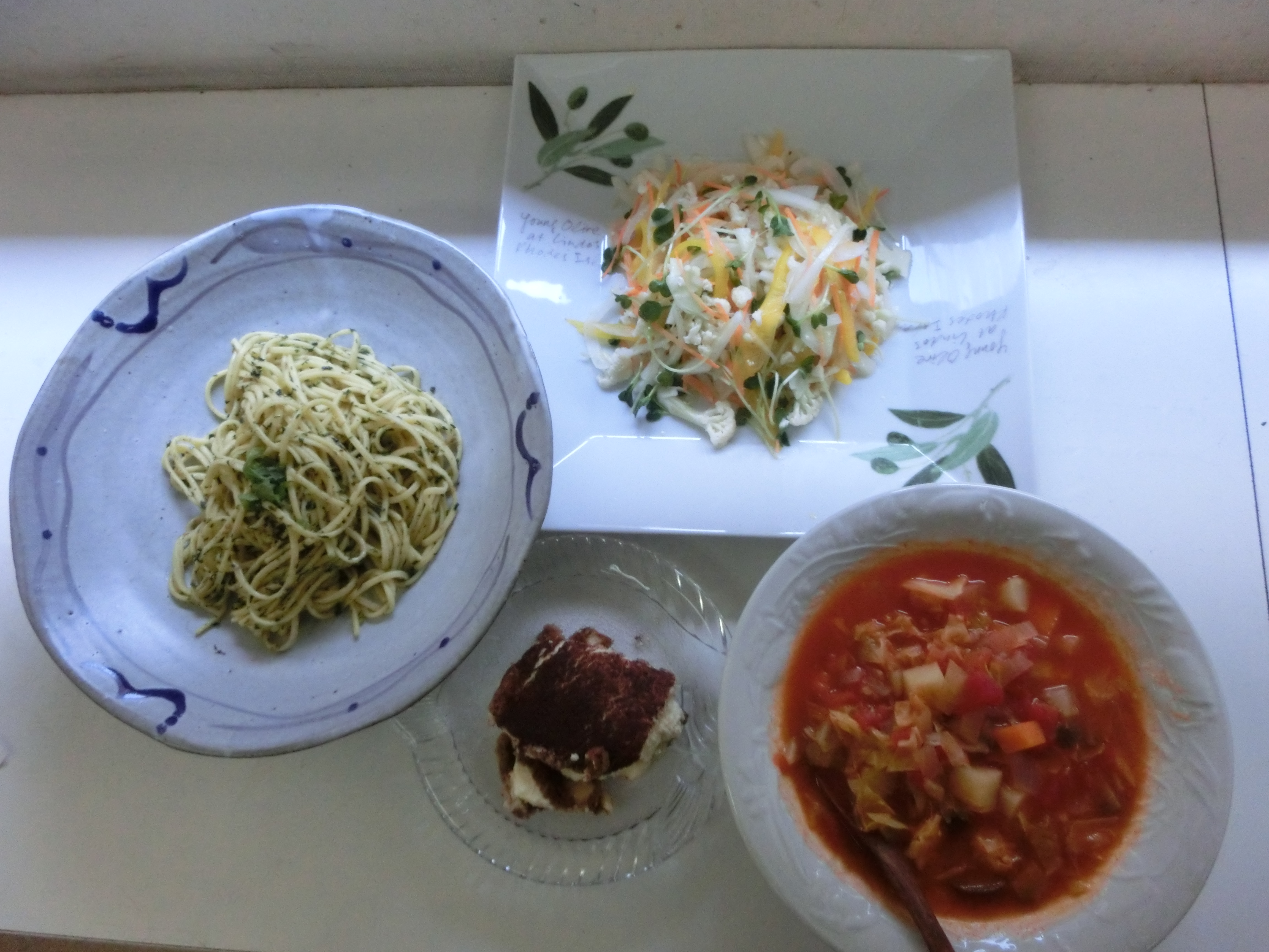 和やかな中にも緊張感もちょっぴり・・・ パスタの塩加減・ゆで加減 絶妙です 今回のパスタはグリーン(ゴマや大葉をペーストにして) サラダは黄色やオレンジ色で花畑のよう 野菜たっぷりのミネストローネ ティラミスも手作りすると、甘さも控えめで ふわふわの優しいお味です 今回も皆さん大満足の教室でした
