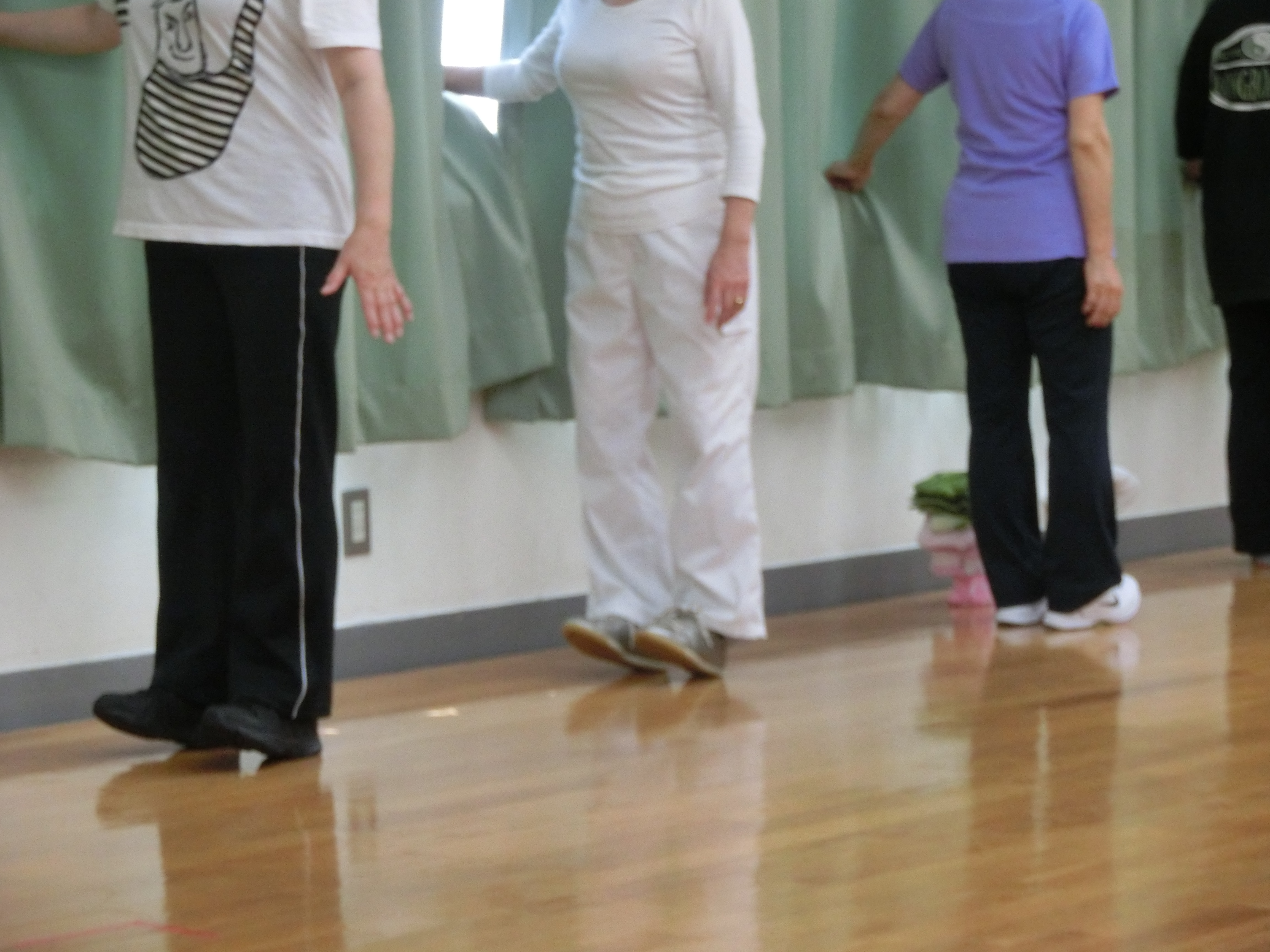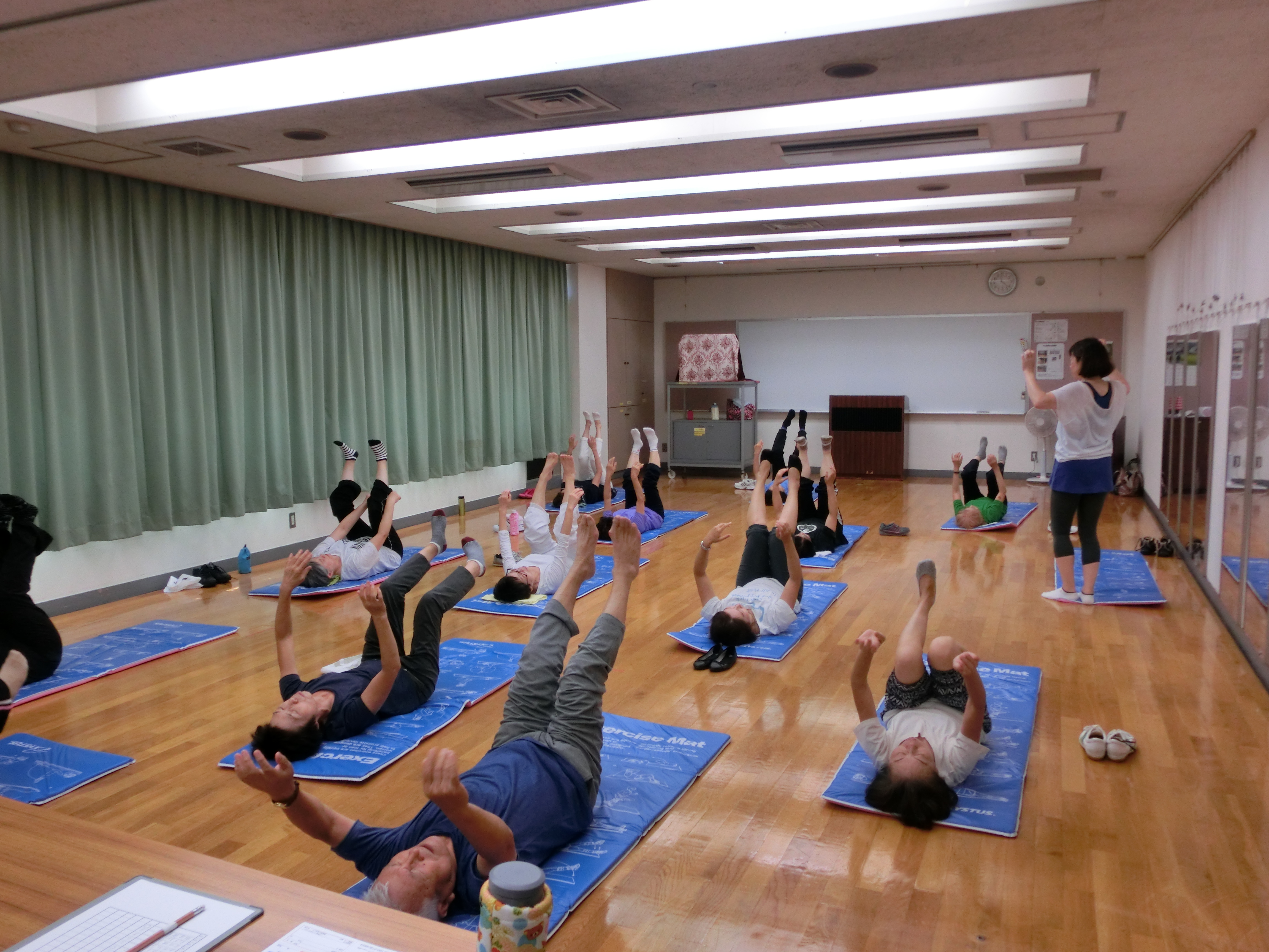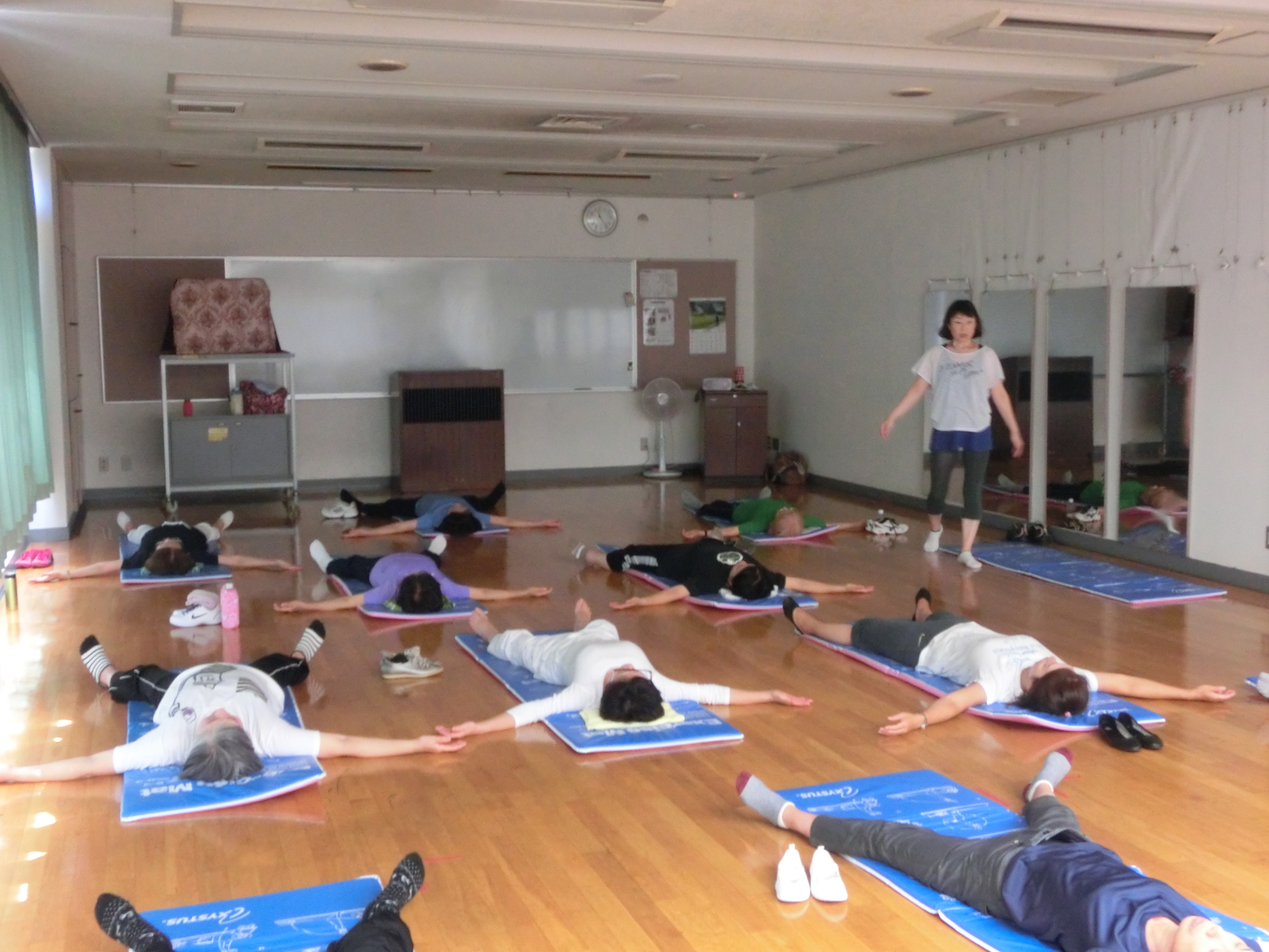 無理なく身体を動かし整えます かかとを上げてストレッチ これを繰り返すだけでも汗がじんわり・・・ 音楽に合わせて気持ち良く 充分なストレッチ・筋トレの後は リラクゼーション 爽やかな笑顔で終了の1時間です