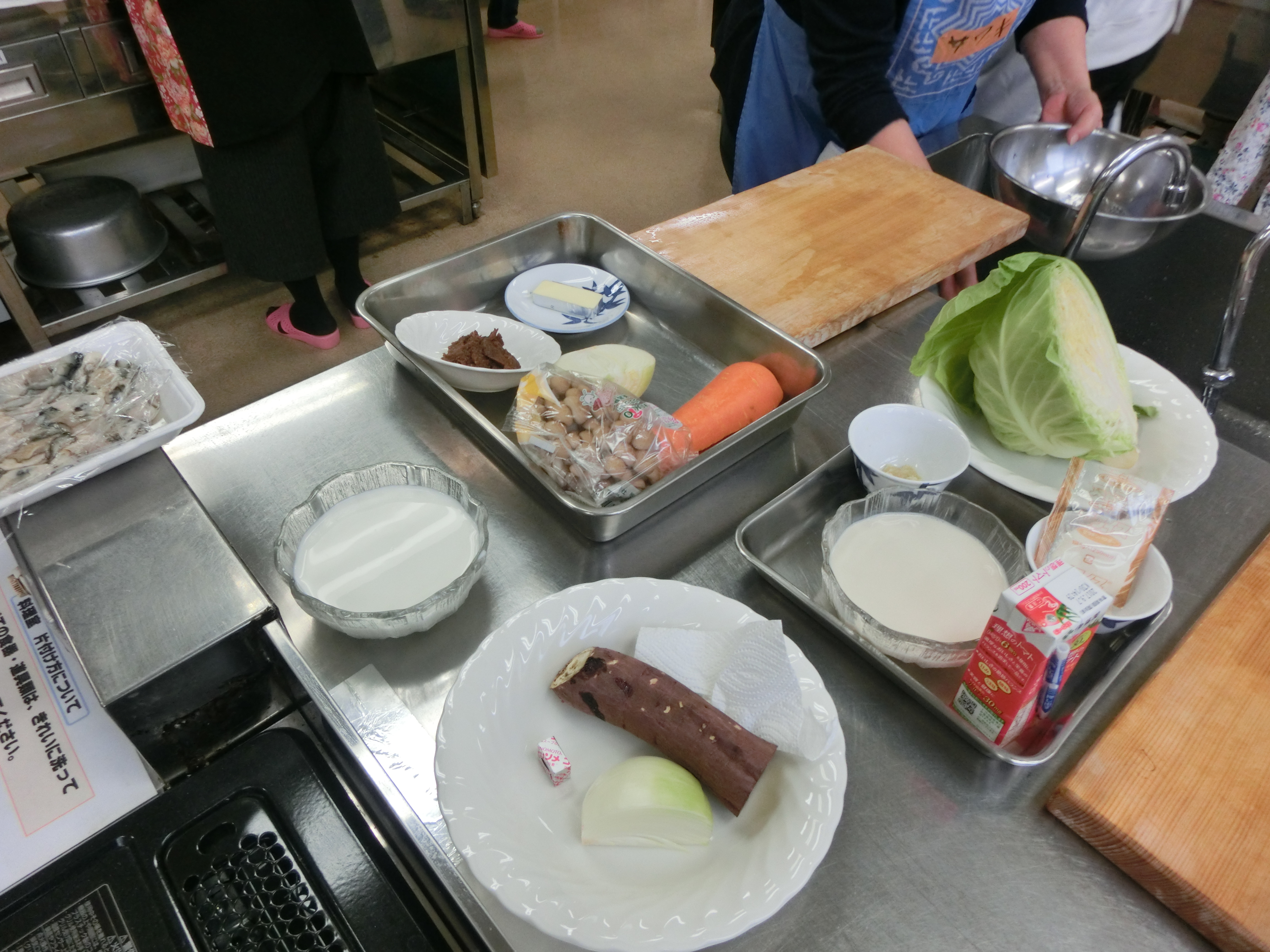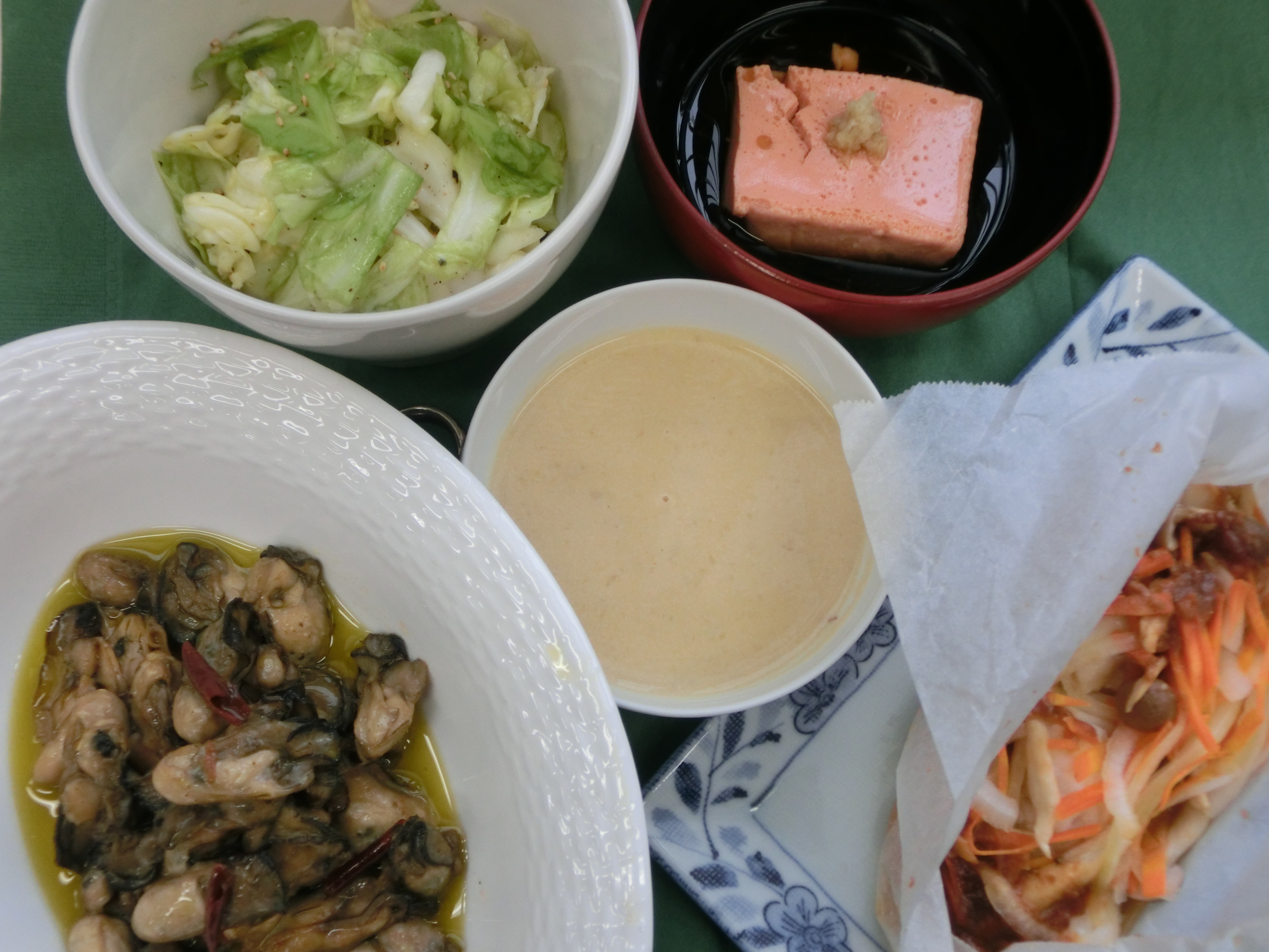 ~ご飯がすすむ魚料理~ 鱈のレンジ蒸し 焼き芋のポタージュ 塩キャベツ アヒージョ→牡蠣の燻製風 洋風デザート→トマト豆腐 へ変更 まさしくご飯がすすむメニュー アヒージョ・・・ちょっとの工程変更と 調味料(オイスターソース)をプラスすることで 保存も効く一品が完成 ご飯もすすむがお酒にも合う!!の声が・・・ トマト豆腐 デザートにもなる見た目にも美しい一品 今回もお腹も心も満たされた教室でした