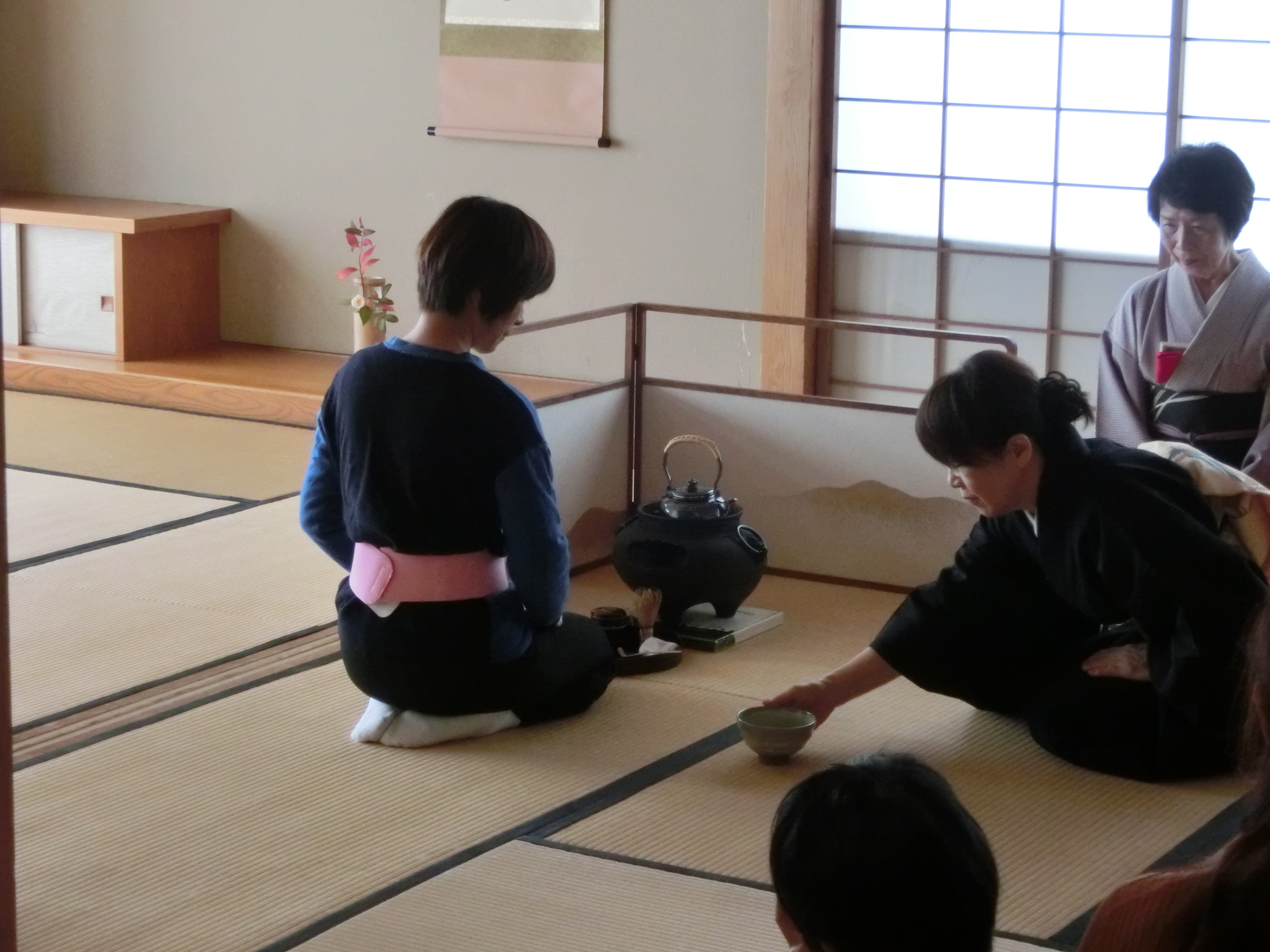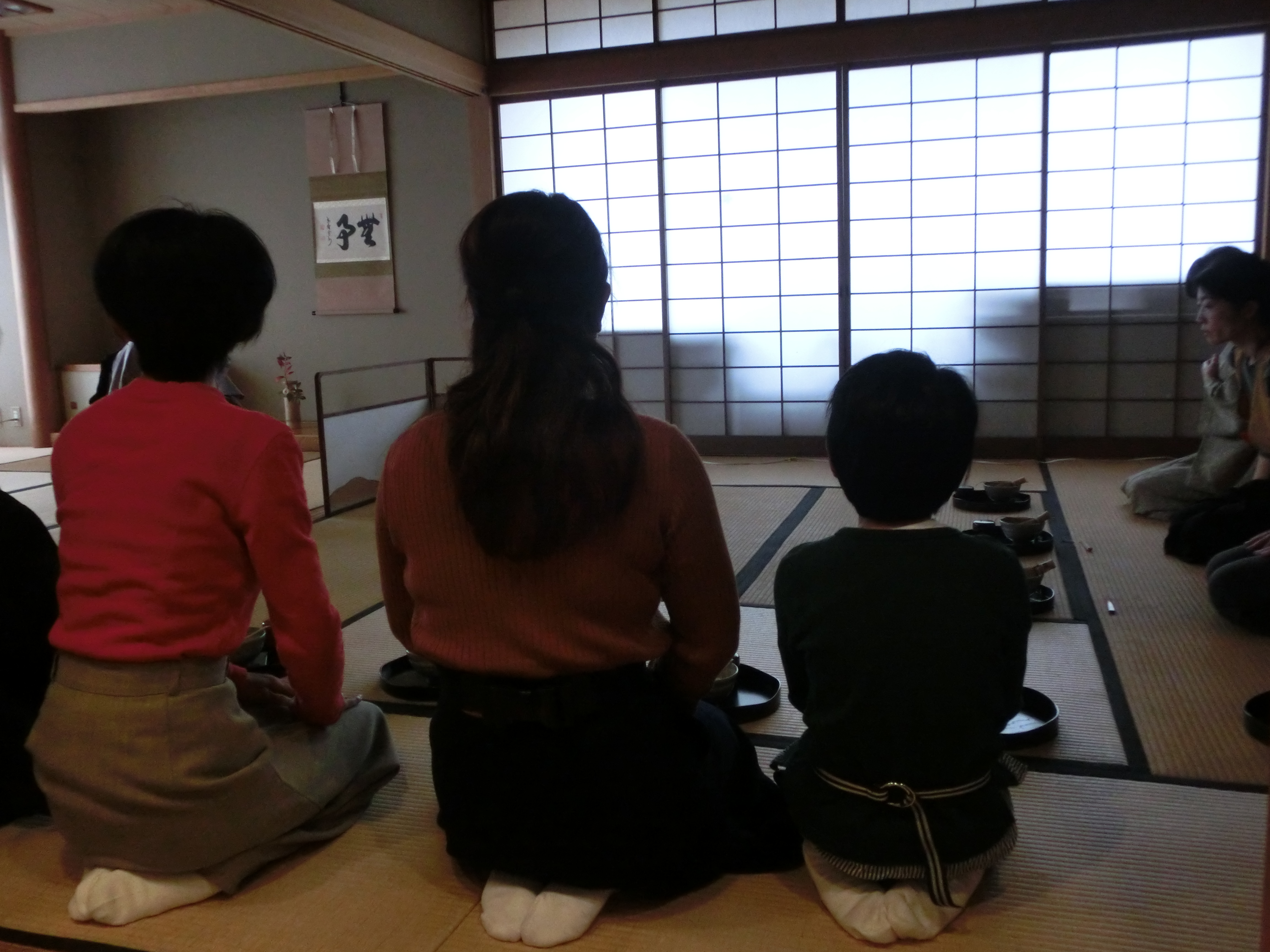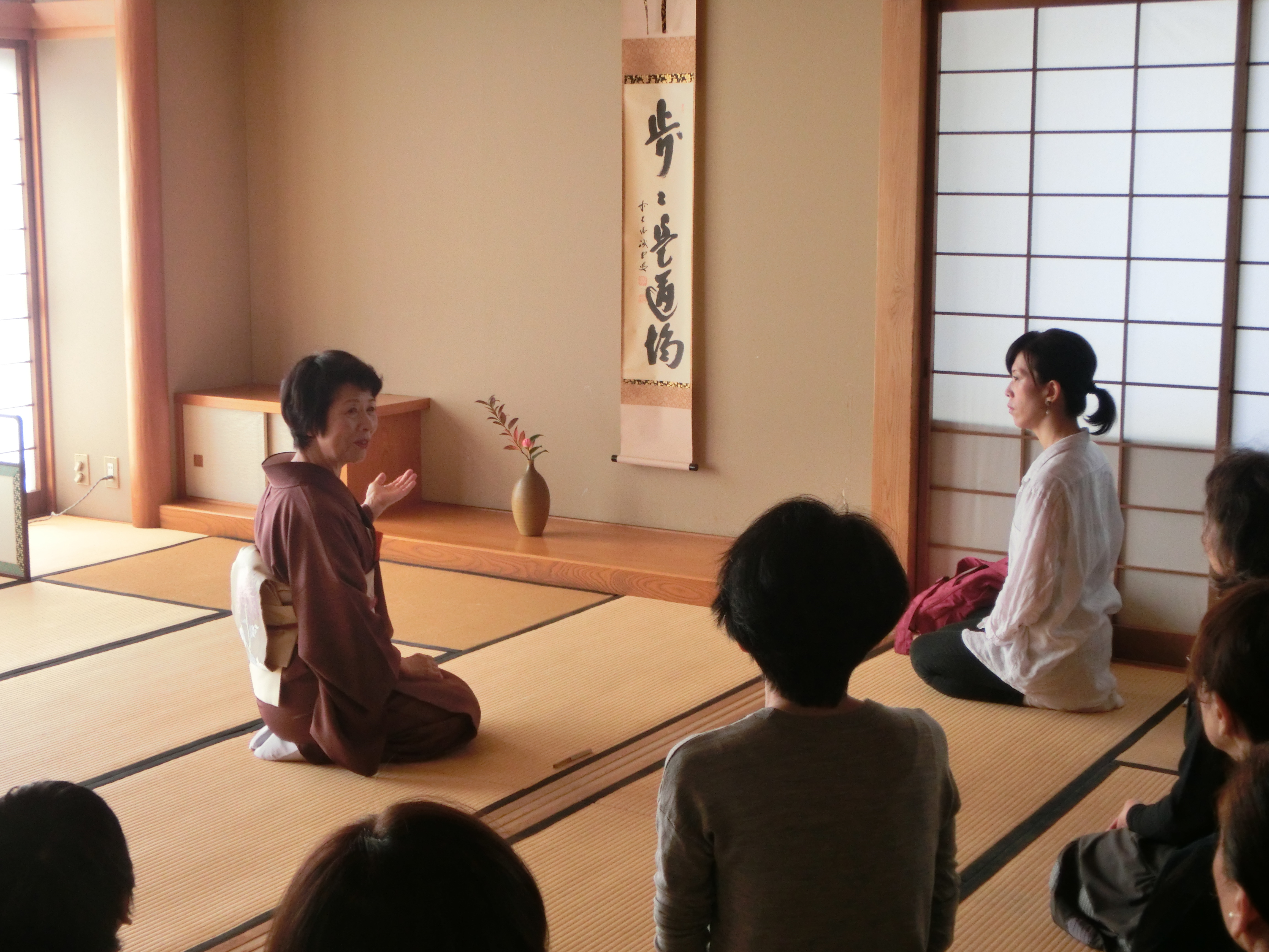 初回 廣部先生が選んでくださった 掛け軸は「歩歩是道場」 今日、ただ今、ここに一所懸命になること 立ち居振る舞いからお点前 静かに時が流れます お作法が???の方には そっとお隣の受講者が手を添えて 微笑ましい一コマも 季節のお菓子も大きな楽しみ