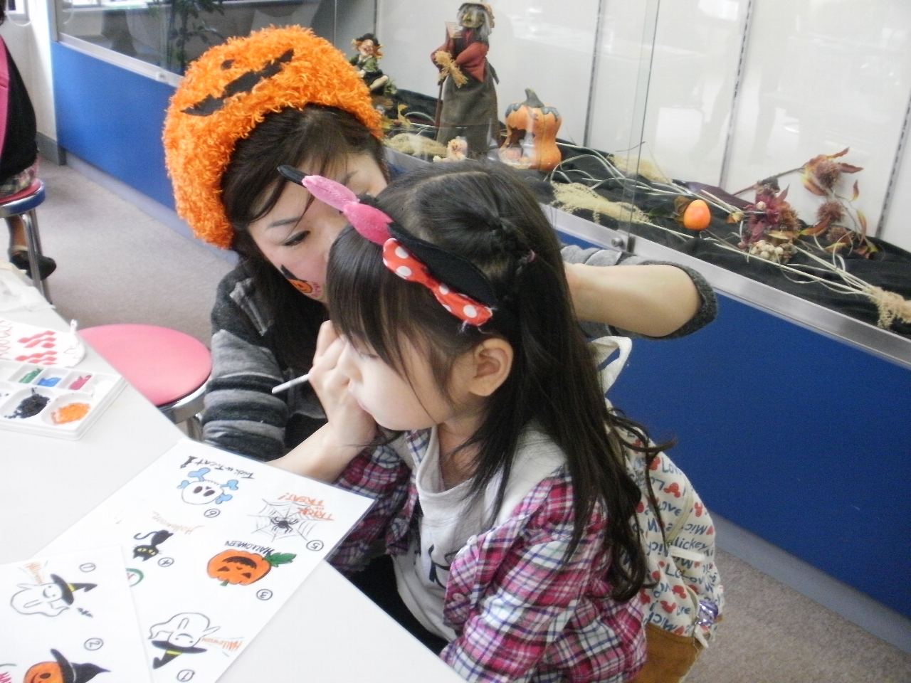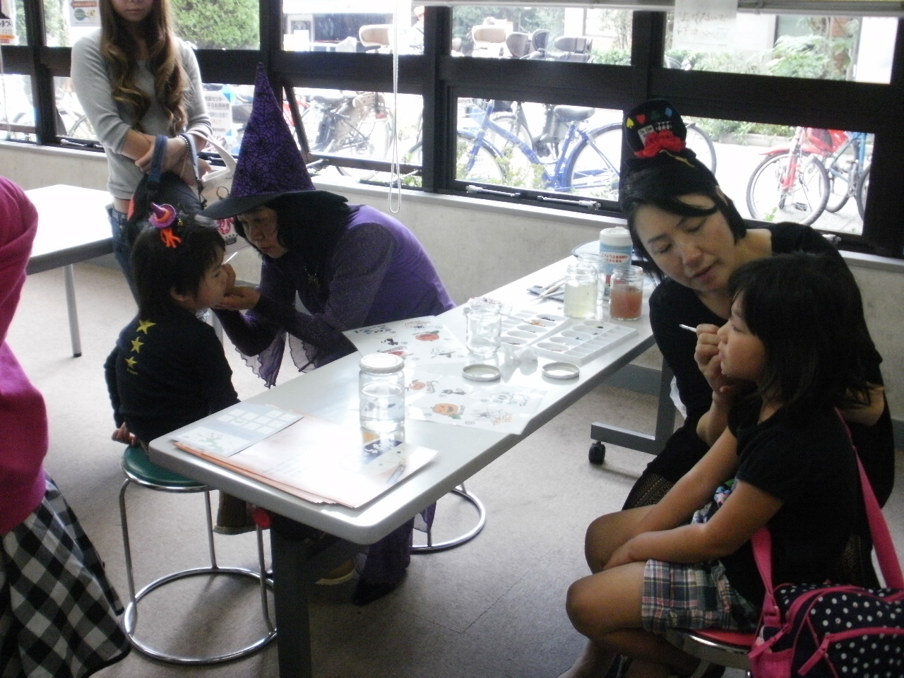 地区センターでは、このスタンプラリーの参加資格を得るための補助として、フェイスペイントサービスを行いましたが、実際に仮装をしていない人にペイントをしたのは、ほんの数人で、むしろ意匠をこらして仮装した子どもたちからのリクエストがいっぱいで、ペインターたちはおおわらわでした。11時からの受付でしたが、すでに10時ころから子どもたちが続々やってきて.....整理券を発行して対応しました。