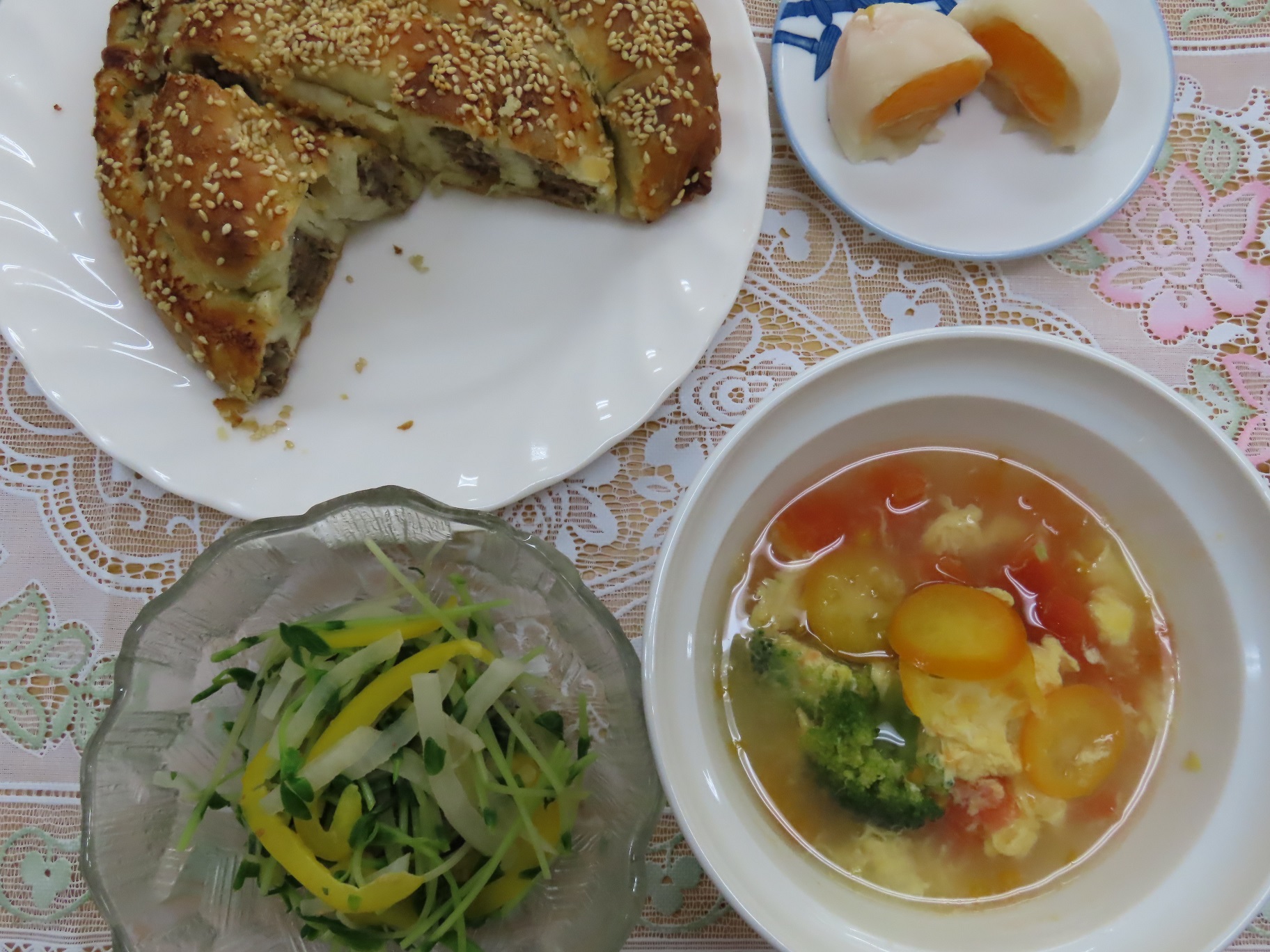 粉を使ったメインは ・渦巻ミートパイ(アチマ) 消化を高め、元気にします ・きんかんのスープ 気の巡りをよくし、ココロの緊張をほぐします ・豆苗のサラダ 胃腸を温め消化力を高め整えます 粉をこねて作るデザート ・みかん大福 身体を温め、元気を補います ・シナモンほうじ茶 身体を温めます 今日の講師は「薬膳師の渋谷先生」 薬膳の効能を取り入れた献立です