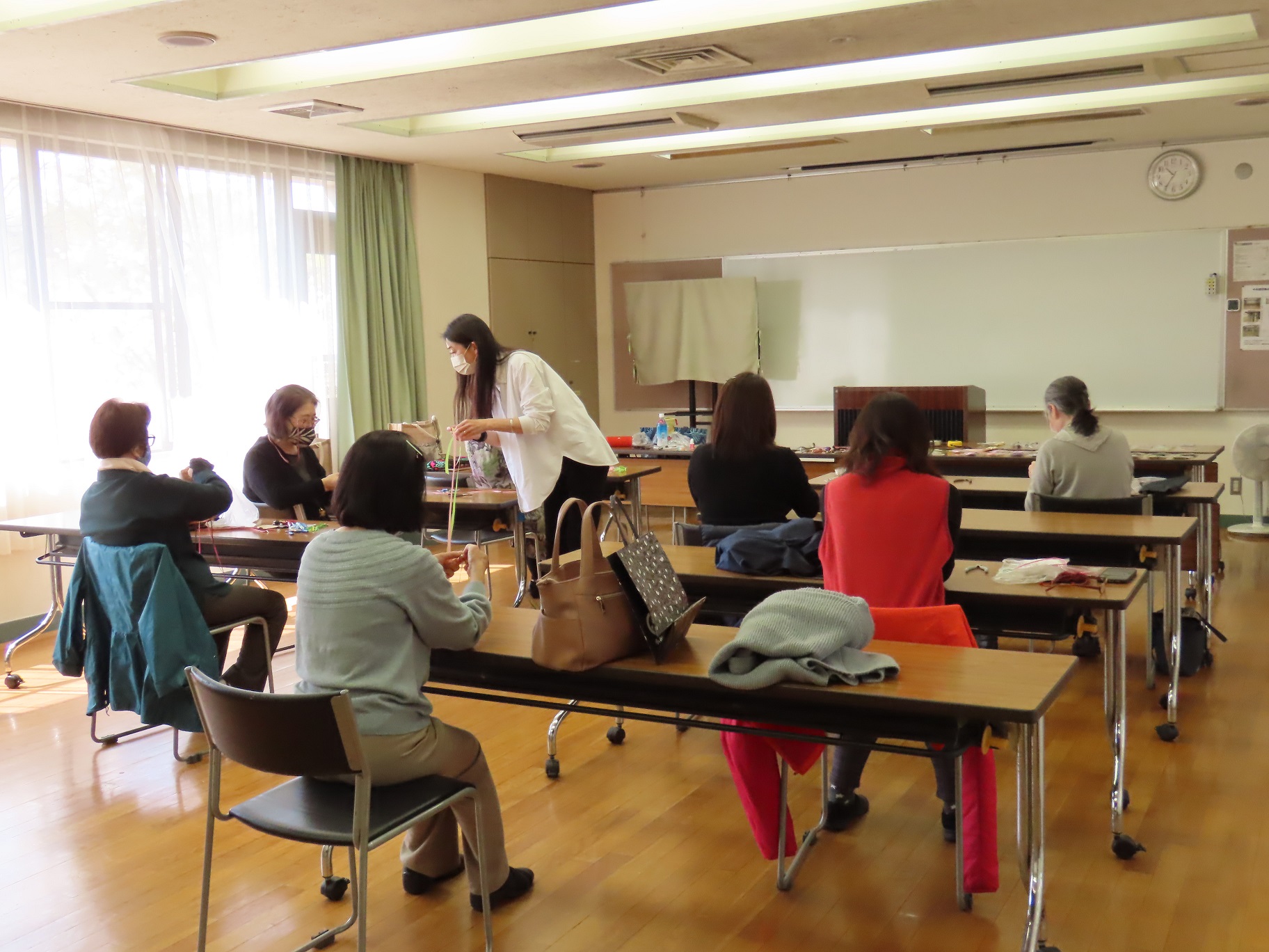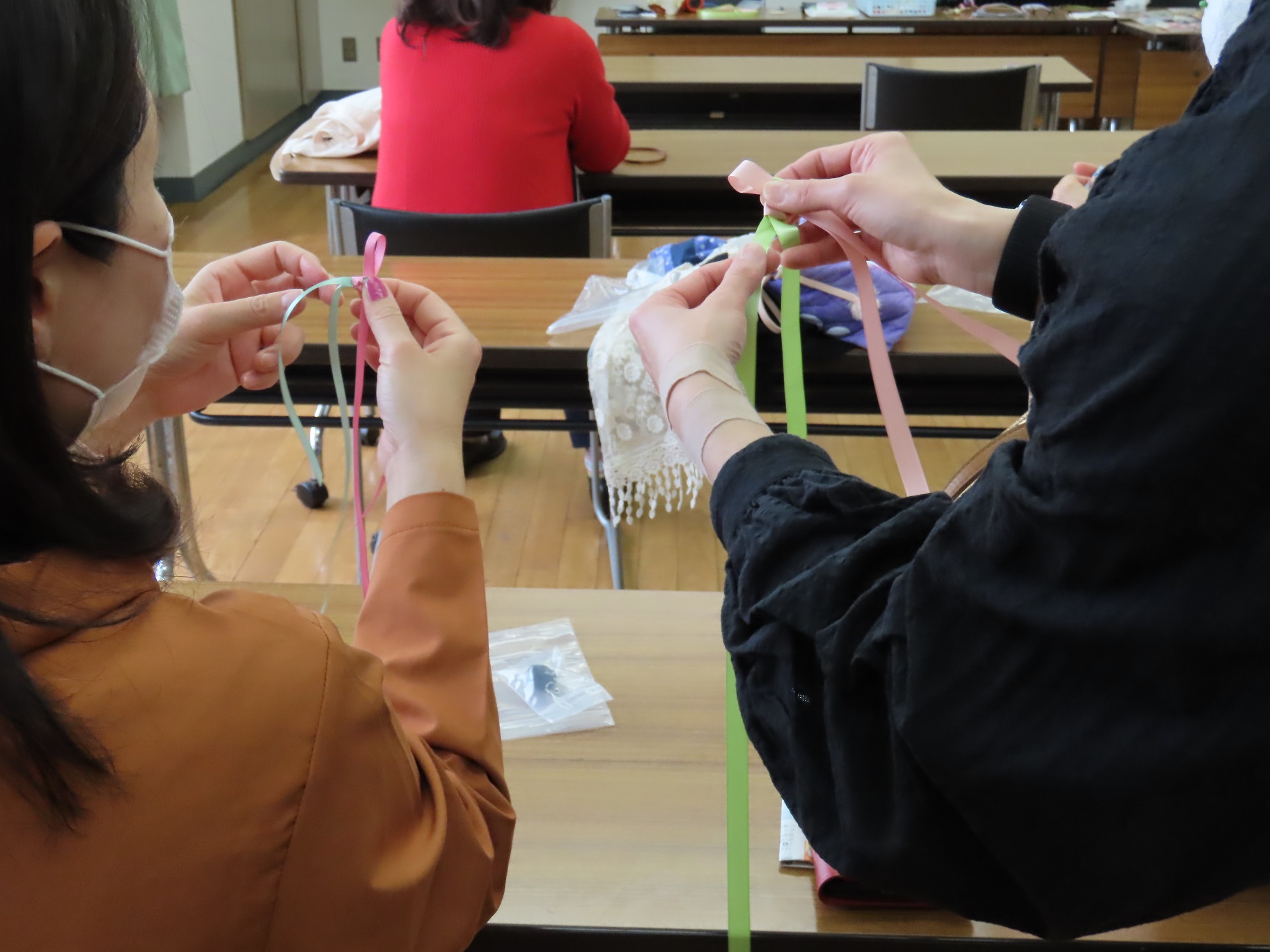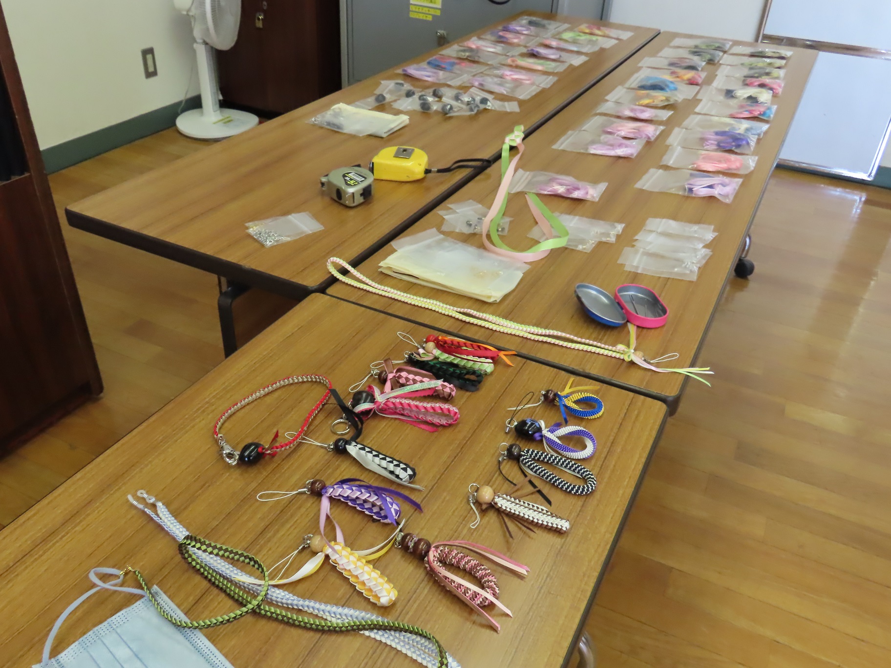 あると便利なストラップを作りました。 初回は太めのリボンで 基本の編み方をマスター キィーホルダーストラップを 編み方を覚えたら細いリボンで マスクや眼鏡のストラップにチャレンジ 先生が用意してくださった 色とりどりのキットを求めて お家で沢山作られた方も ご自分用・ご家族用 プレゼントにも喜ばれます
