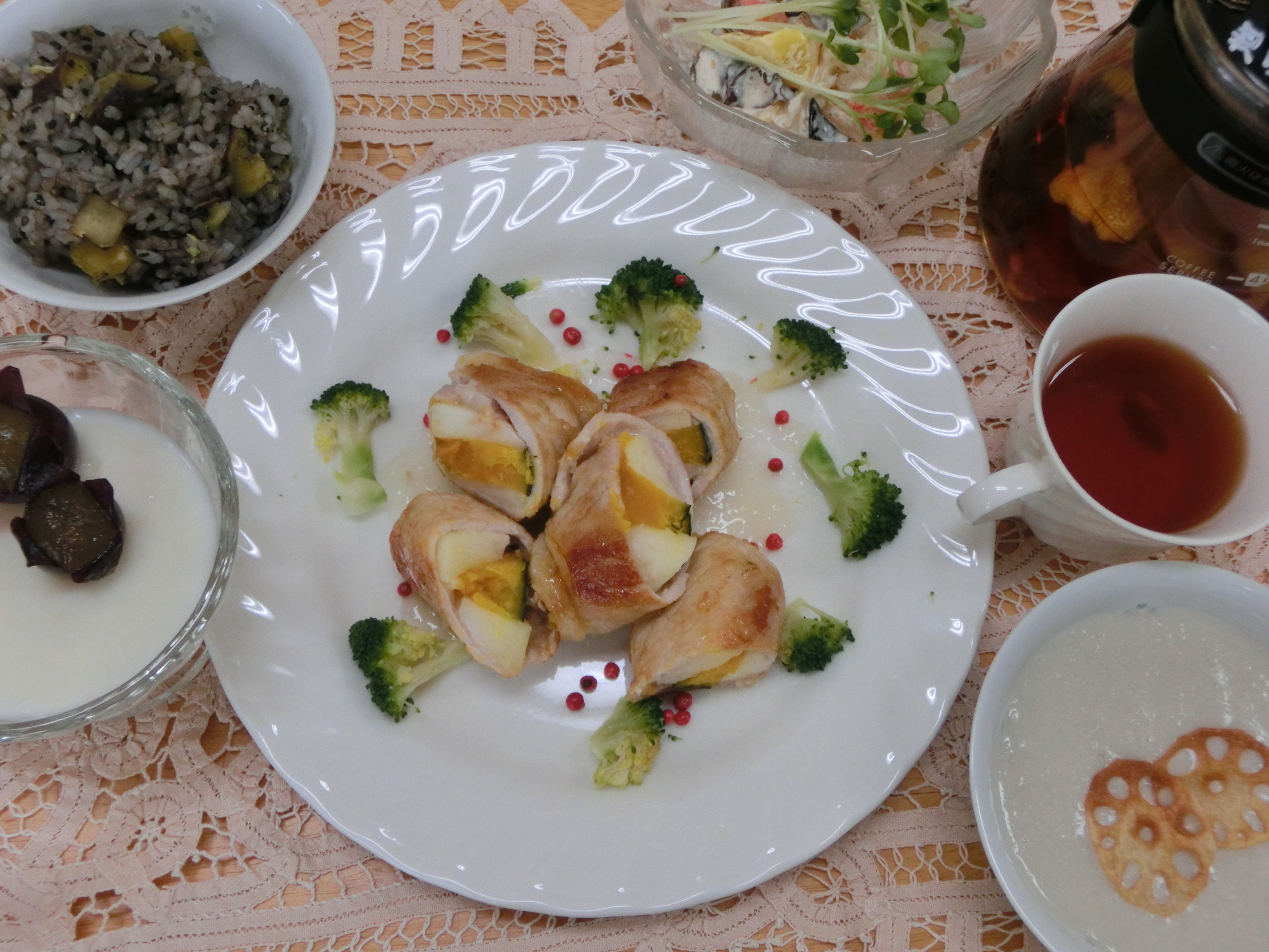 サツマ芋ご飯 豚肉の林檎風味 双茸とパプリカの胡麻ソース デザート + 蓮根のポタージュ 秋を感じる食材で 実りの秋を実感 見てよし 食べてよし