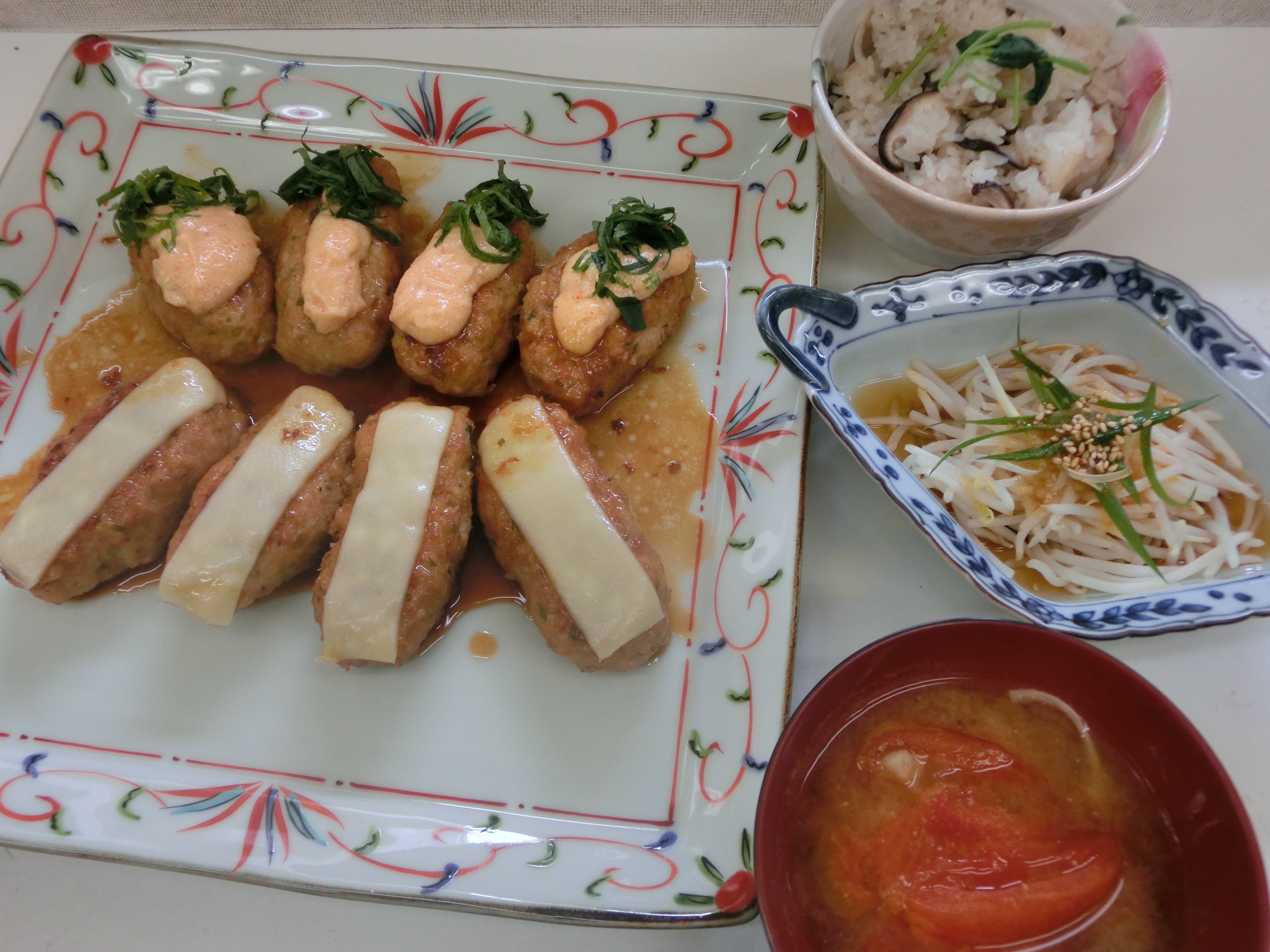 つくね2種 きのこの炊き込みご飯 もやし葱 トマトの味噌汁 ハロウィンかぼちゃクッキー の5品を作りました