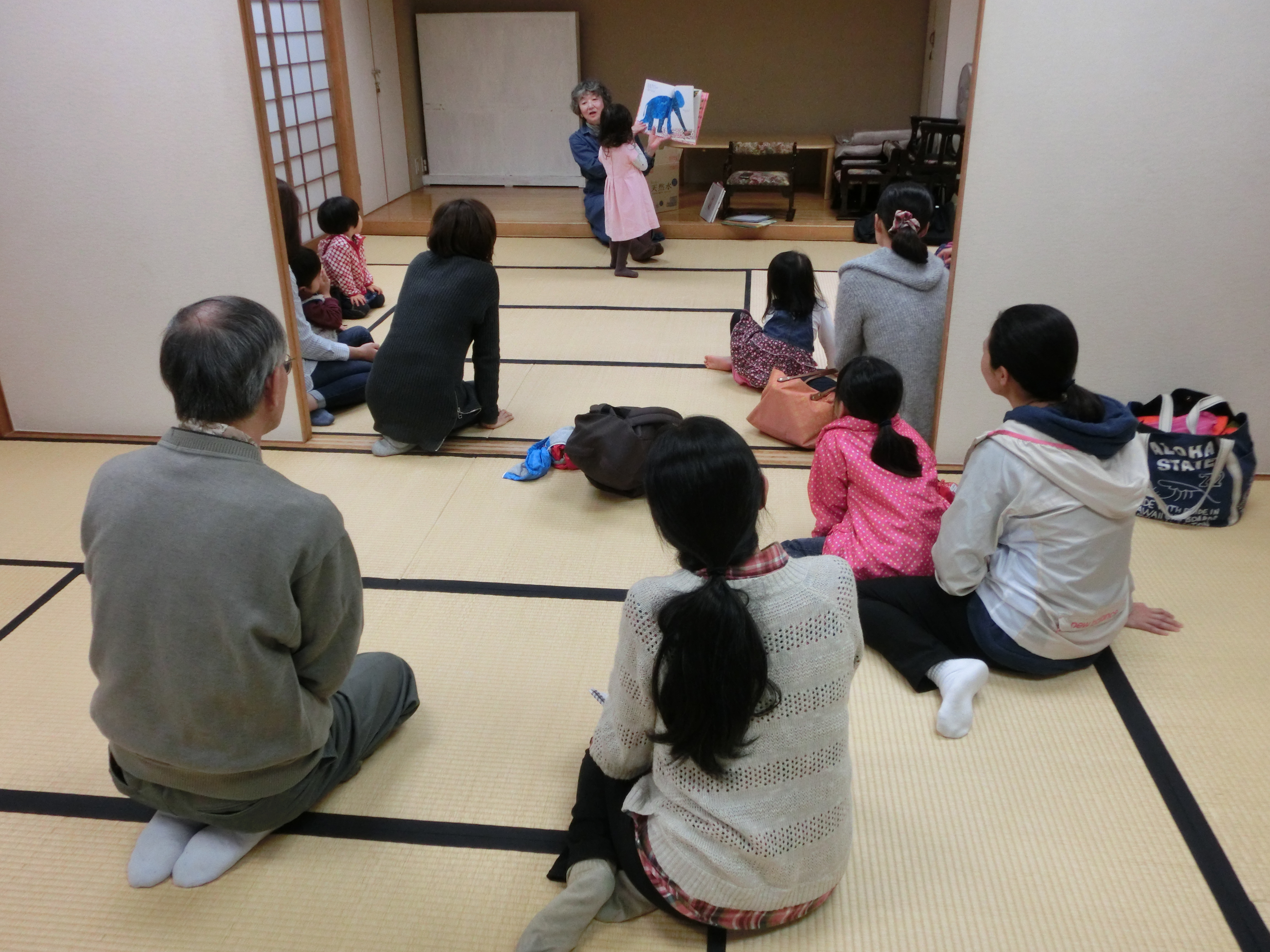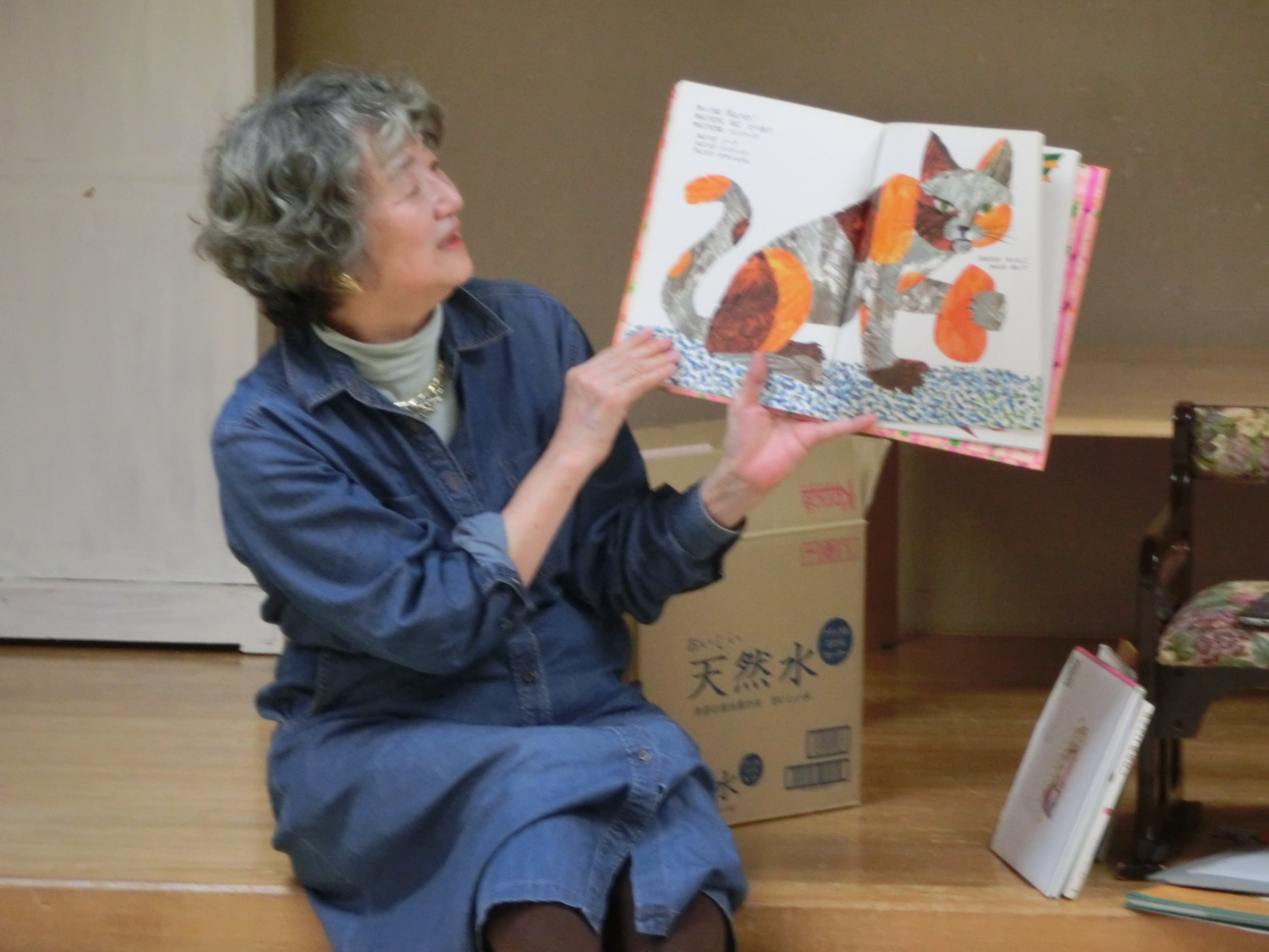 絵本の紹介と読み聞かせ 今月のテーマは 「おいしいもの」 次から次へと おしいものが絵本の中から 登場します 「え~ハンバーグの色と違うよ~」 なんて声も聞こえたり・・・