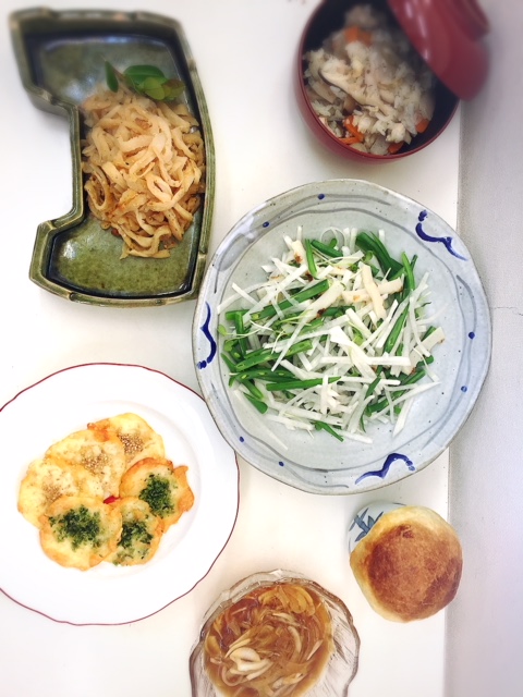 かやくご飯 切り干し大根味噌味 竹輪といんげんのサラダ パイスープ チーズチップス の5品を作りました 切り干し大根味噌味は 常備菜として覚えておくと 便利な一品 お弁当にもお勧めです