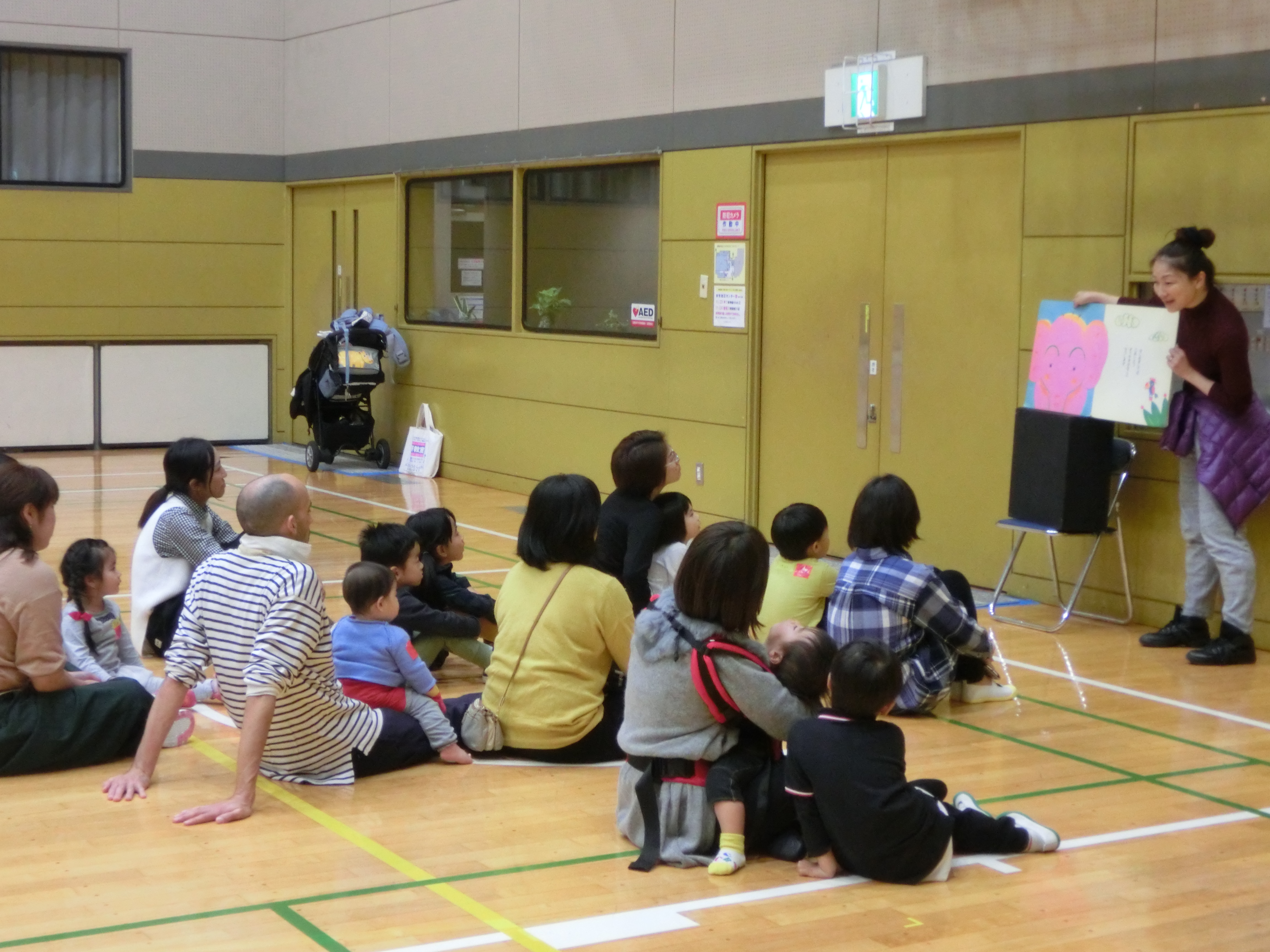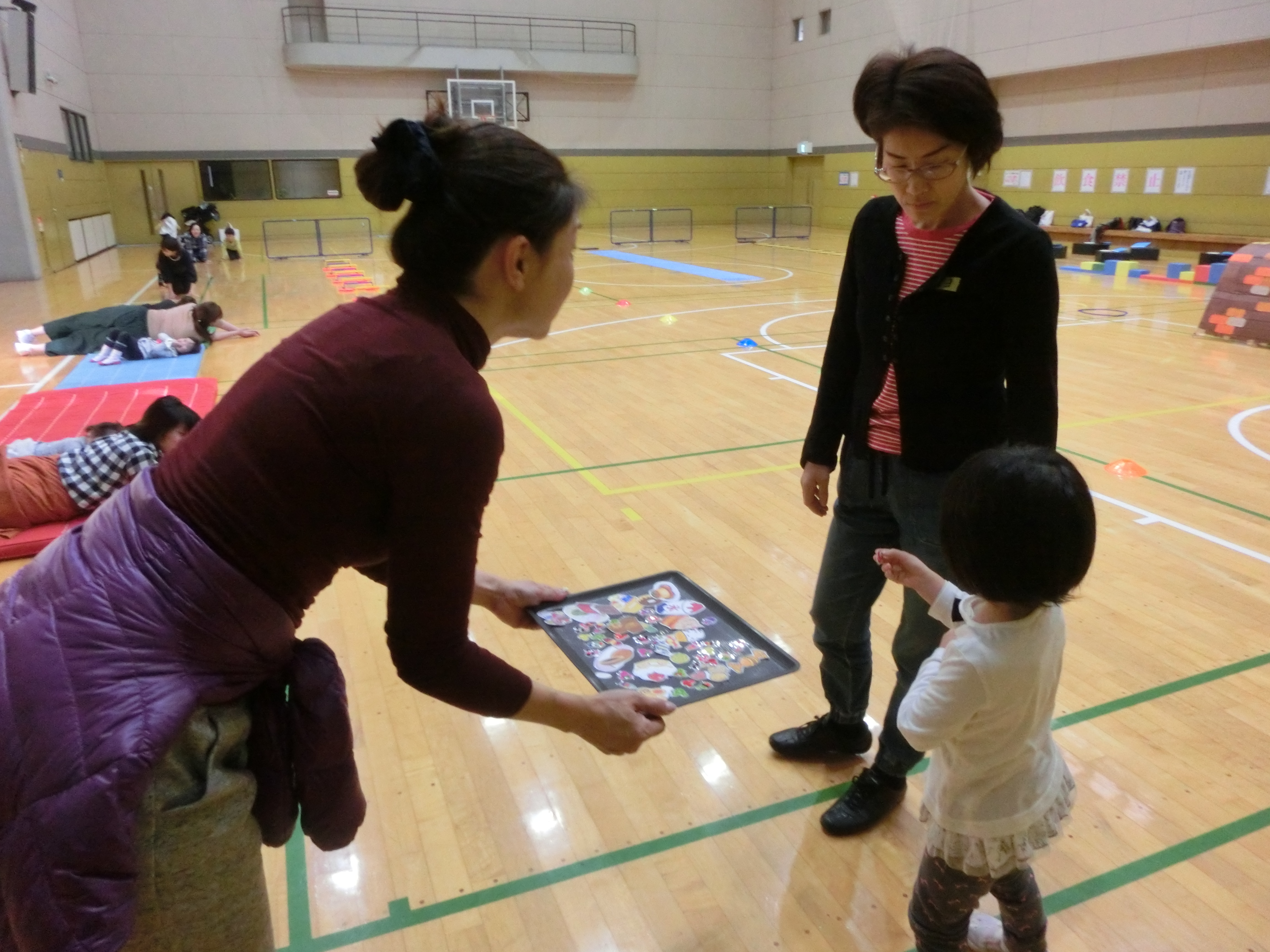 大型絵本の「はじめまして」 の読み聞かせの後に 準備体操をして スタートです 冒険しながら絵本作りにチャレンジ トンネルを抜けて ぐるぐるマットを回転して 広い体育館が狭く感じられる元気さで 絵本のパーツをGet 果物や動物・車・・・ 色んなシールを集めて貼って ストーリーは思いのまま・・・