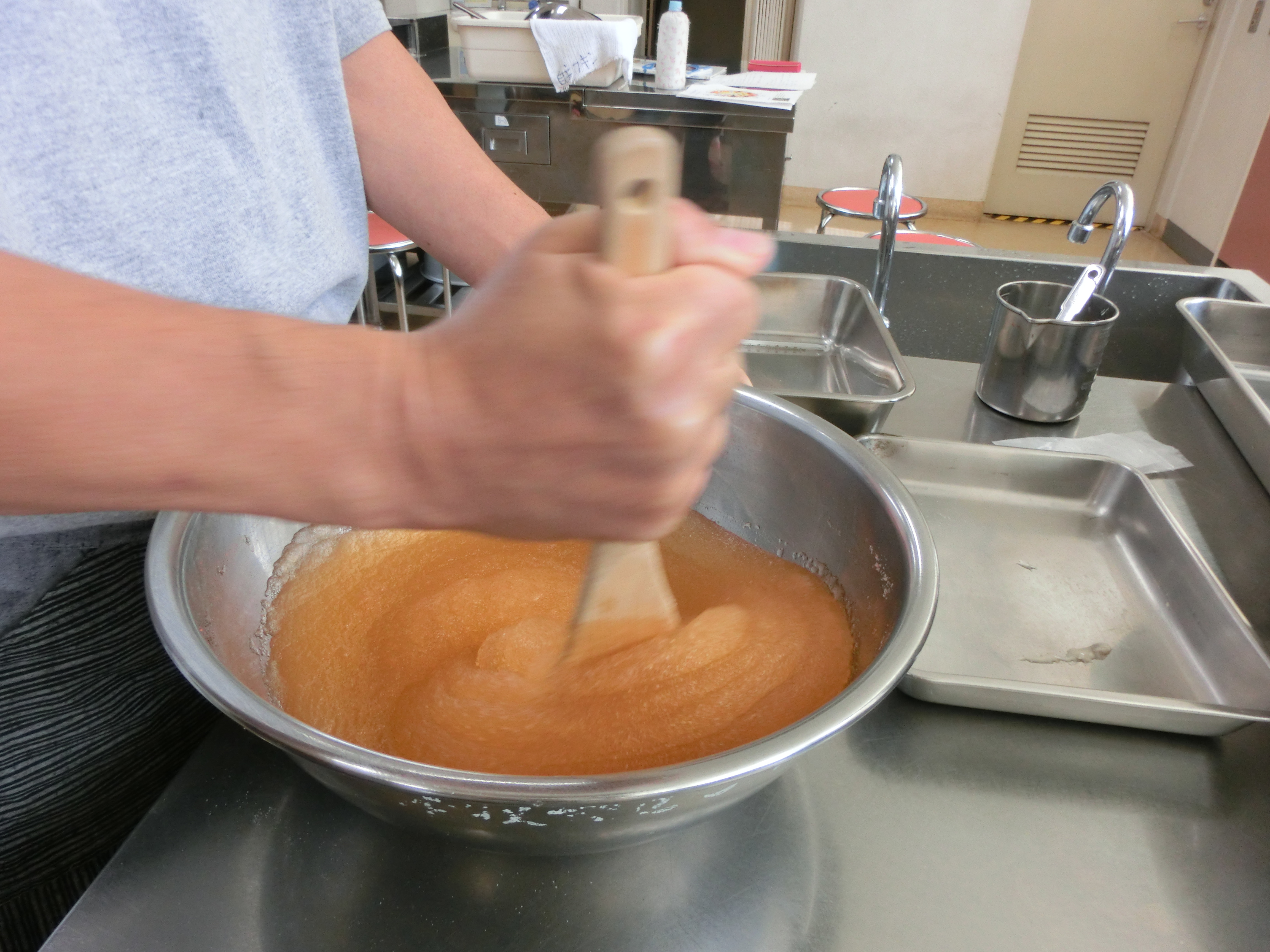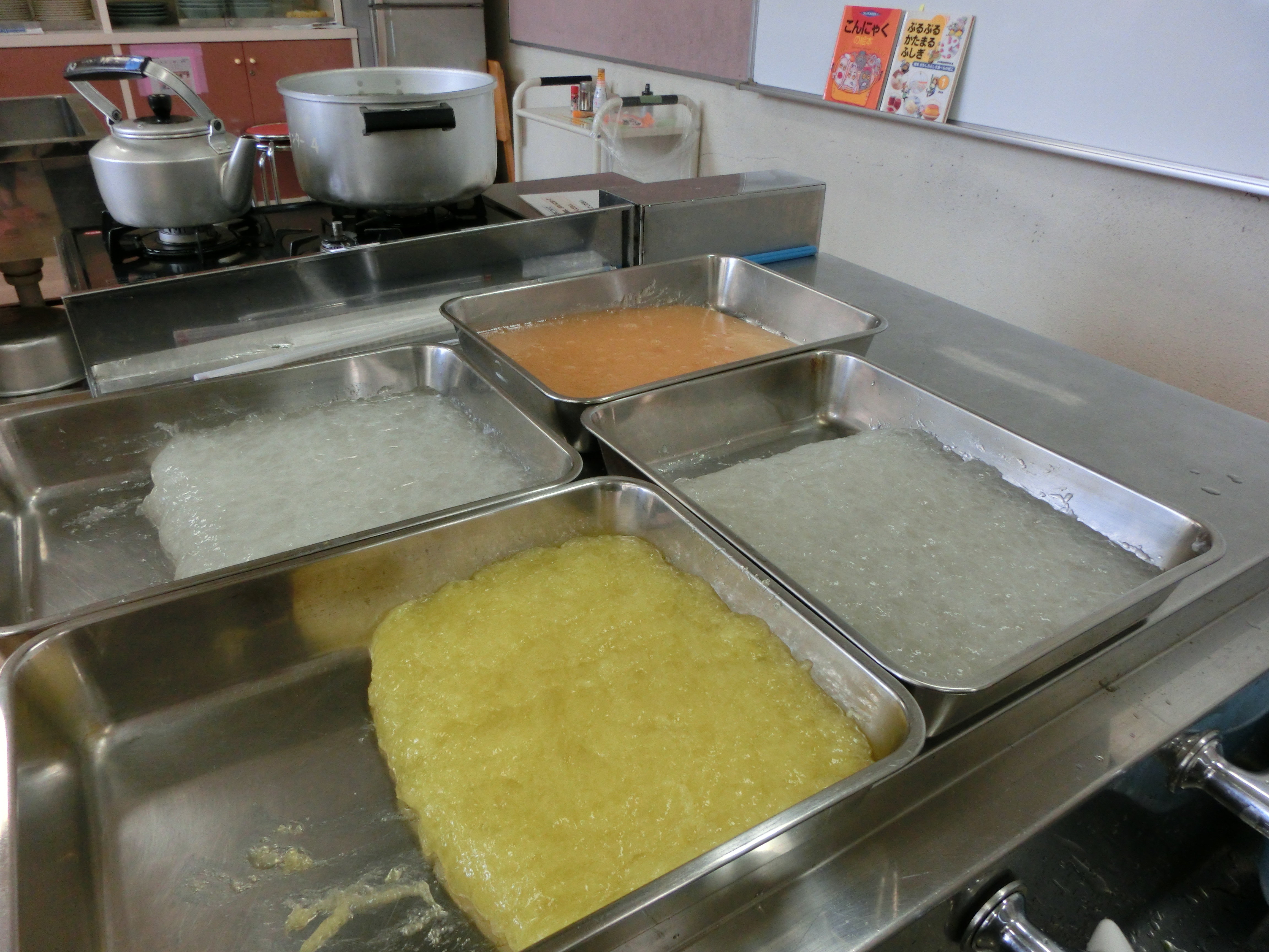 まずは講義から こんにゃく粉で作ります 柚子や七味を入れて 風味豊かに 水加減やゼラチンを加えると プルプルの刺身こんにゃく なんと こんにゃくゼリーのデザートも 市販のこんにゃくとは 一味も二味も違います