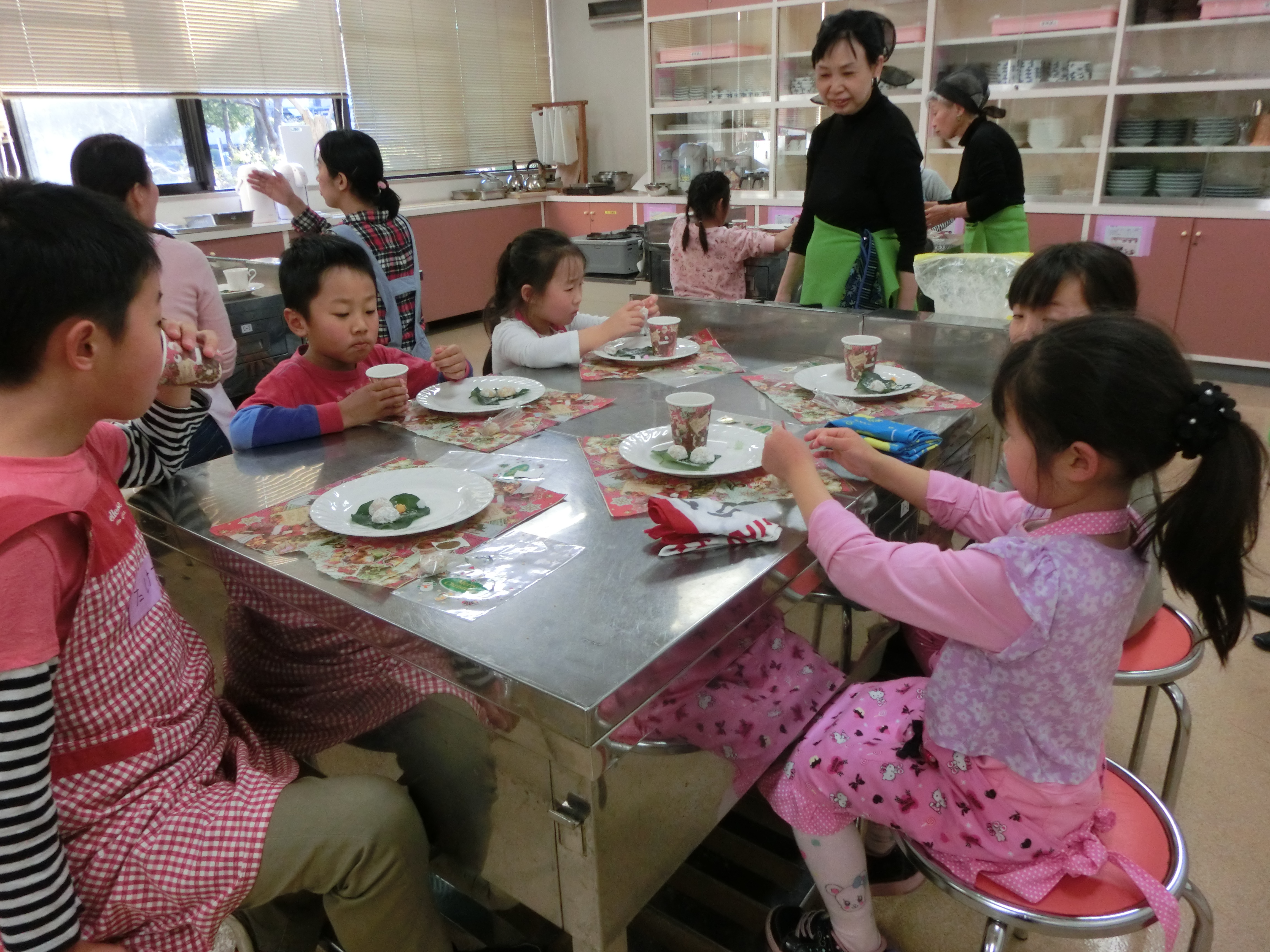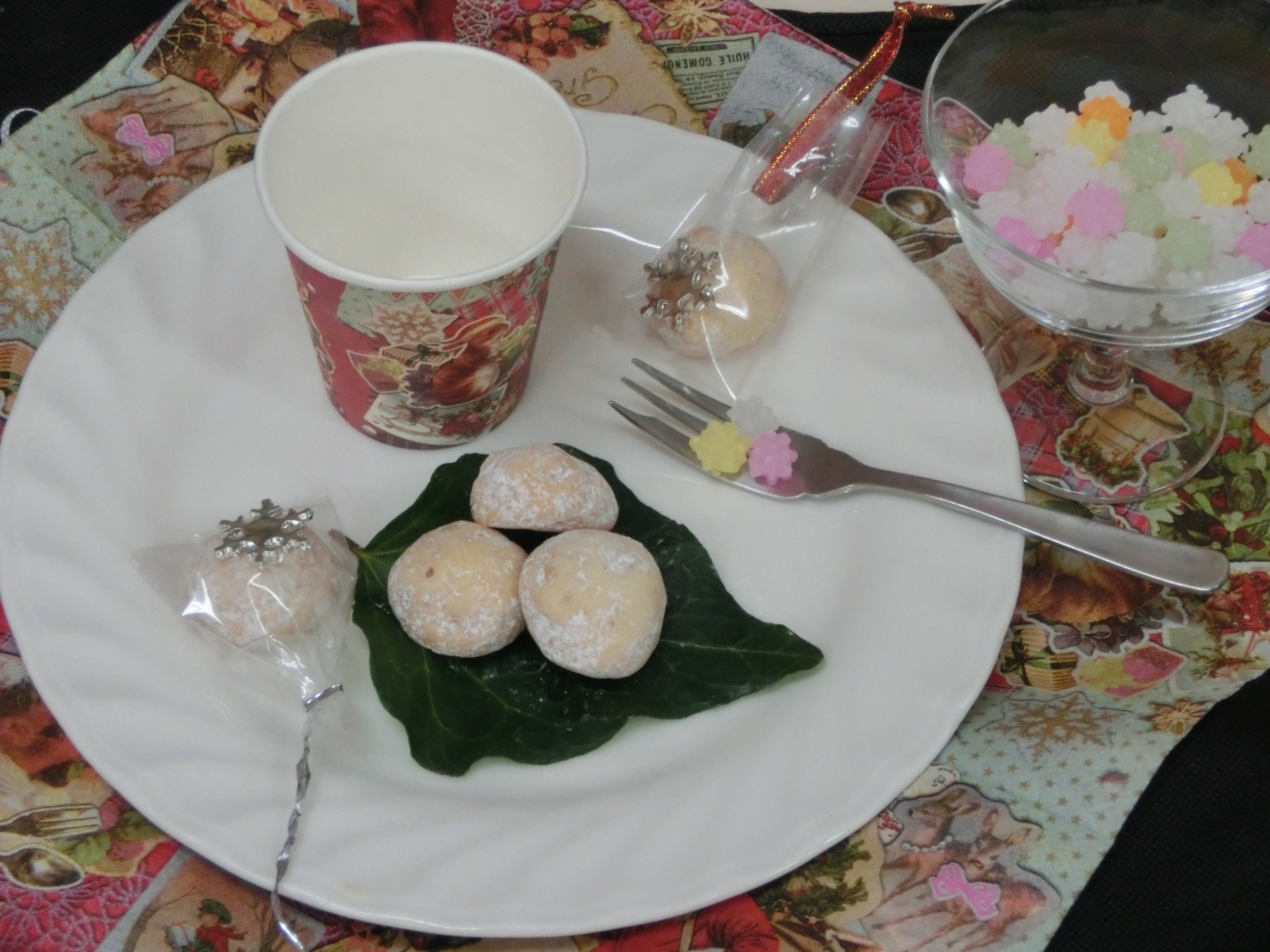 材料を混ぜてこねこね ま~るく丸めて・・・焼いて、冷やして、粉砂糖でお化粧して・・・ 完成したクッキーを 先生のコーディネートで一段と素敵に・・・ みんなで一足早いクリスマスを味わいました。