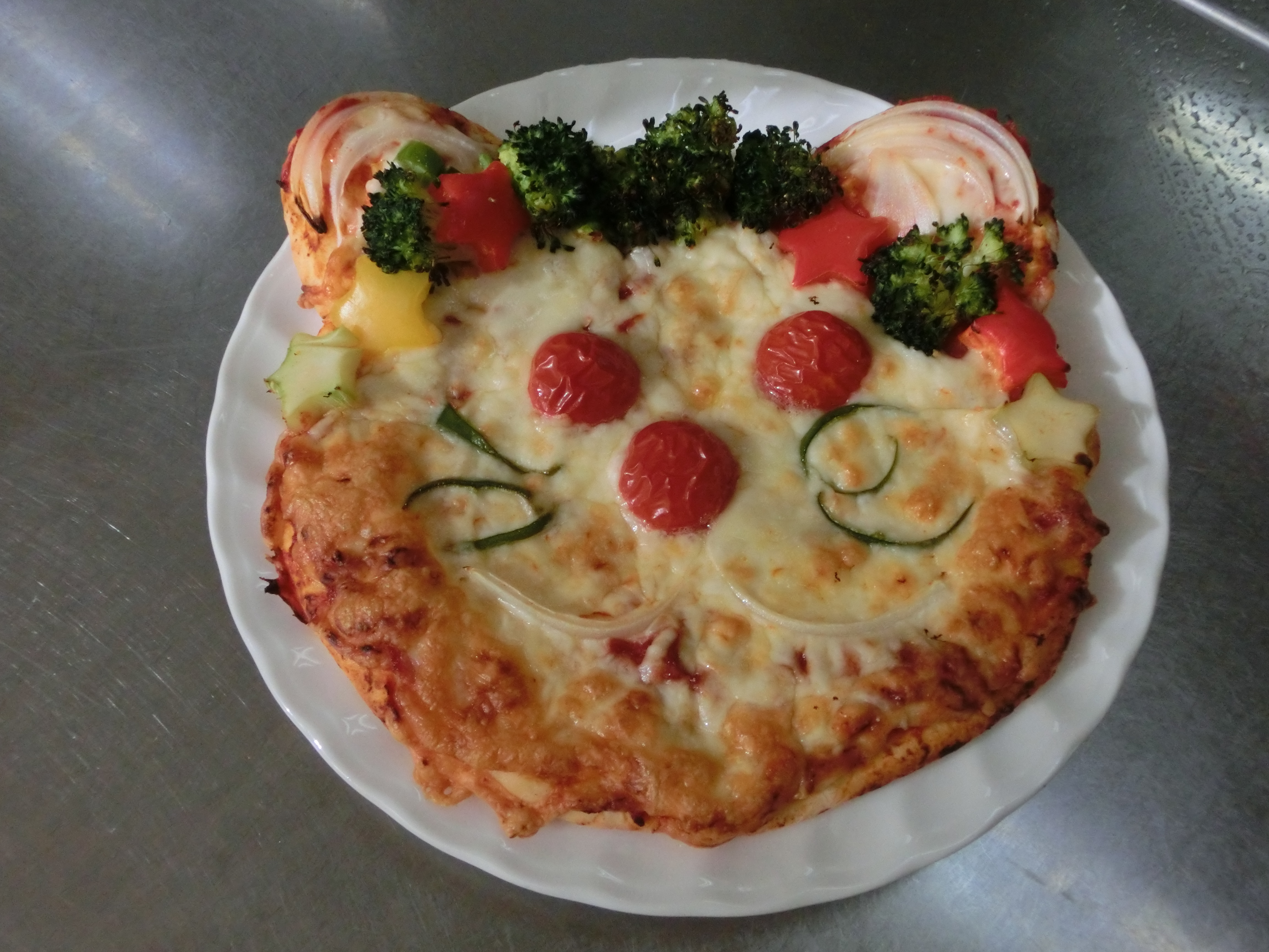 中区ヘルスメイトの協力で実施 分量を合わせてこねて 発酵させて トマトソースもデザートのキャロットゼリーも ヘルスメイト皆さんの手作り リースの形にしたり ペットの形にしたり 思い思いのクリスマスピザが 美味しく焼きあがりました