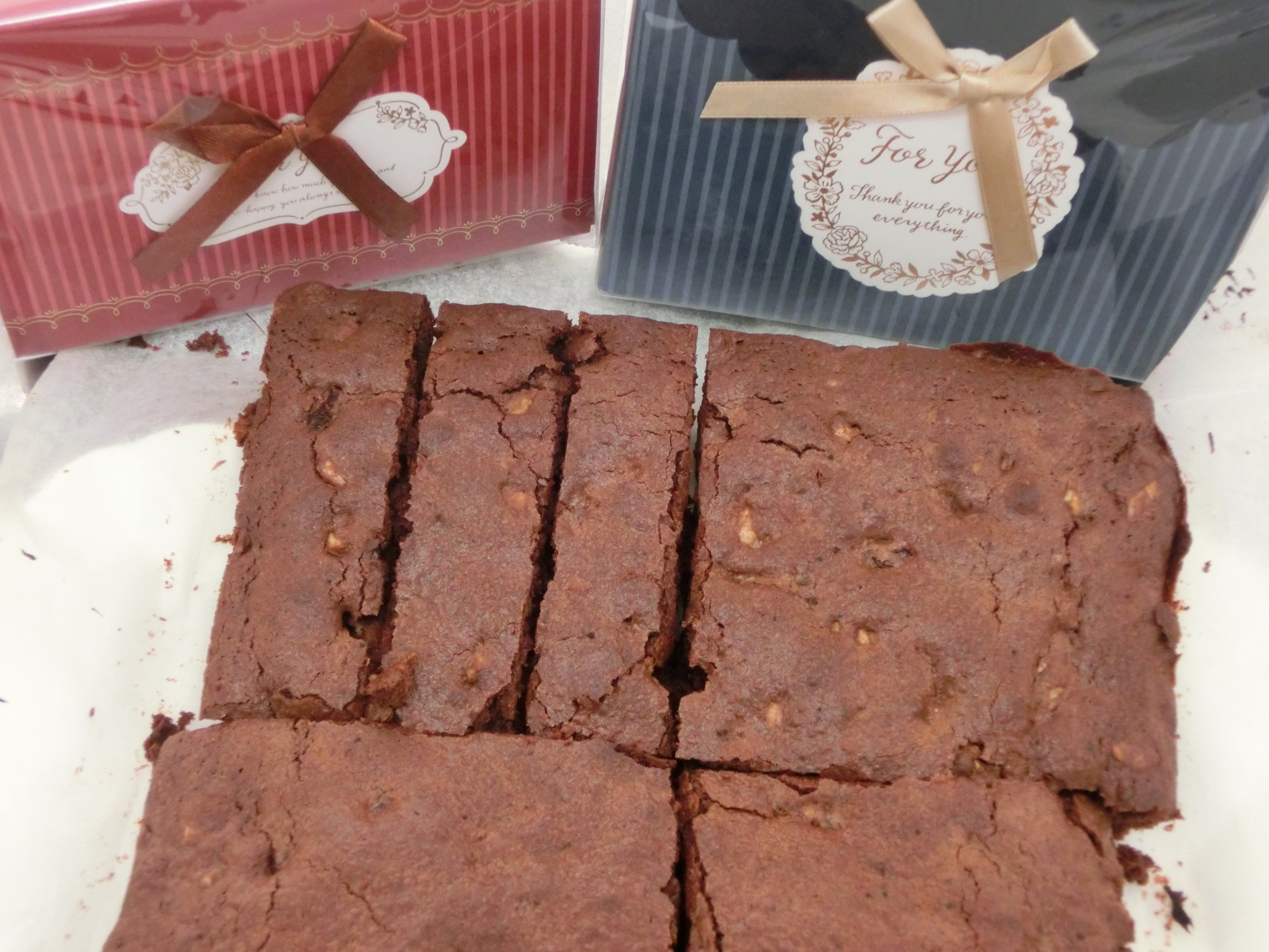 チョコレート・ナッツをたっぶり使って 焼き上げた チョコレートケーキ 焼き上がりの温かいままでも 冷めてしっとりしても美味しいチョコレートケーキです 先生からパーケージの紹介もあり プレゼントは誰に? お母さん!! ホント~? 完成後のティータイムも和やかに