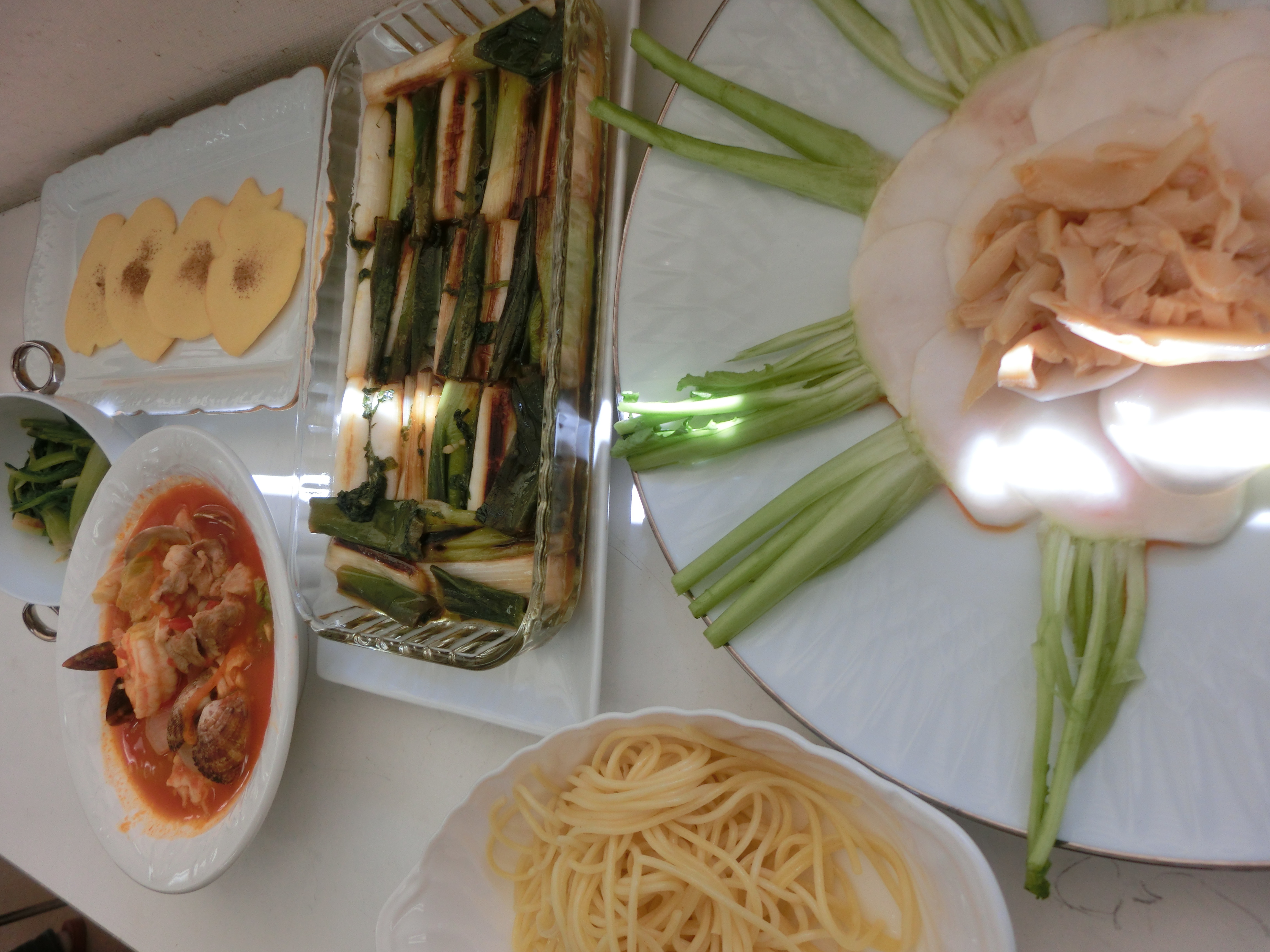 変わり鍋→イタリア鍋 トマトベースの野菜たっぷり ・お肉・魚介も入り さらにパスタを添えてボリューム満点 「蕪」使いッきり サラダ&もう一品 ・生の蕪(実と茎)をピリ辛メンマでサラダ ・葉を使ってピーナツバター和え 和風デザートは風味煎餅 プラスもう一品 焼きネギのマリネ 簡単なのに絶品!!
