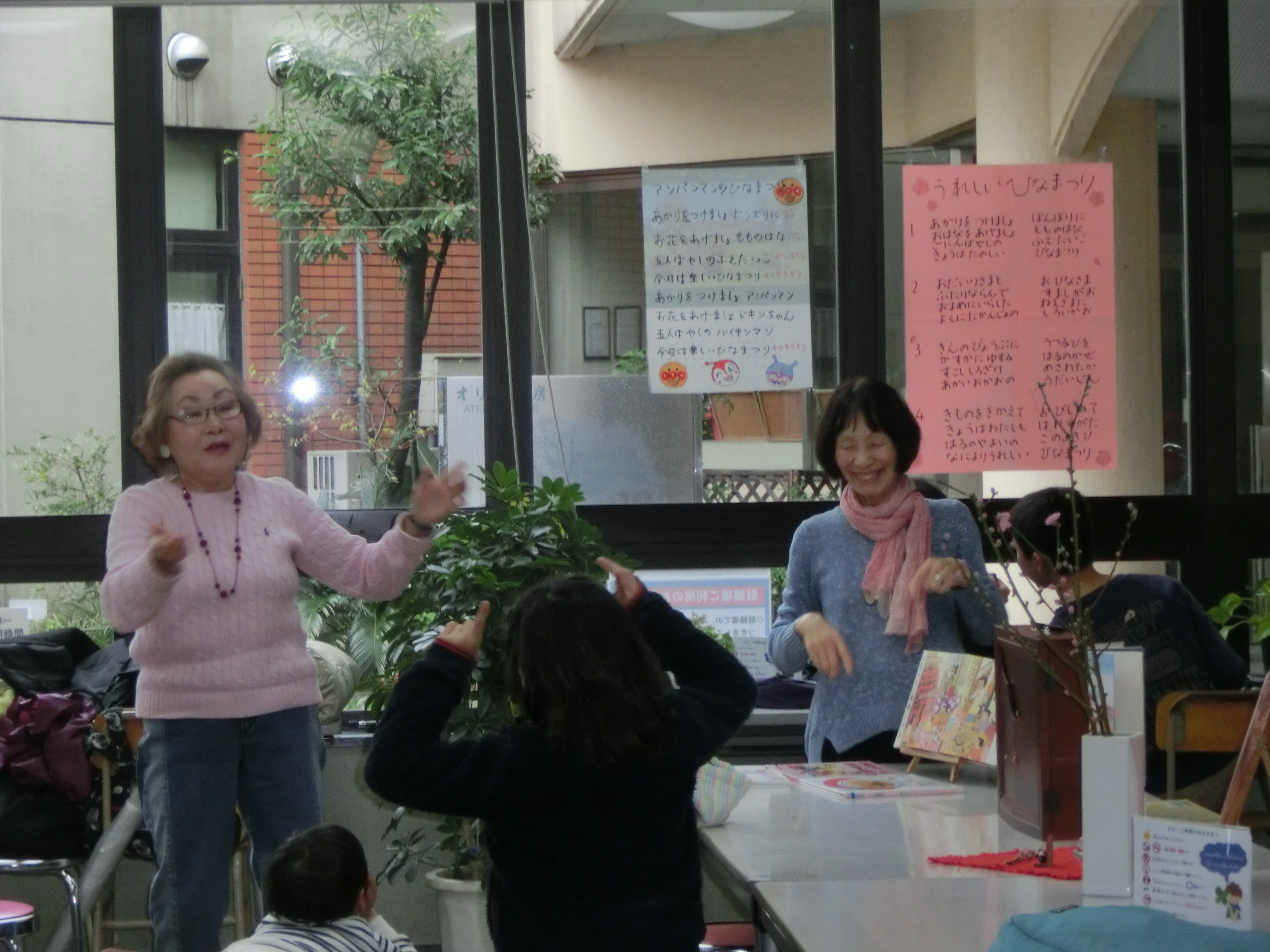 ♪あかりをつけましょ ぼんぼりに~ ひな祭りに因んだ 絵本の読み聞かせや手遊び ショーケースのお人形さんも嬉しそう