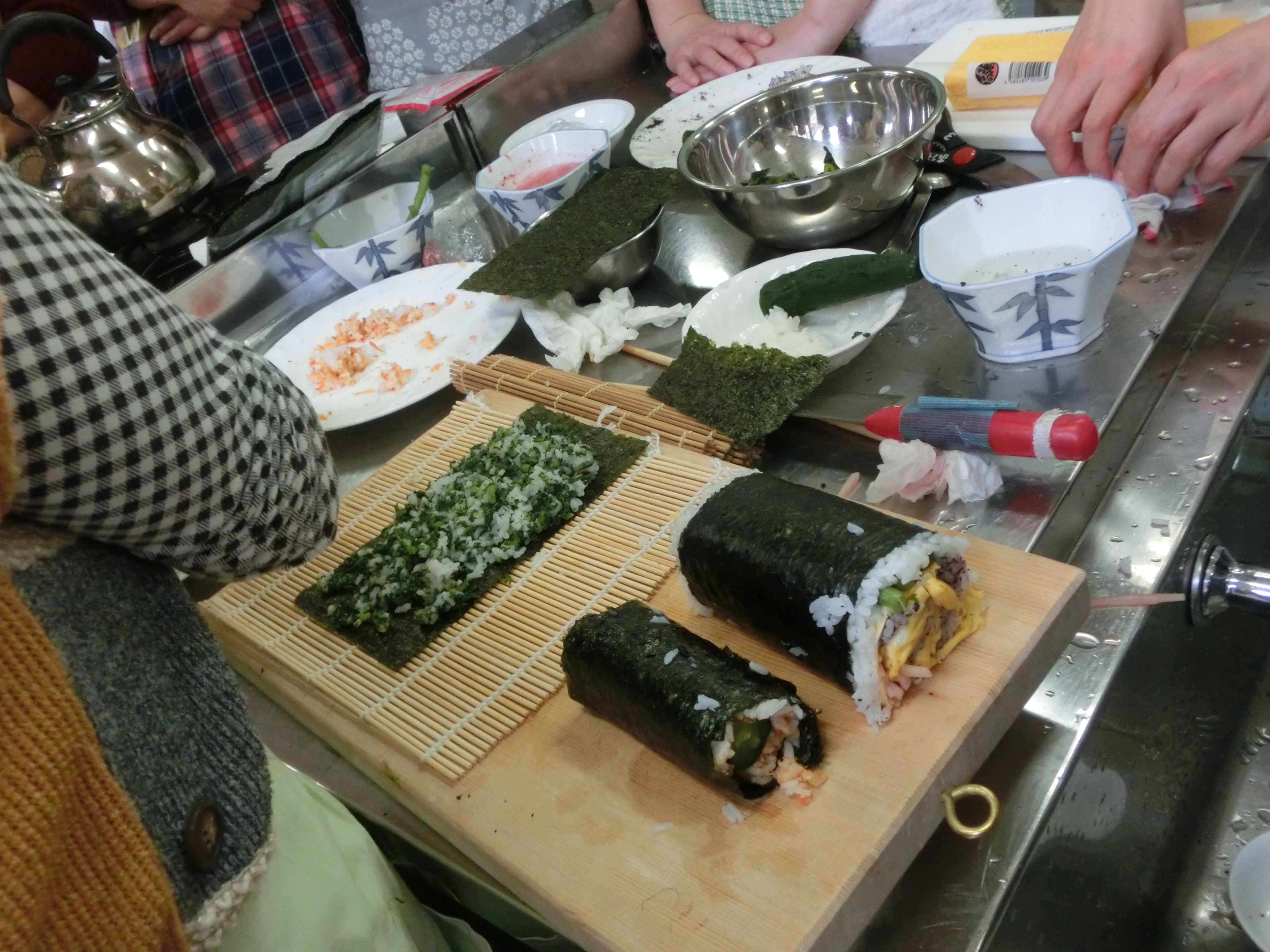 二十四節気 季節を感じるよりどころ 〈暮らしの目印〉 飾り寿司 ・バラの花 ・四海巻き 春野菜のサラダ あさりの沢煮椀 ヨモギ大福 桜花緑茶 を作りました
