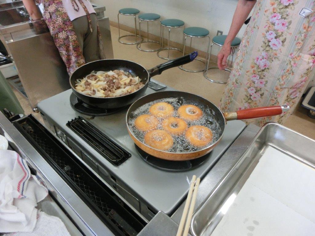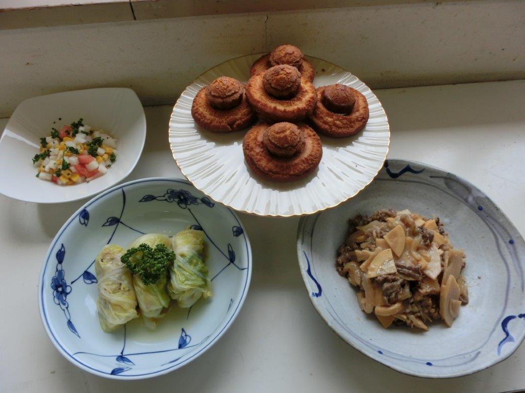 バターのコクとお味噌の出会い! 「筍と牛肉の味噌バター炒め」 ご飯がすすみます 「ロールキャベツ」 春キャベツの葉を一枚づつ剥すのは 手のかかる作業・・・ 「ドーナッツ」 少量の油でこんがりと揚げるのには お鍋のそばを離れないで・・・ 「ピリ辛コーンサラダ」 しゃきしゃきの白い山芋・ 黄色のコーン・パセリ・トマトで 色鮮やかな1品です
