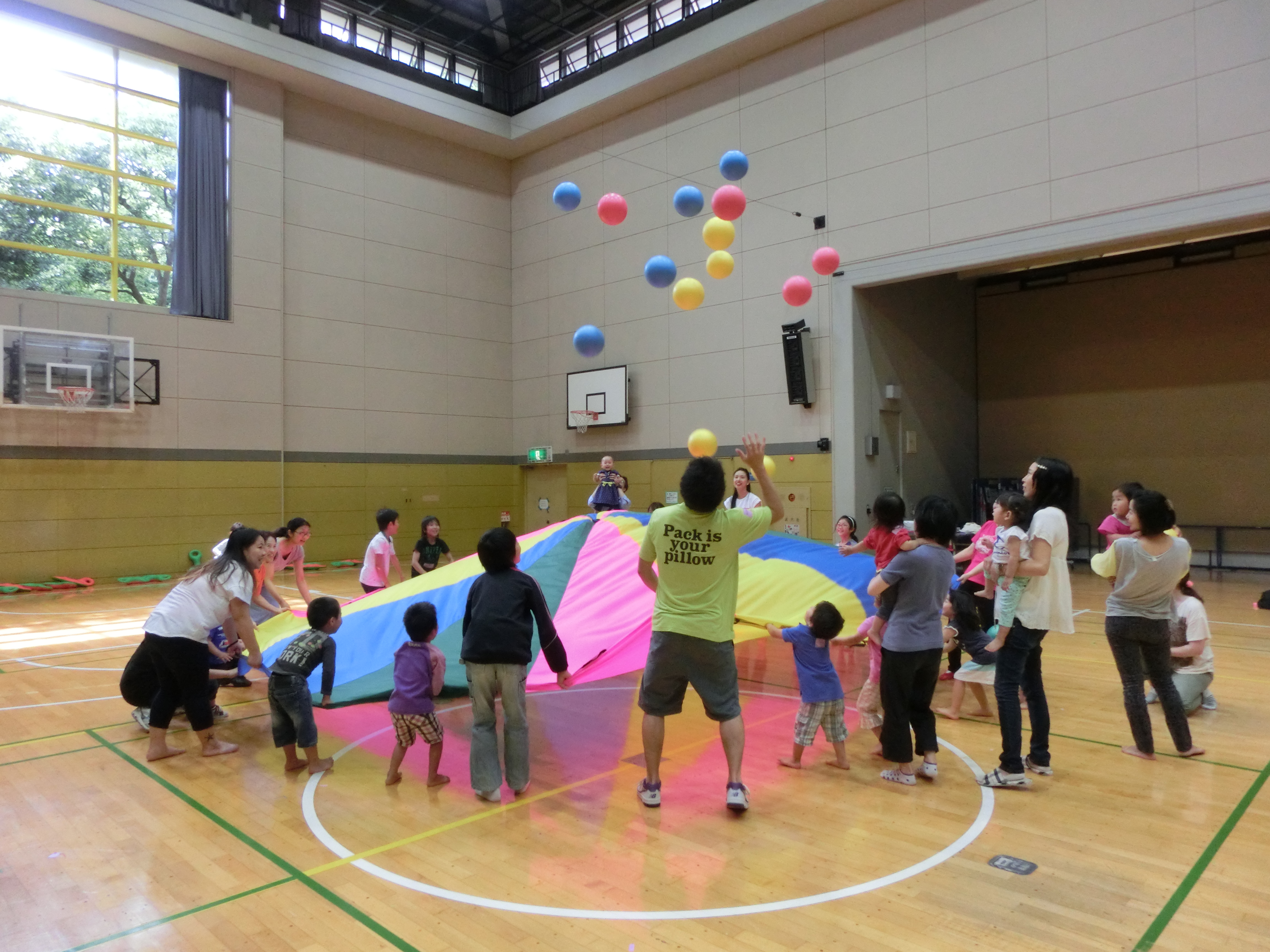 17組の親子さん・兄弟さんの参加 総勢46人でした ベルターに足を入れて ちょこちょこ歩き 大きなお兄ちゃんは 片足をいれてかけっこ ベルダーにひもを通し、掴んでパパやママに引っ張ってもらって バルーンでボールを弾ませた後は みんなで力を合わせて膨らませて・・・ あれれ・・・ みんなどこに行ちゃったの?