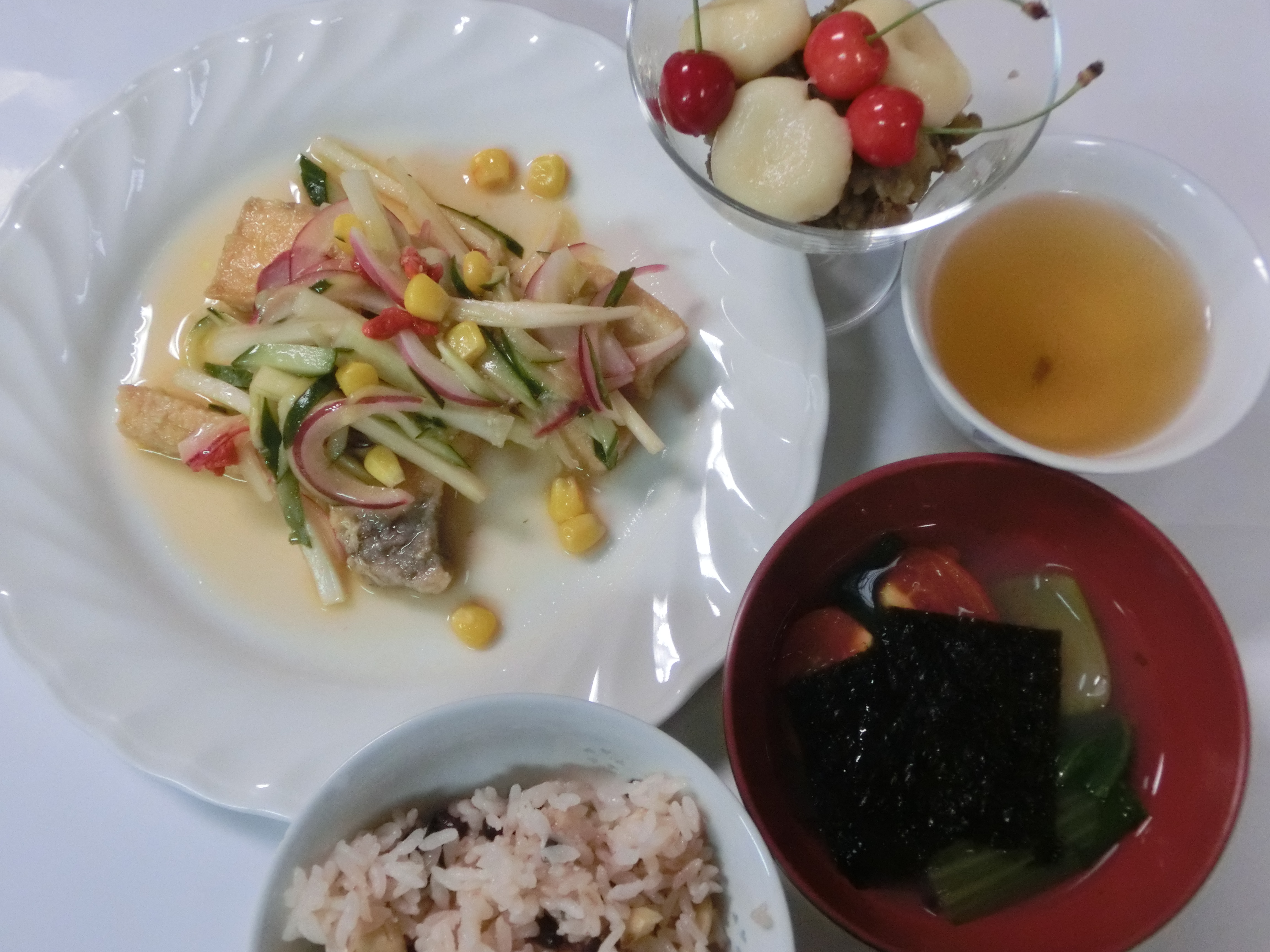 ・小豆・ハスの実ご飯 ・白身魚(かじきまぐろ)のマリネ ・緑豆ぜんざい ・トマト・青菜・海苔のスープ ・とうもろこし茶 を作りました 当日はまさしく「梅雨」入りしたかの様な雨 梅雨の時期は 大気に含まれる水分が身体の動きに影響し 身体がだるい・重い等の憂鬱な気分に なりやすい時期にです 身体にたまった水分や余分な熱を出し、盛夏に備えます