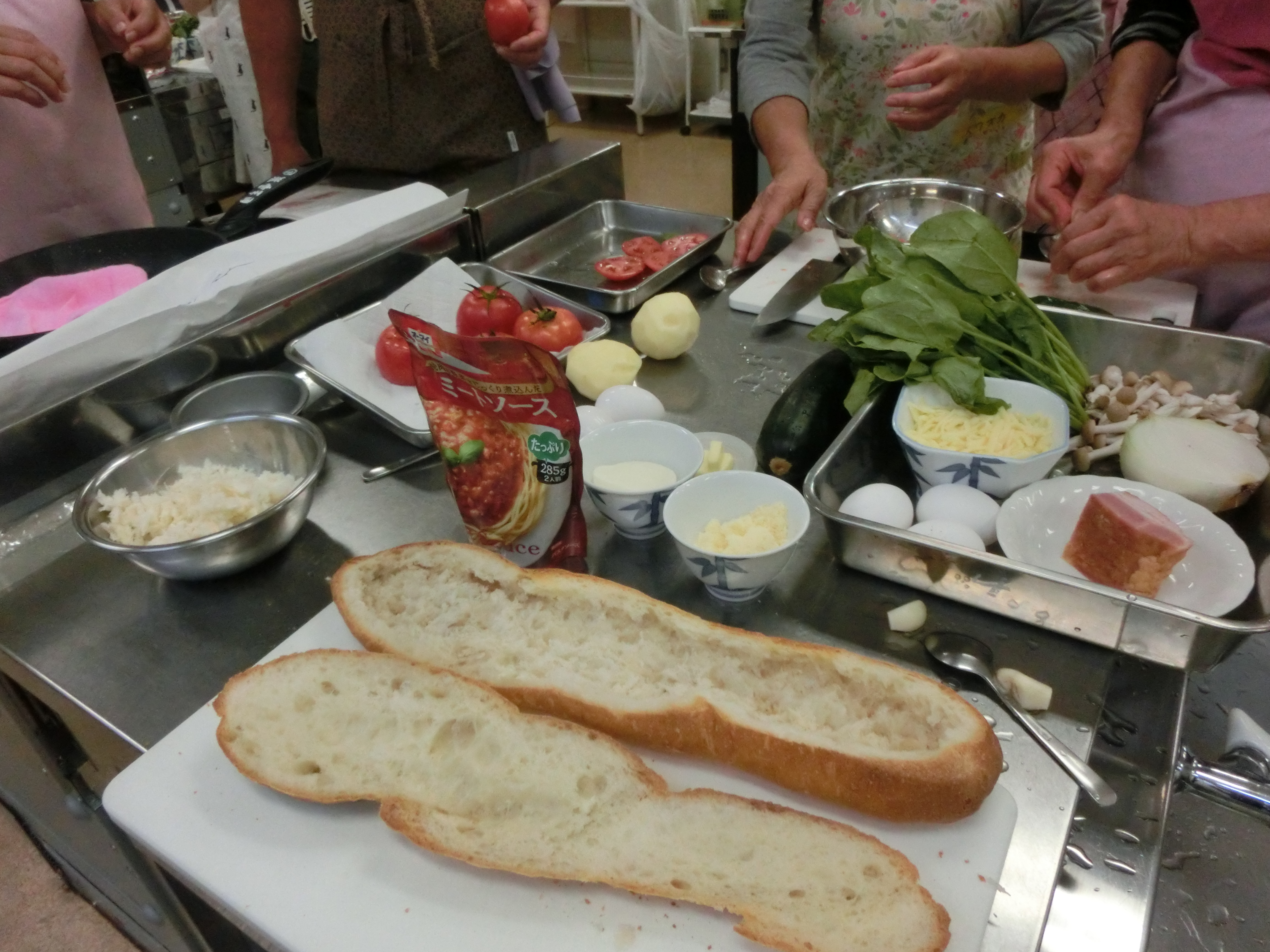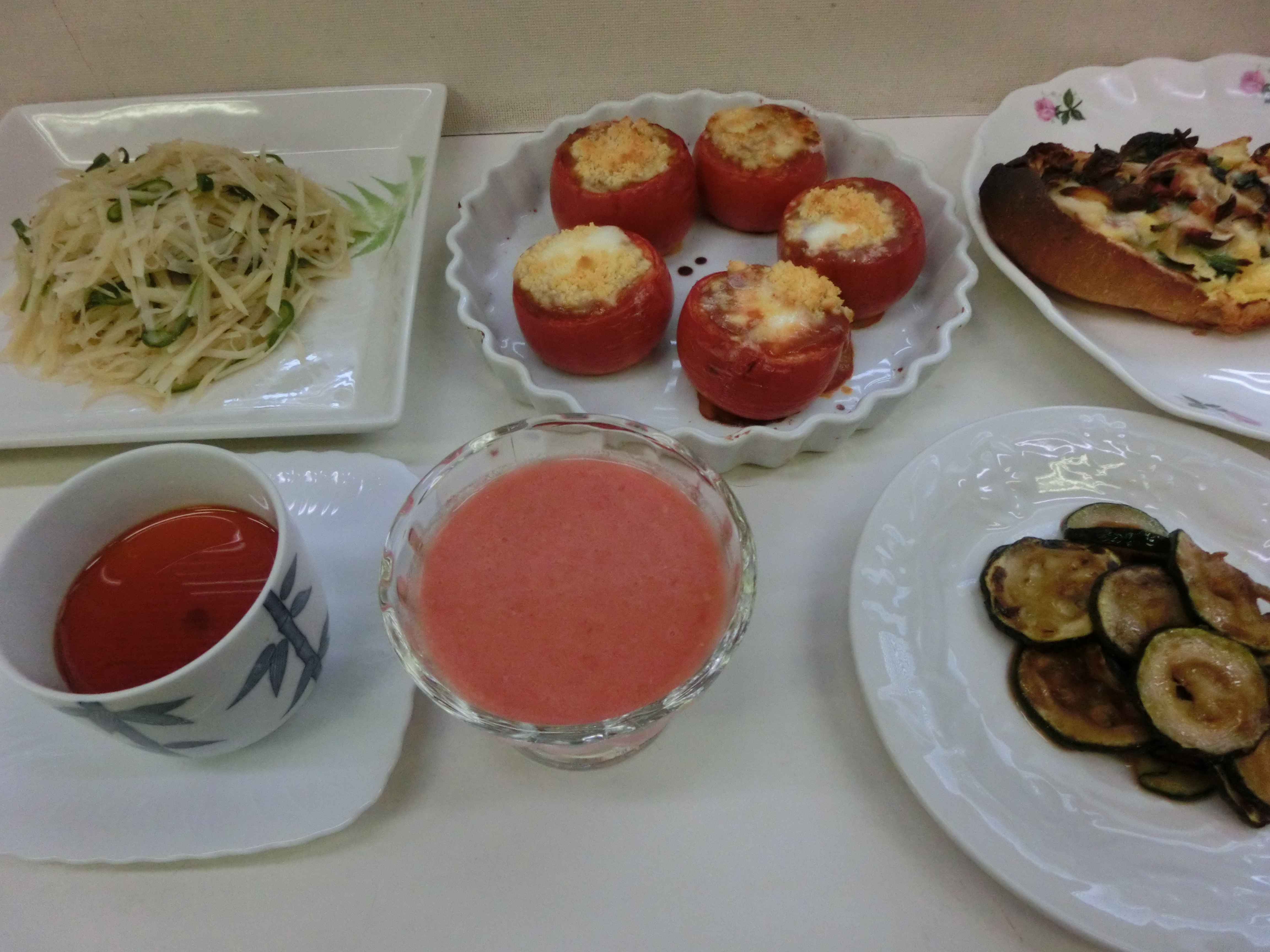 フランスパンを使ったキッシュは ボリューム満点 完熟トマトの詰め焼きも チーズと共にとろける美味しさ くり抜いたトマトの中身は 簡単ガスパッチョ (冷製スープ) プラス1品 計6品の豪華版メニューです